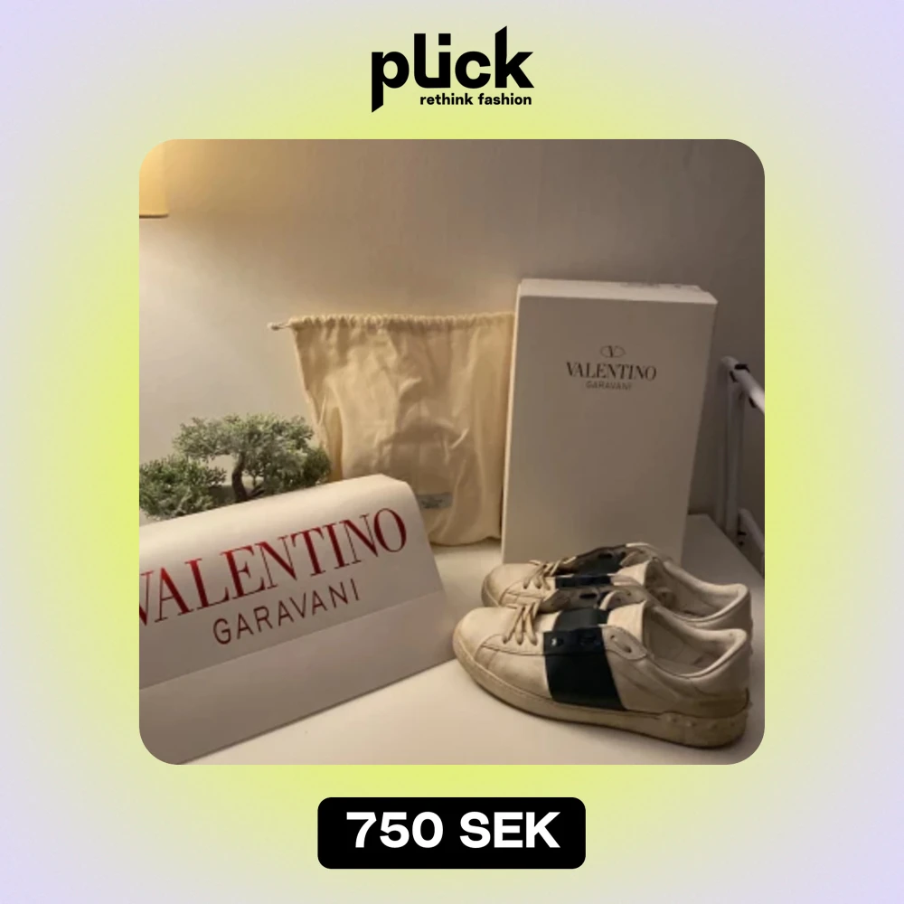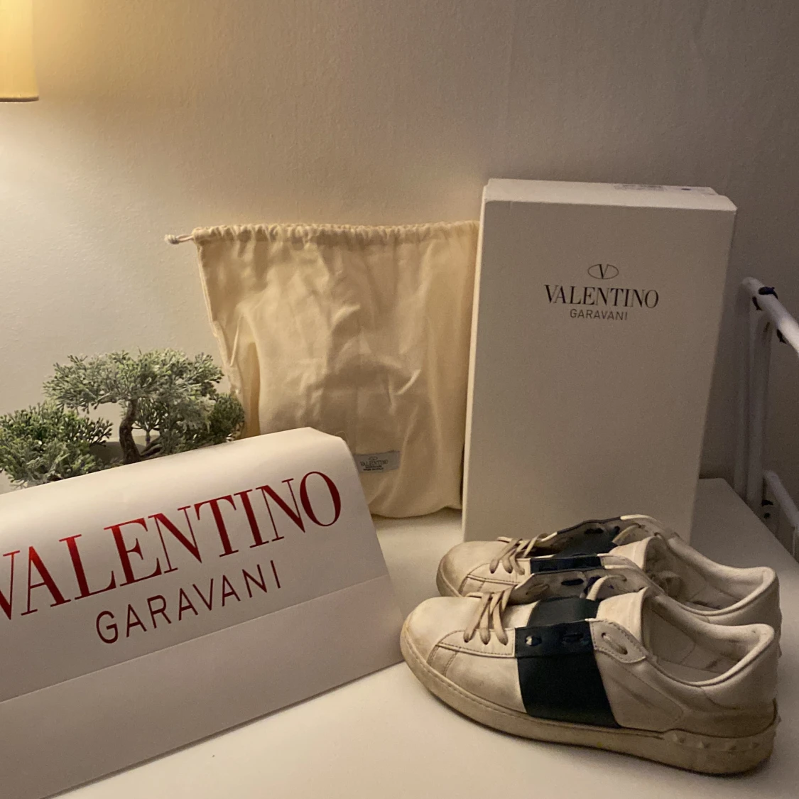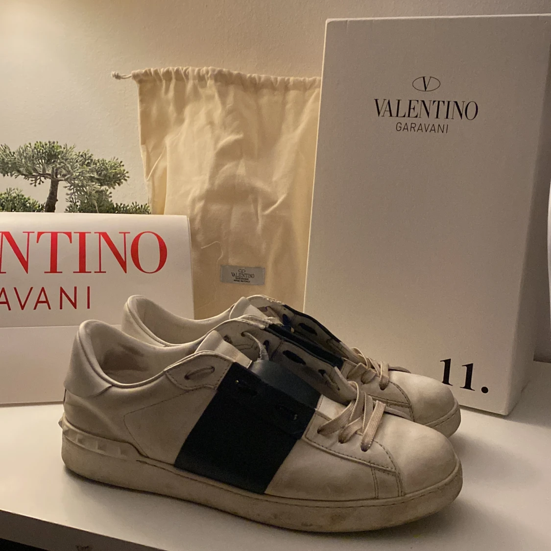 Säljer ett par snygga och stilrena Valentino Garavani sneakers i vitt med en mörkblå rem över snörningen. Skorna är i skinn och har en klassisk design som passar till många olika outfits. De är i storlek herr 45 och kommer med originalförpackning och dustbag.