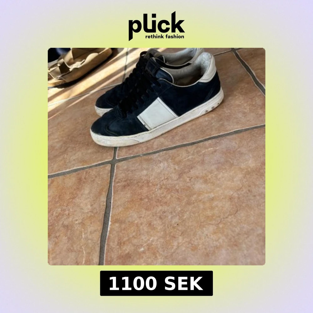 Snygga svarta och vita sneakers från Valentino Garavani med klassiska nitar på sulan. Skorna har svart mocka, vita skinnpaneler och svarta skosnören. Perfekt för dig som vill ha en stilren men ändå edgy look.