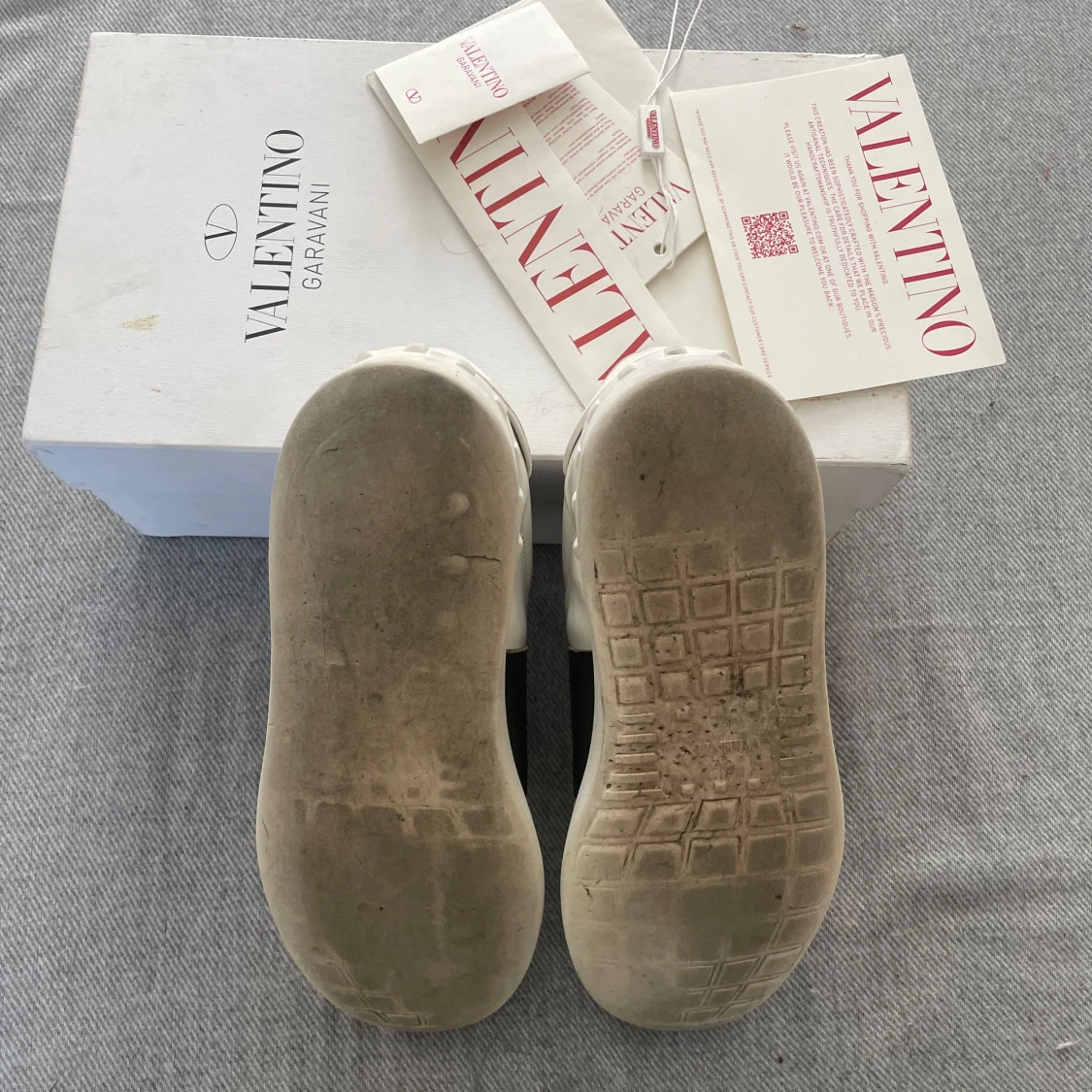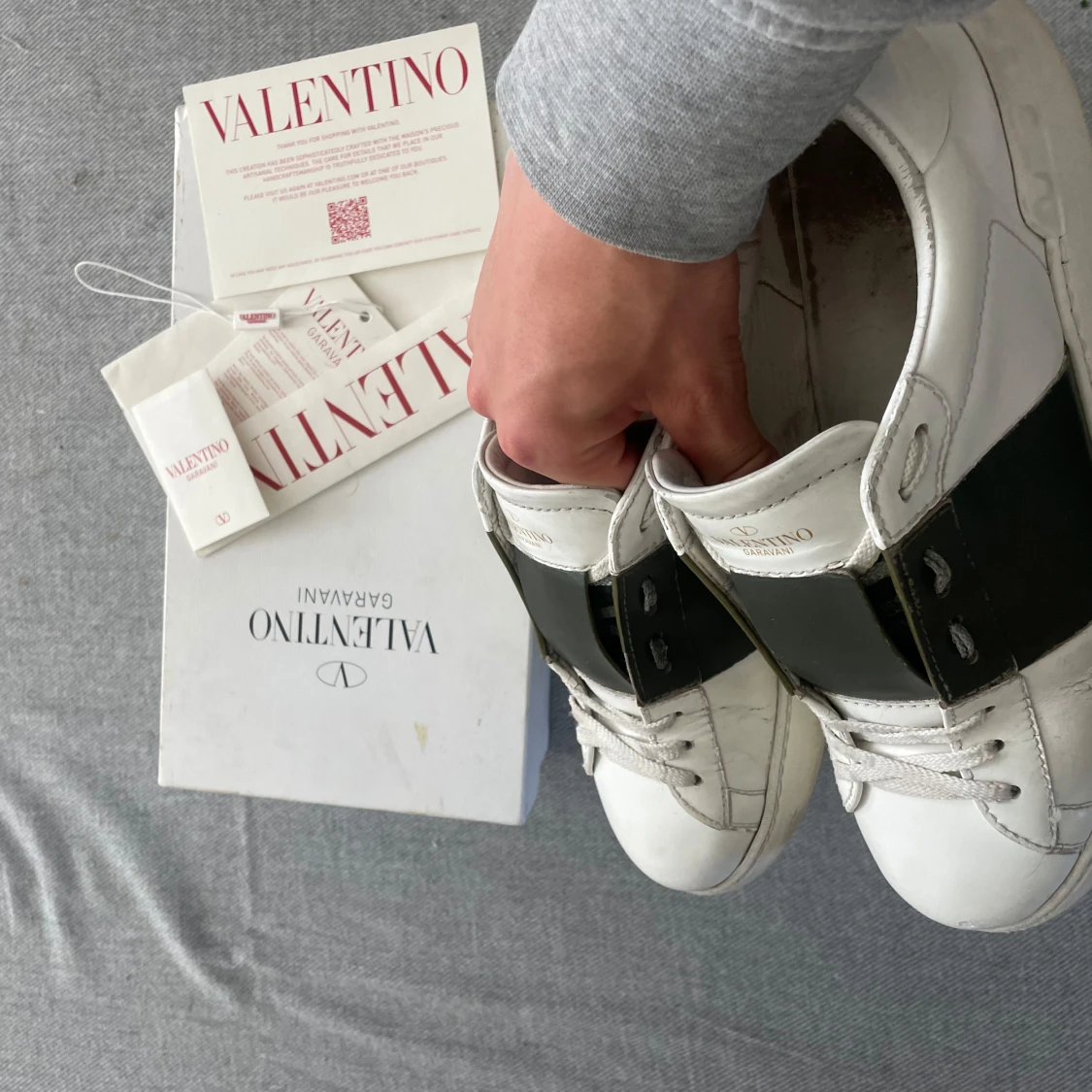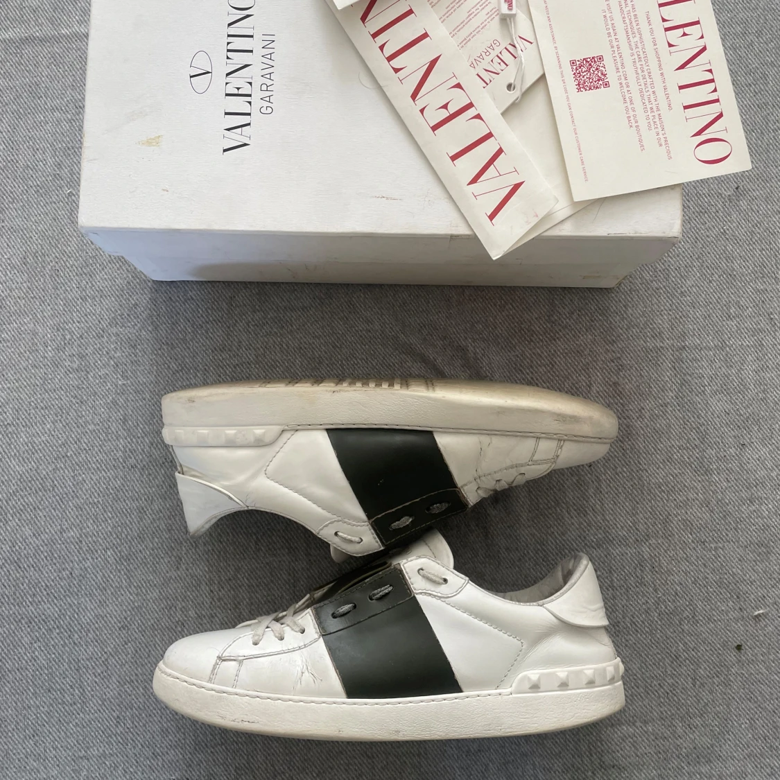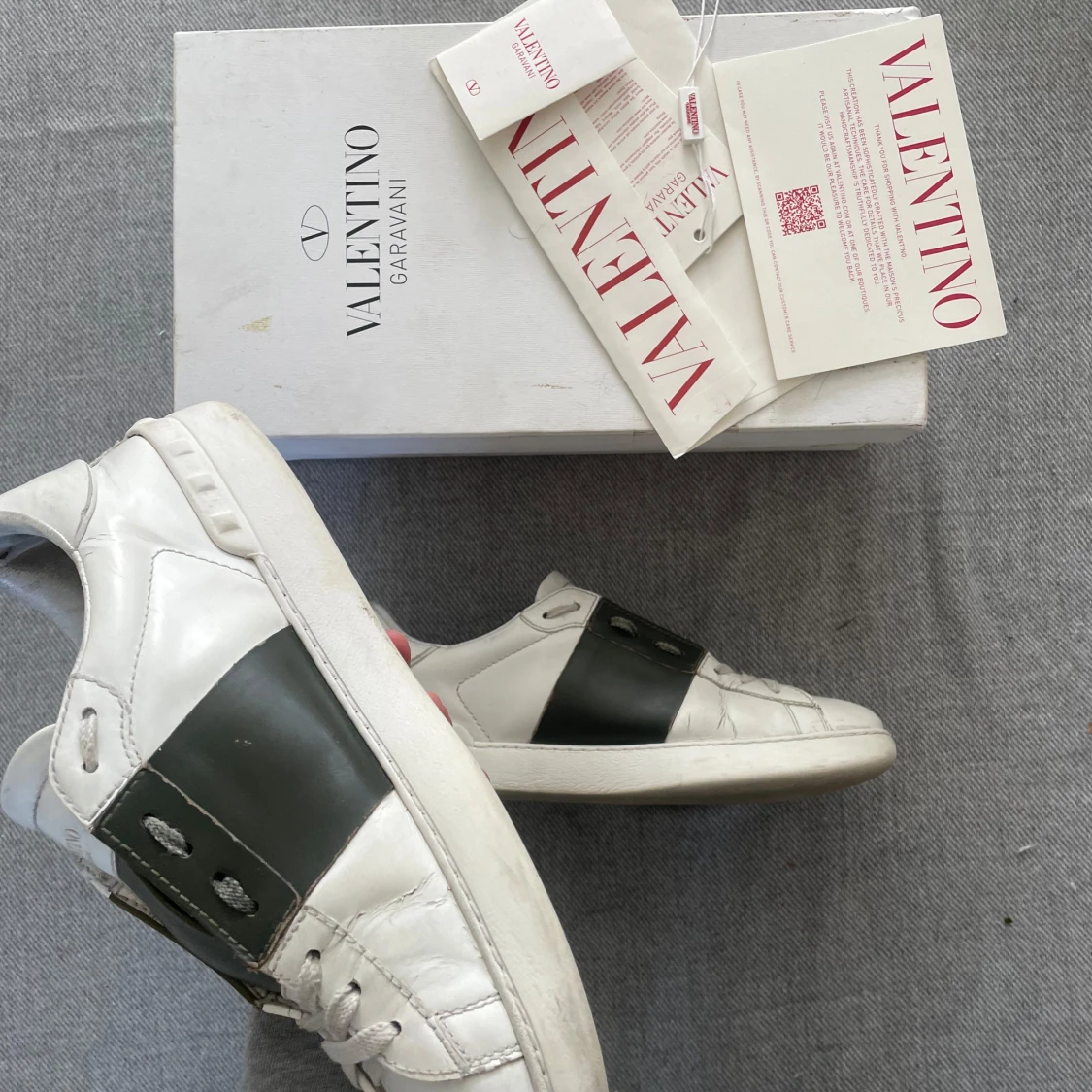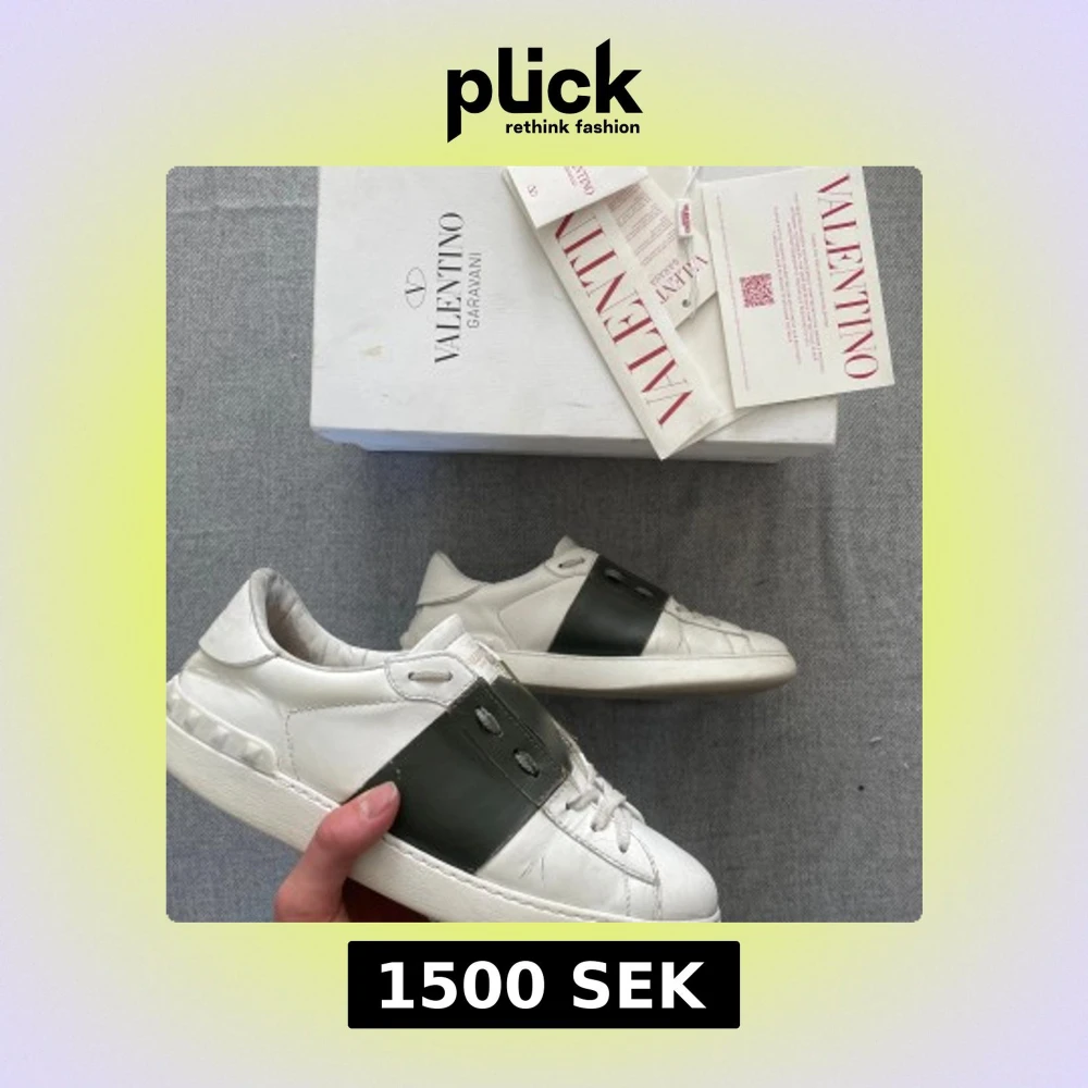 Snygga vita Valentino Garavani sneakers i skinn med bred grön läderdetalj över mitten. Klassisk rund tå, platt sula och coola nitar baktill. Skorna har snörning och en stilren design som sticker ut.