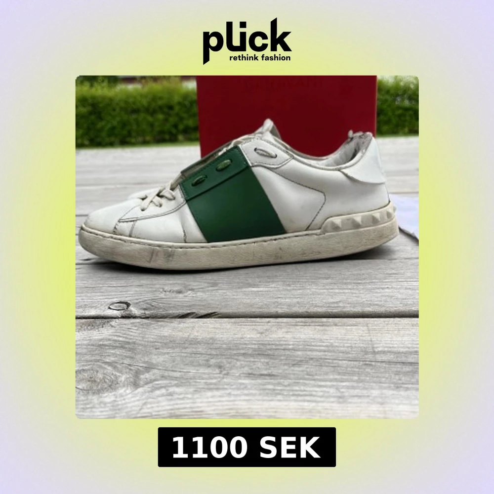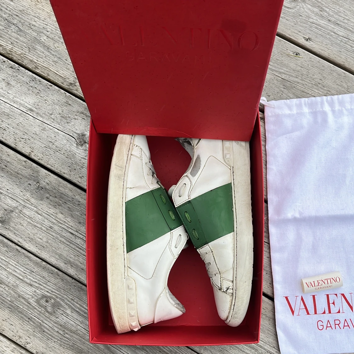 Säljer ett par snygga Valentino Garavani sneakers i vitt med breda gröna detaljer och diskret logga på plösen. Skorna har en klassisk rund tå och platt sula, perfekt för dig som gillar exklusiva märken och stilren design.