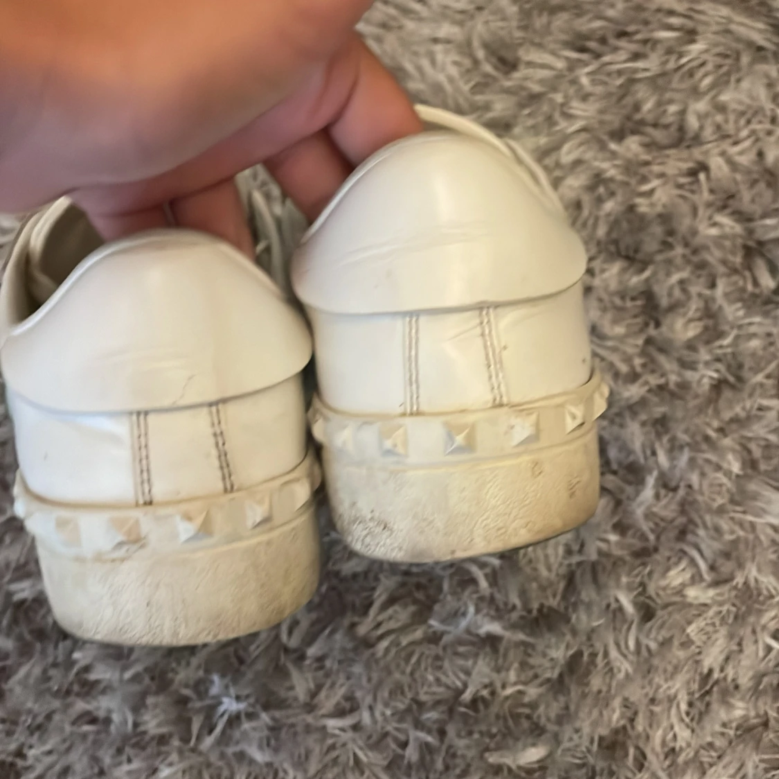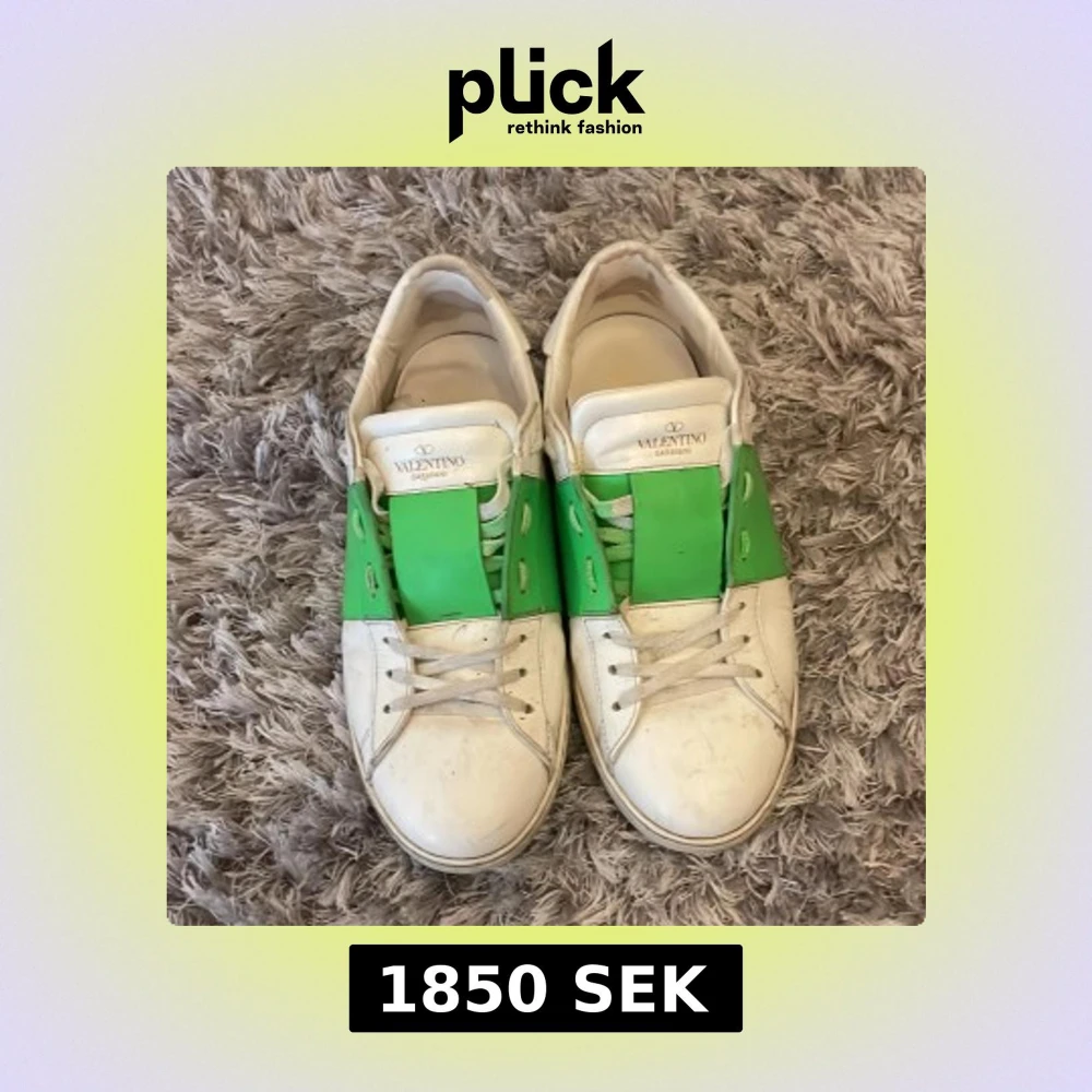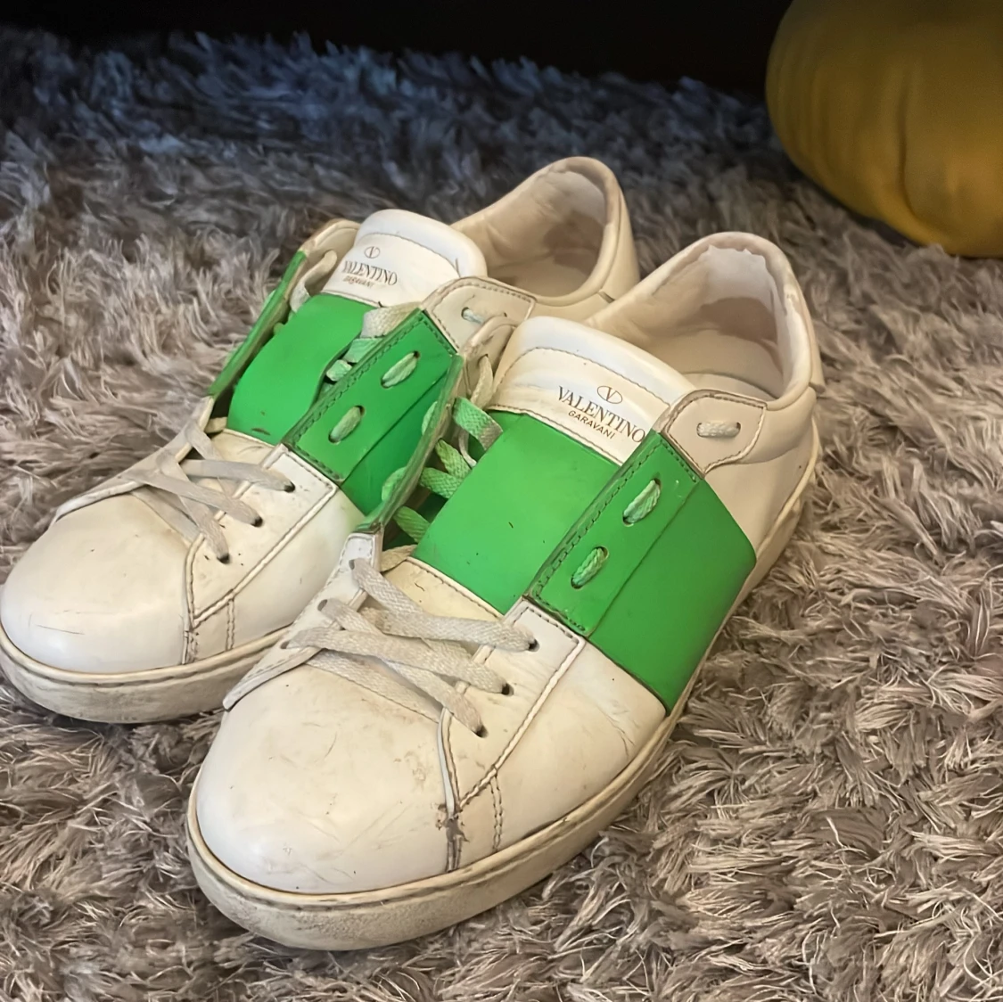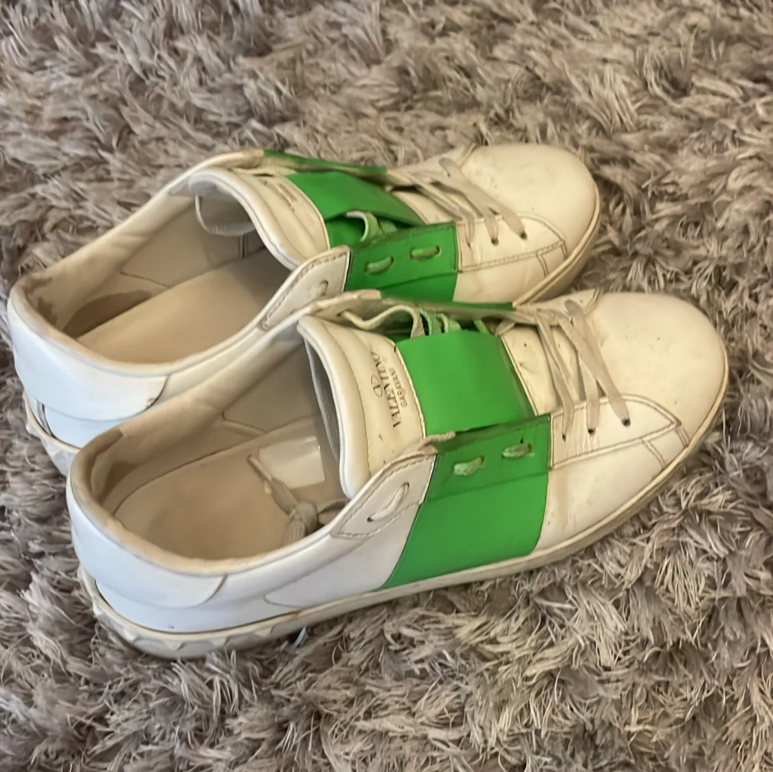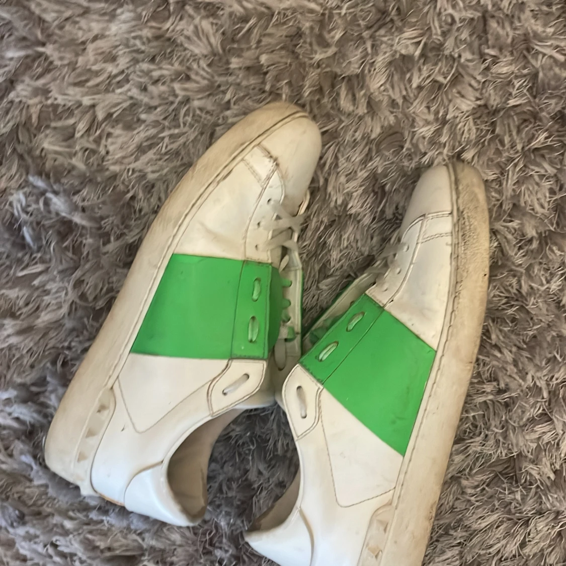 Snygga vita Valentino Garavani sneakers med ett grönt band över vristen och coola nitar på hälen. Skorna har snörning och är tillverkade i skinn. Skorna är köpta på The Grand archive och är 100% äkta