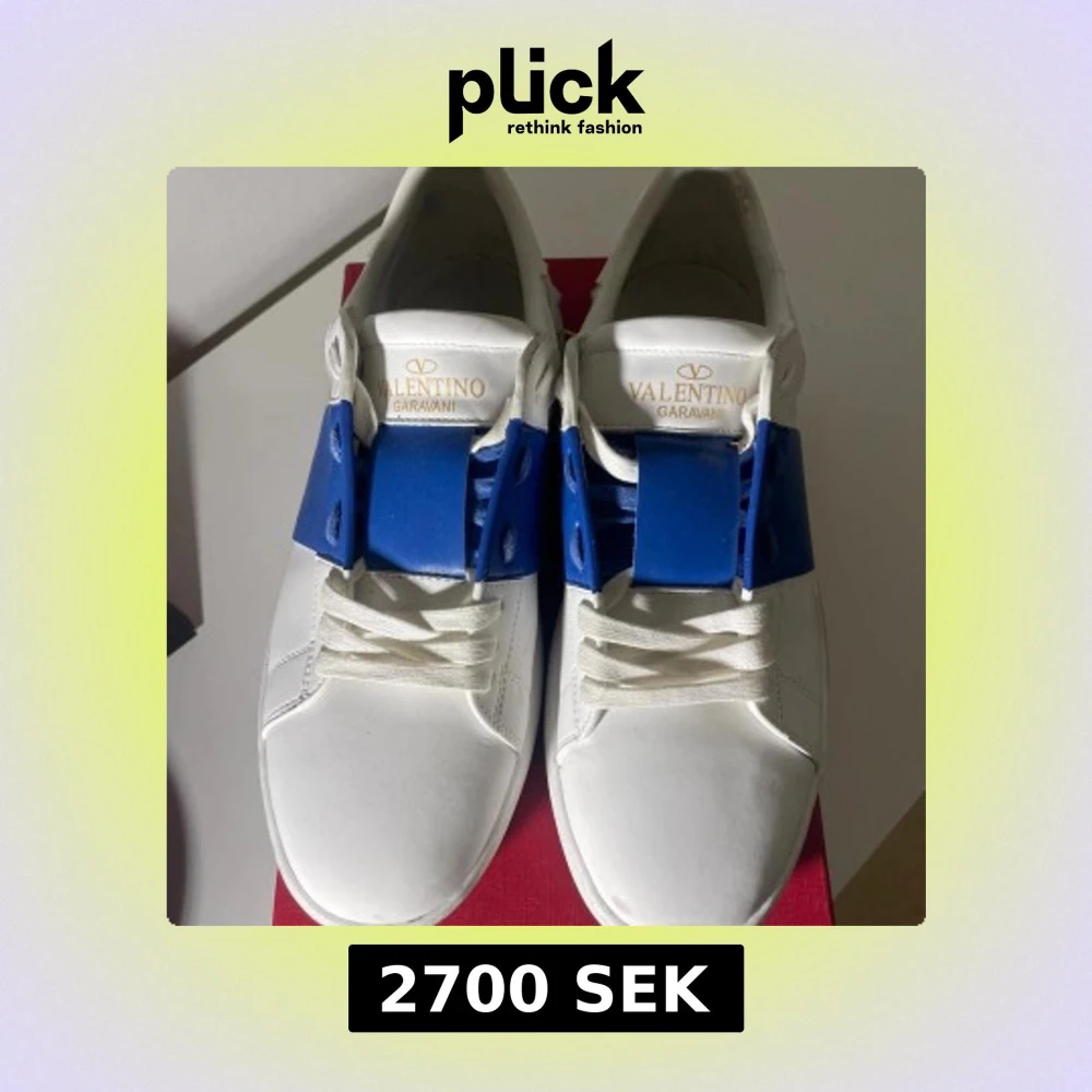 Snygga Valentino Garavani sneakers i vitt skinn med en bred blå detalj över snörningen. Klassisk rund tå och platt sula, med diskret logga i guld på plösen. Perfekta för dig som vill sticka ut med stilrena och lyxiga sneakers.