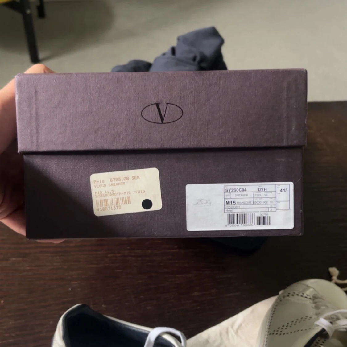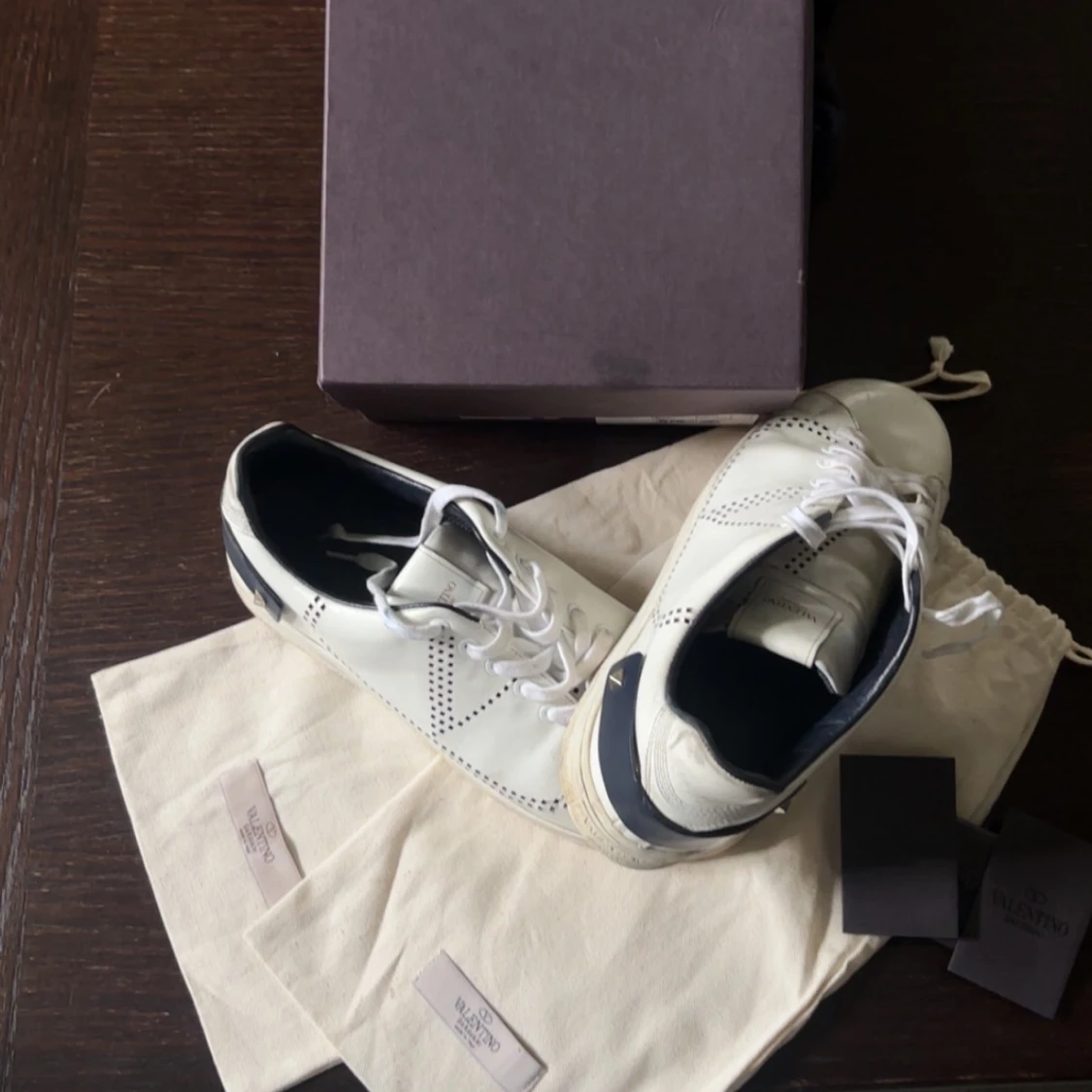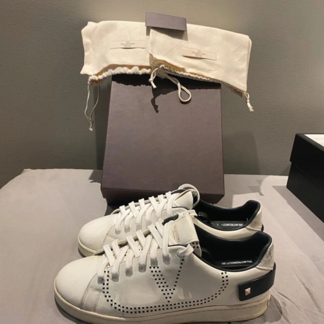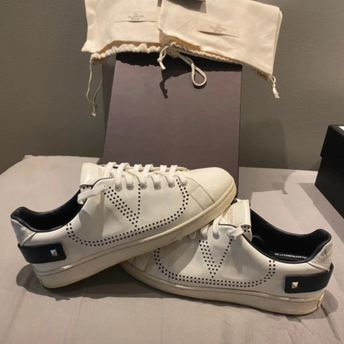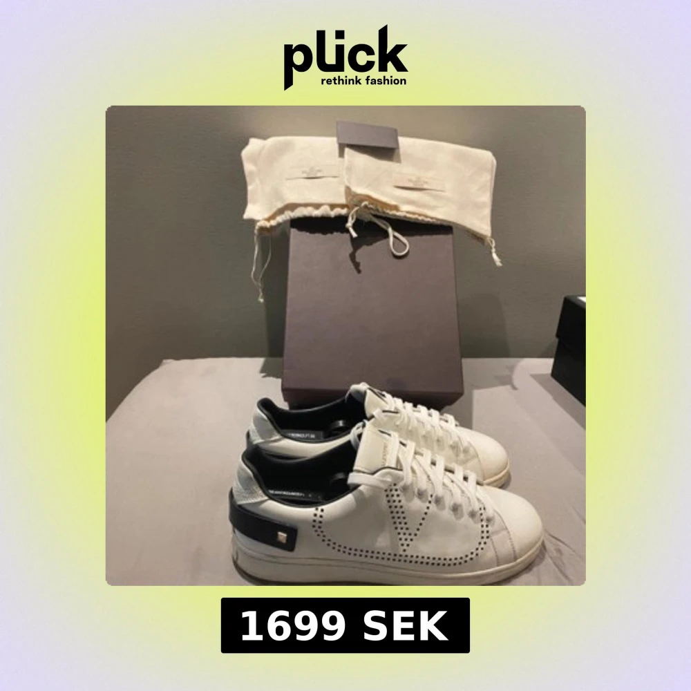 Snygga vita Valentino Garavani sneakers med svarta detaljer och ikoniska nitar på hälen. Skorna har perforerat V-mönster på sidorna, rund tå och platt sula. Tillverkade i skinn och levereras med originalpåse och låda.