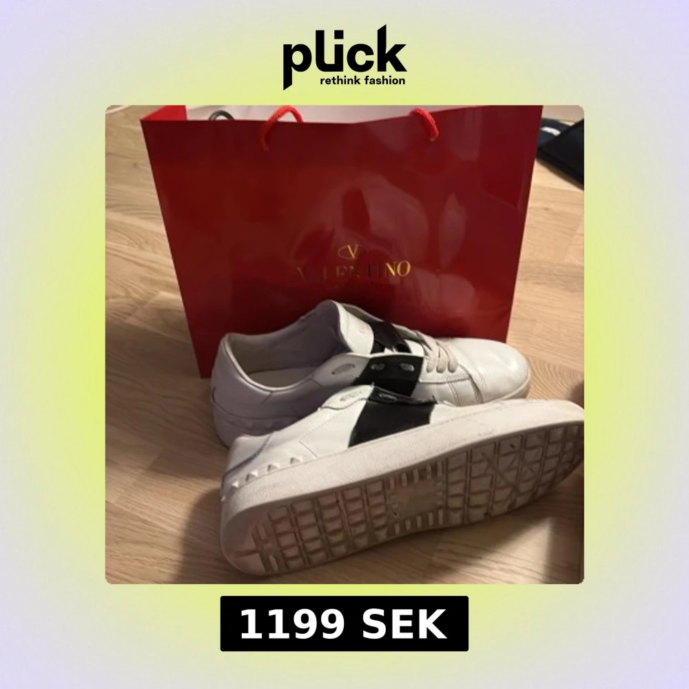Säljer ett par snygga Valentino Garavani sneakers i vitt skinn med bred svart läderdetalj över snörningen. Klassisk rund tå och platt sula, med coola nitar på sidan av sulan. Perfekt för dig som gillar exklusiva märken och stilren design.