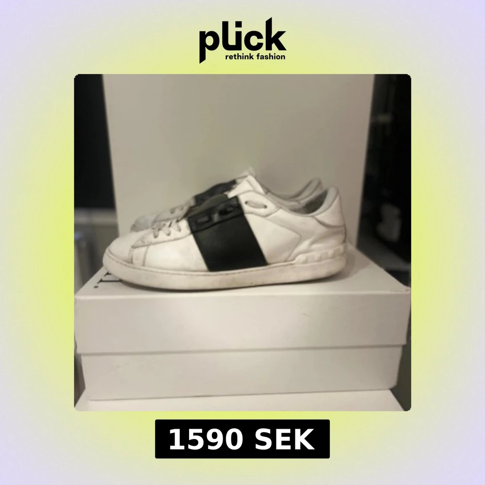 Säljer ett par snygga Valentino Garavani sneakers i vitt skinn med en bred svart detalj över sidan. Klassisk rund tå och platt sula, med snörning framtill. Kommer med originalkartong och tags. Perfekt för dig som gillar exklusiva märken och stilren design. Bara att skriva vid frågor och funderingar. Priset är ej hugget i sten