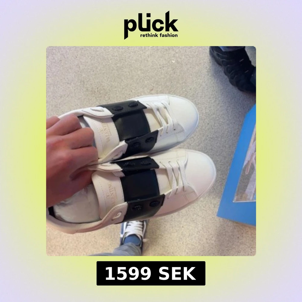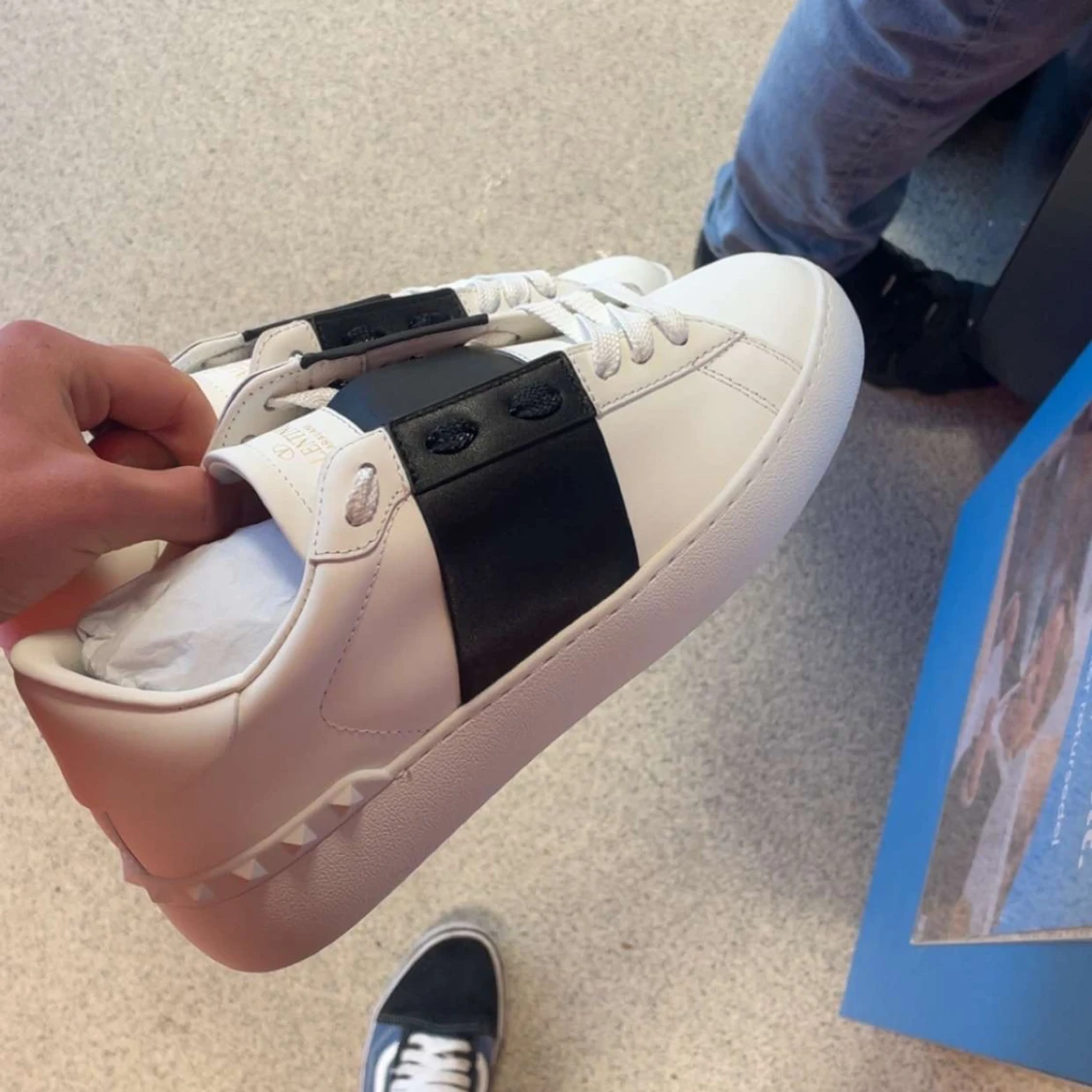 Säljer ett par fräscha vita Valentino Garavani sneakers med bred svart läderdetalj över snörningen. Skorna har rund tå, platt sula och coola nitar på hälen. Perfekt för dig som gillar stilrena och lyxiga sneakers med unik design.