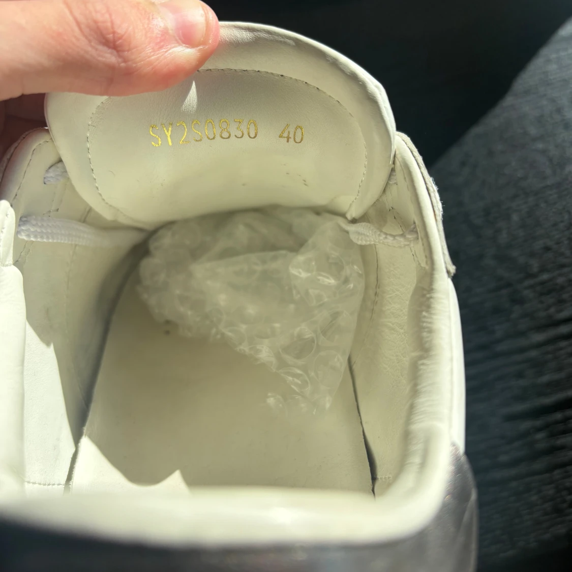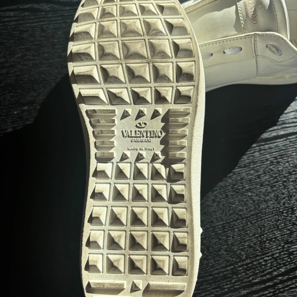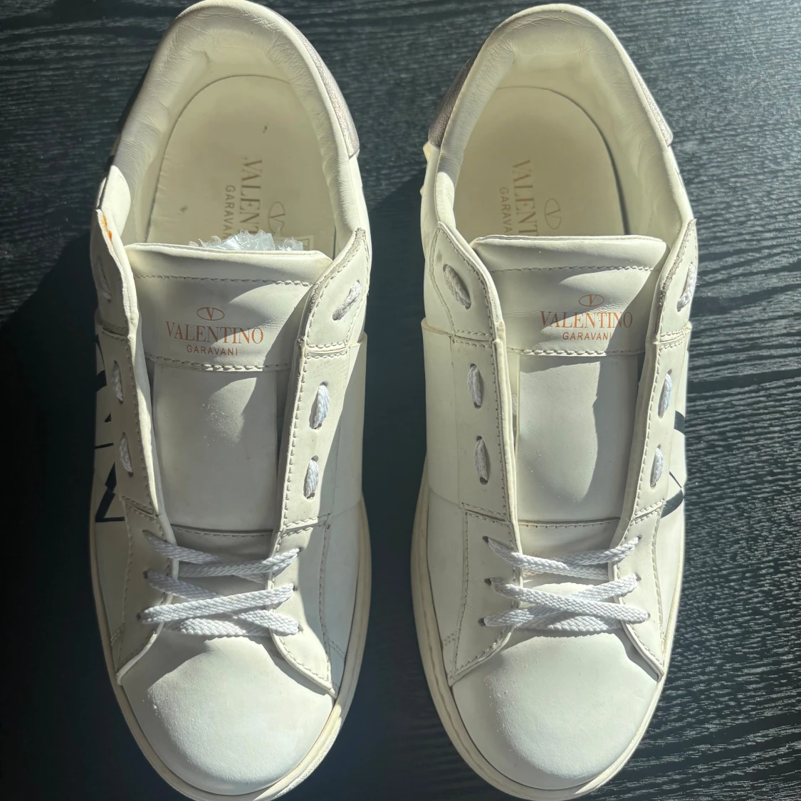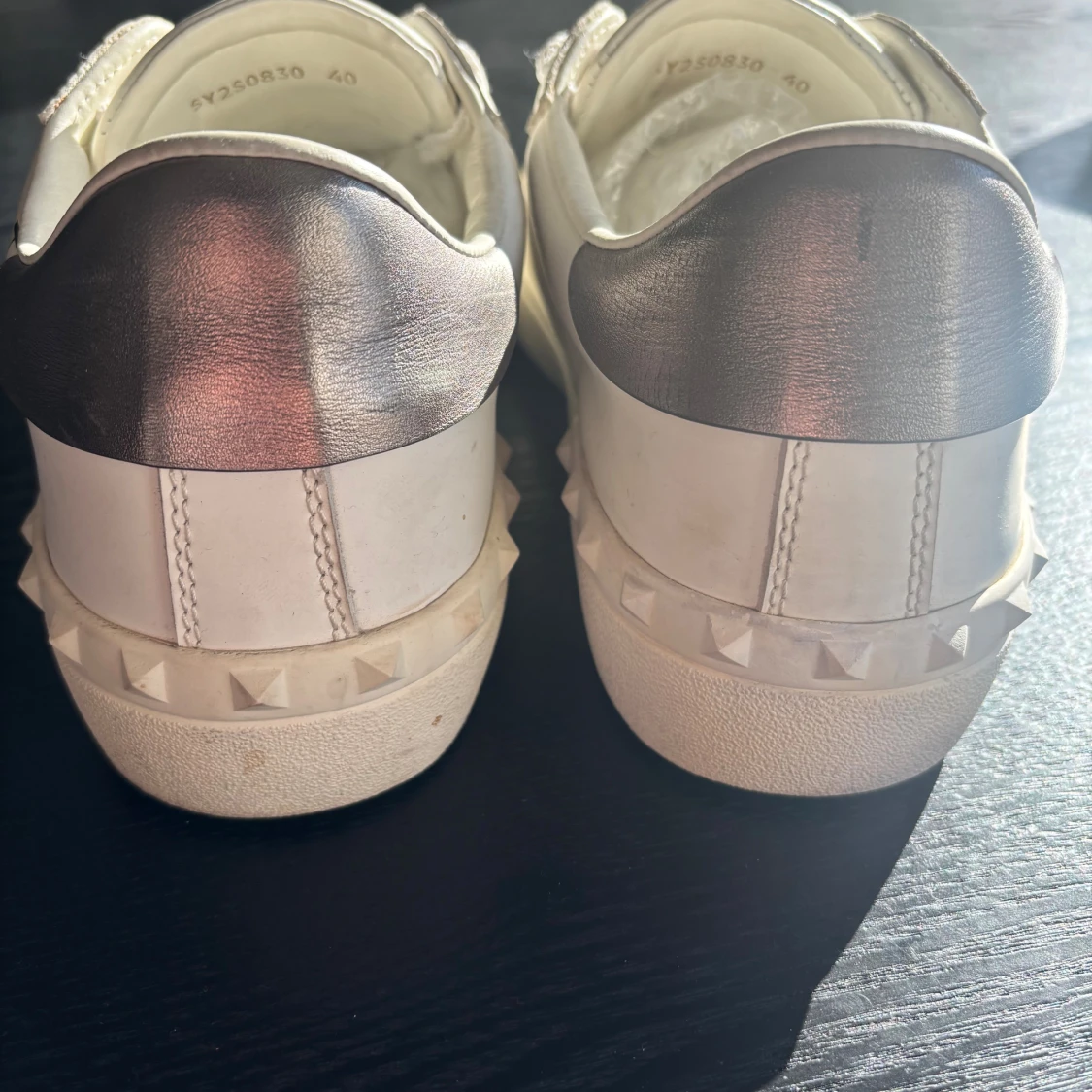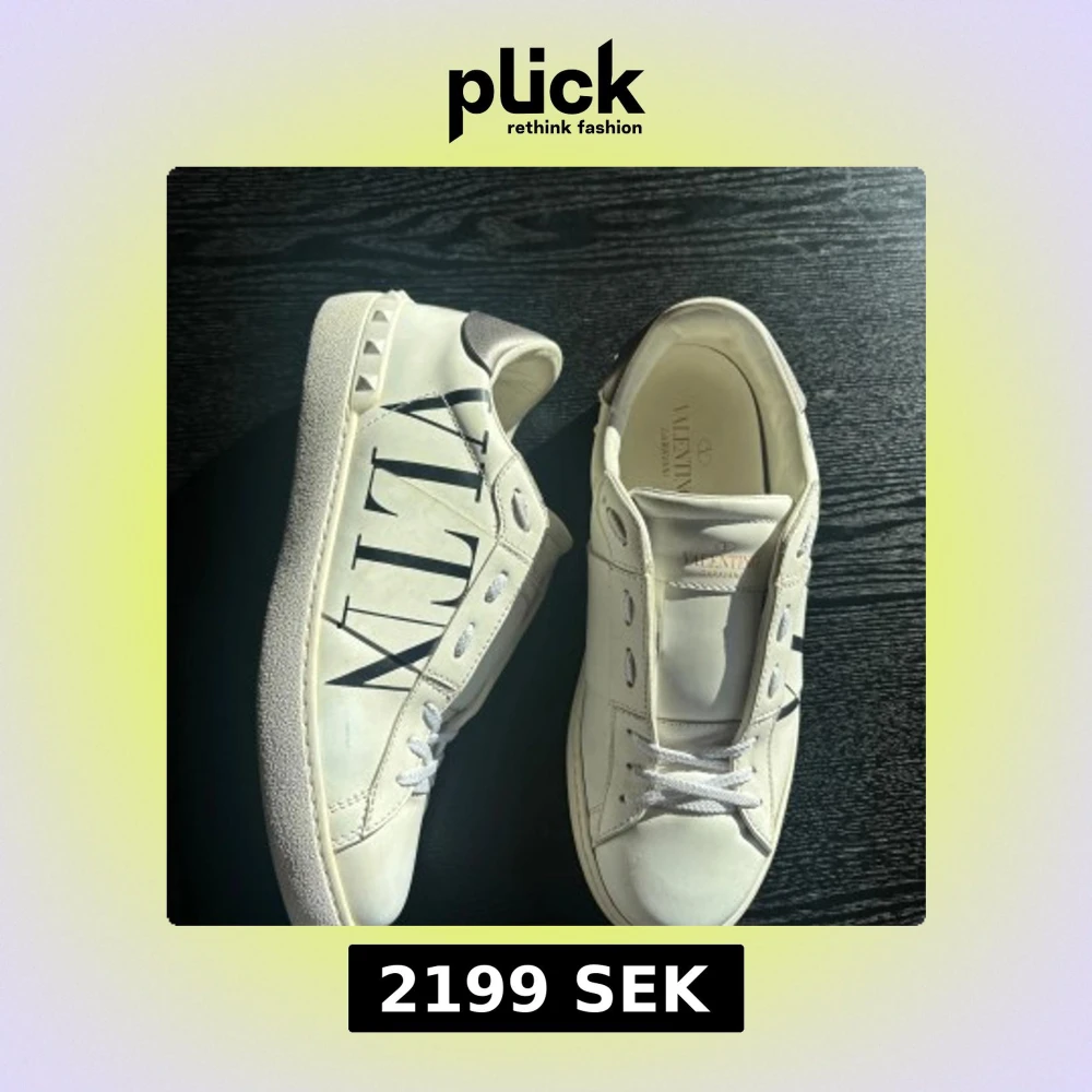 Snygga vita sneakers från Valentino Garavani med svart VLTN-logga på sidan och coola nitar runt hälen. Skorna har silvriga detaljer baktill och klassisk snörning. Tillverkade i skinn för en lyxig känsla och stilren look.
