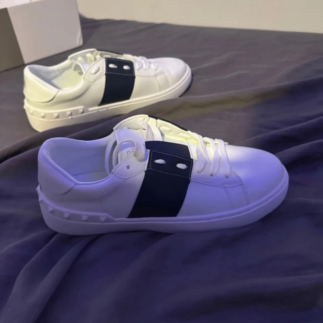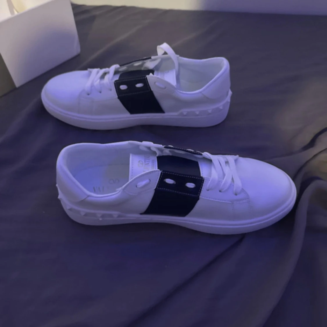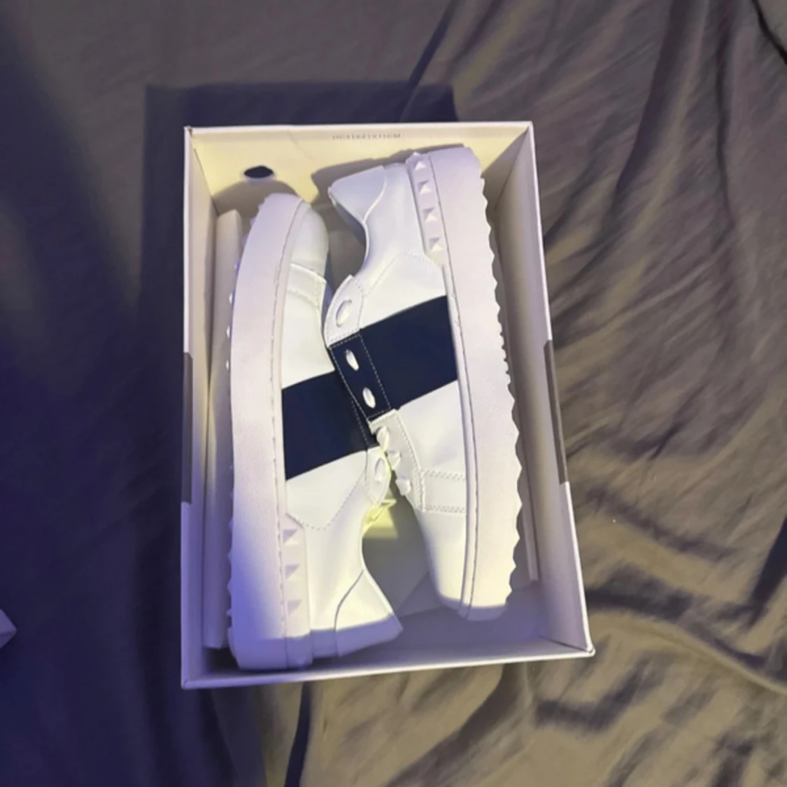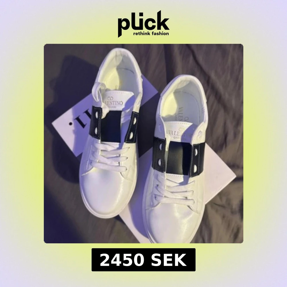 Snygga vita sneakers från Valentino Garavani med bred mörkblå rem över ovansidan och coola nitar längs sulan. Skorna har rund tå, platt sula och snörning. Tillverkade i skinn för en lyxig känsla och stilren look. Helt nya aldrig använda. Storlek 41-42. Pris kan diskuteras.
