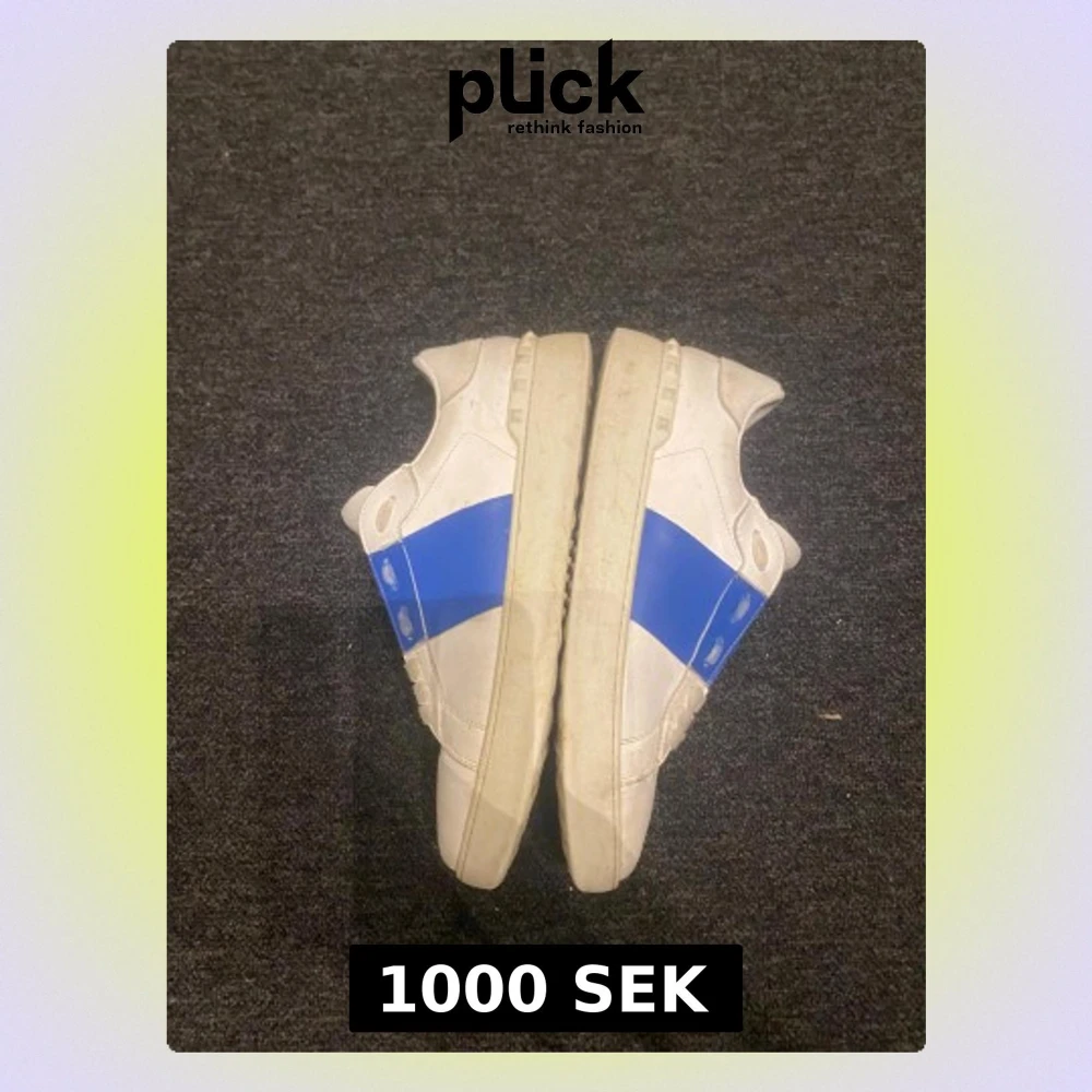 Säljer ett par vita Valentino Garavani sneakers med en bred blå rem över sidan. Skorna har rund tå, platt sula och klassisk snörning. Tillverkade i skinn för en lyxig känsla och stilren look. Perfekta för dig som vill sticka ut med designerstil och perfekta för den uppkommande vintern. Jag måste bara säga att skorna har ett hål i sulan på skorna. Jag rengör såklart skorna inannan dem skickas.