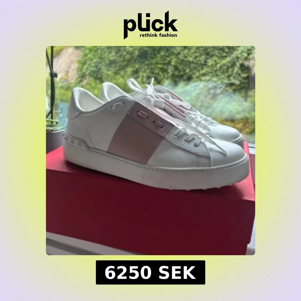 Snygga vita sneakers från Valentino Garavani med bred ljusrosa rem över mitten och matchande rosa detaljer vid snörningen. Skorna har rund tå, platt sula och är tillverkade i skinn. Klassisk och stilren design med logga på plösen och insidan. Har även bara använt 2 ggr så i princip helt nya! Storlek 37