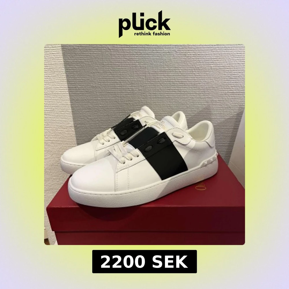 Säljer ett par vita Valentino Garavani sneakers med bred svart rem över mitten och ikoniska nitar på hälen. Skorna har snörning och är tillverkade i skinn. Perfekta för dig som vill ha en stilren och lyxig look.