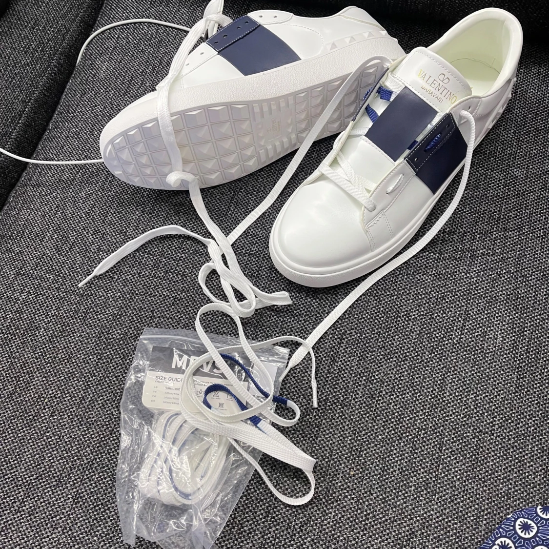 Snygga vita sneakers från Valentino Garavani med breda mörkblå detaljer på sidorna och vita snören. Skorna har en rund tå, platt sula med mönstrad undersida och är tillverkade i skinn. Perfekt för dig som gillar stilrena och lyxiga sneakers med exklusiv känsla.