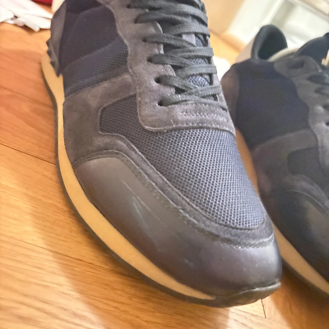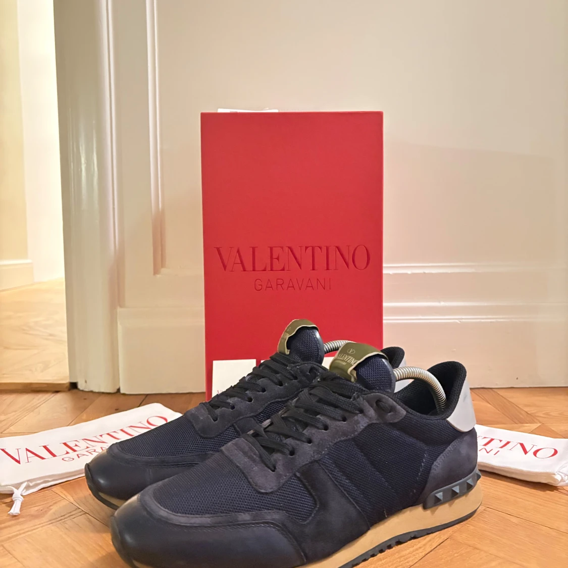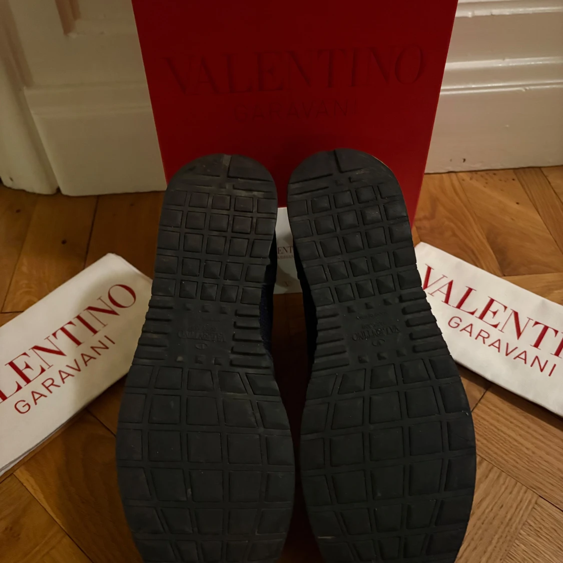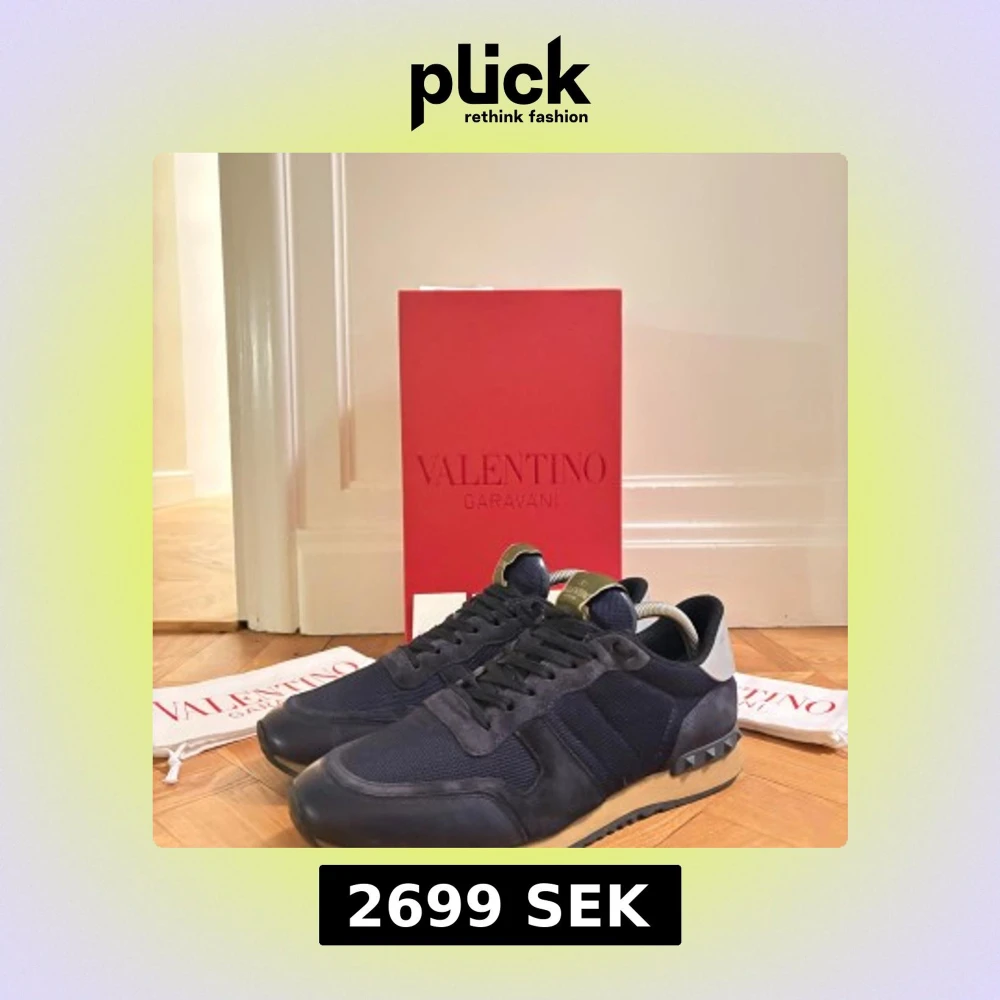 Snygga svarta sneakers från Valentino Garavani med en stilren design i storlek 42 (kan även passa större). Skick 8/10 (mycket kvar att ge). Skorna kommer me allt og. Lite slitet högst upp på höger skon (se bild 3). Säljer för 2699kr. Priset är ej hugget i sten! Skriv om eventuella funderingar☺️