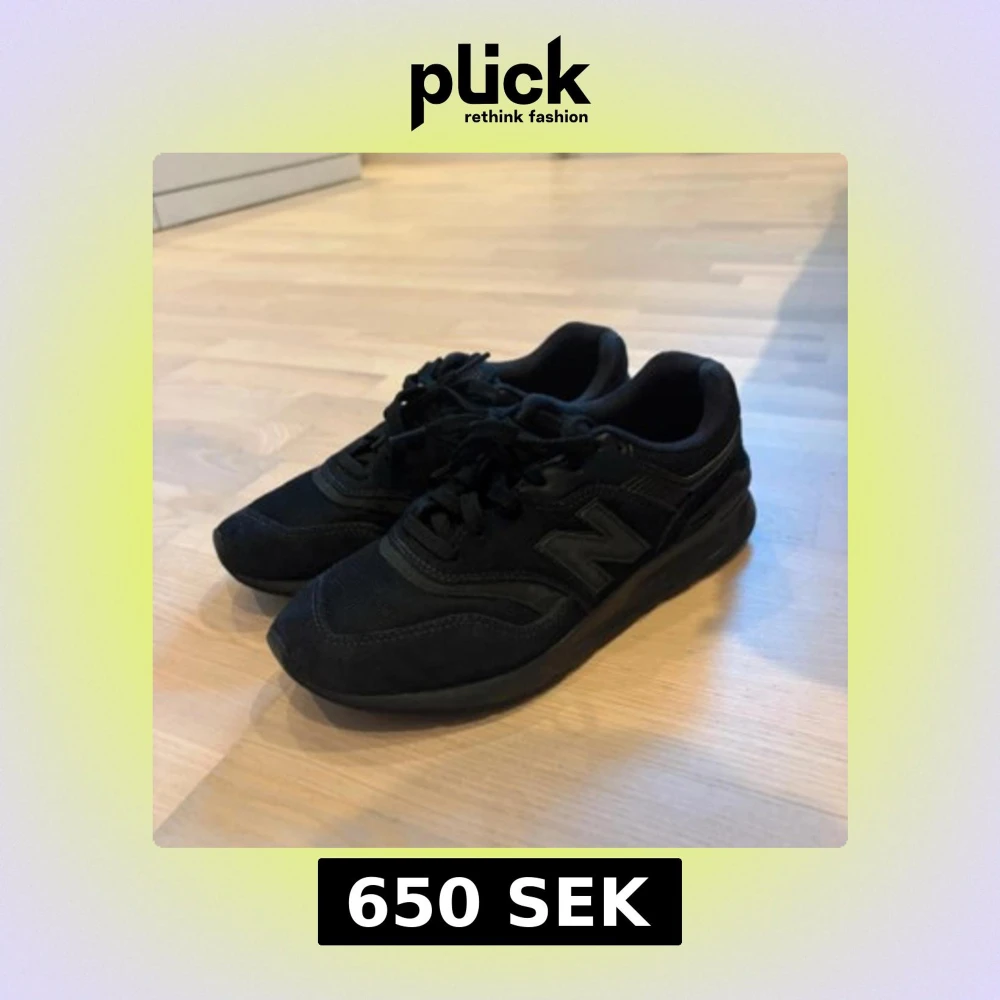 Säljer ett par helsvarta New Balance sneakers med klassisk rund tå och platt sula. Skorna har snörning och är tillverkade i en mix av mocka och syntetmaterial. Den ikoniska N-loggan syns tydligt på sidan. Perfekta för dig som gillar stilrena och sportiga skor.