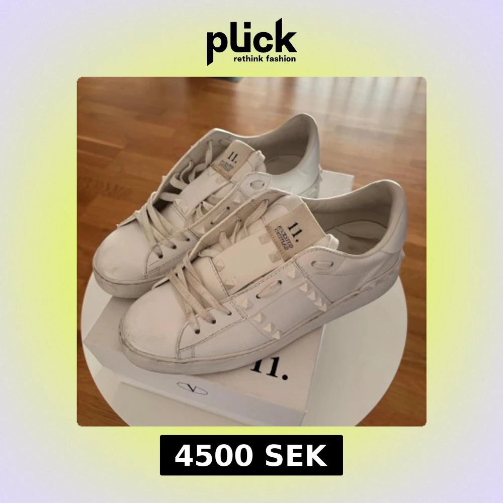 Säljer ett par vita Valentino Garavani sneakers med ikoniska pyramidformade nitar längs sidorna. Skorna har snörning, platt sula och är tillverkade i skinn. Perfekta för dig som gillar stilrena och exklusiva sneakers. Använd max 10 gånger, skickas i original låda med extra snören. Går att tvätta om så önskas! Skriv ett meddelande om fler bilder önskas. Köpa på NK för 7000kr