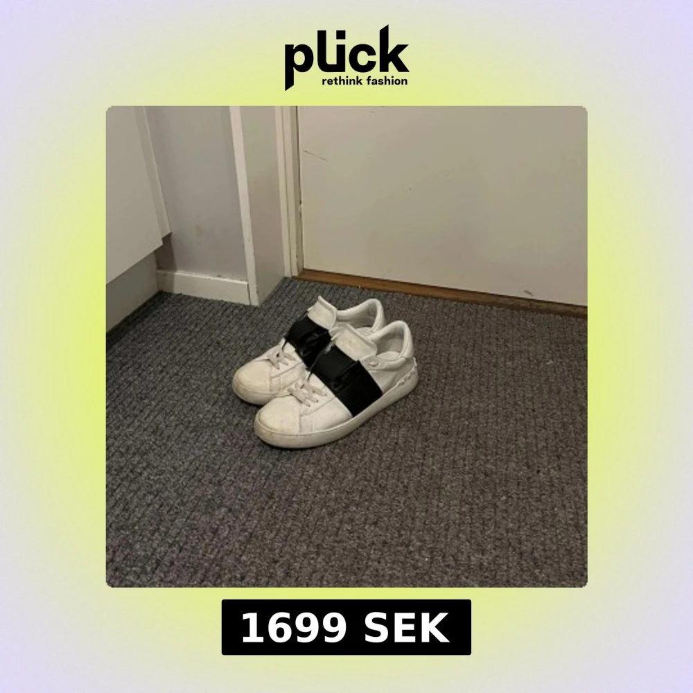 Säljer ett par vita Valentino Garavani Open sneakers med ett brett svart band över vristen. Skorna har rund tå, platt sula och klassisk snörning. Kommer med originalkartong, dustbag och påse. Perfekta för dig som gillar stilrena och lyxiga sneakers. Skick 8/10. Allt og följer med.