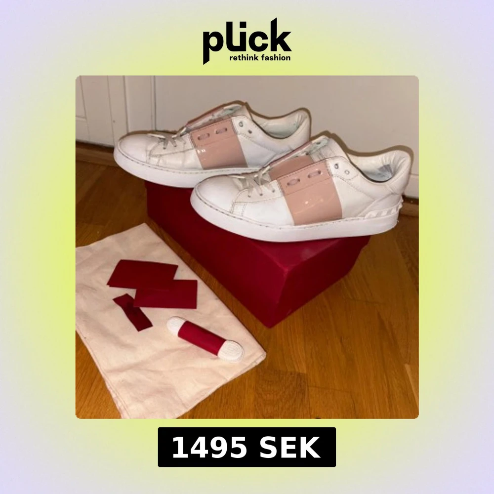 Säljer ett par Valentino Open sneakers i vitt skinn med en bred, ljusrosa panel över snörningen och ikoniska nitar vid hälen. Platt sula och rund tå, med vita skosnören och detaljer i rosa. Kommer med originalförpackning och dustbag. Storleken är 40