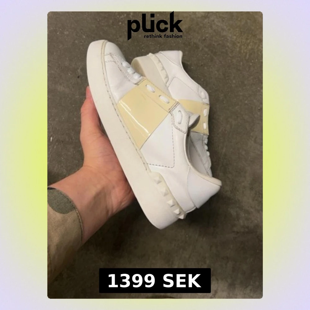 Säljer ett par snygga Valentino skor sneakers i vitt skinn med beige detalj och ikoniska nitar på hälen. Skorna har rund tå, platt sula och snörning. Perfekta för dig som vill ha en clean men ändå lyxig look.