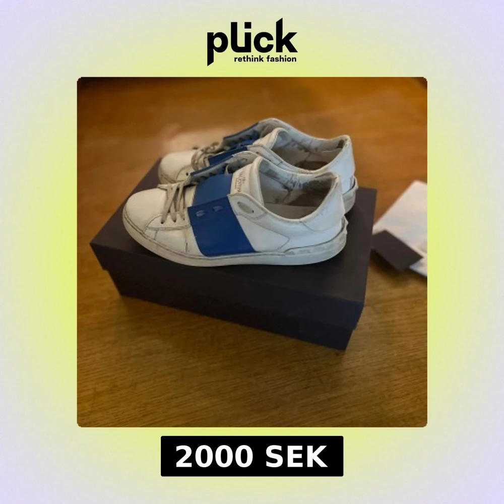 Snygga Valentino Open sneakers i vitt skinn med en bred blå läderdetalj över snörningen. Klassisk rund tå och platt sula. Kommer med originalkartong och dustbag. Perfekta för dig som vill ha en stilren men ändå unik look.