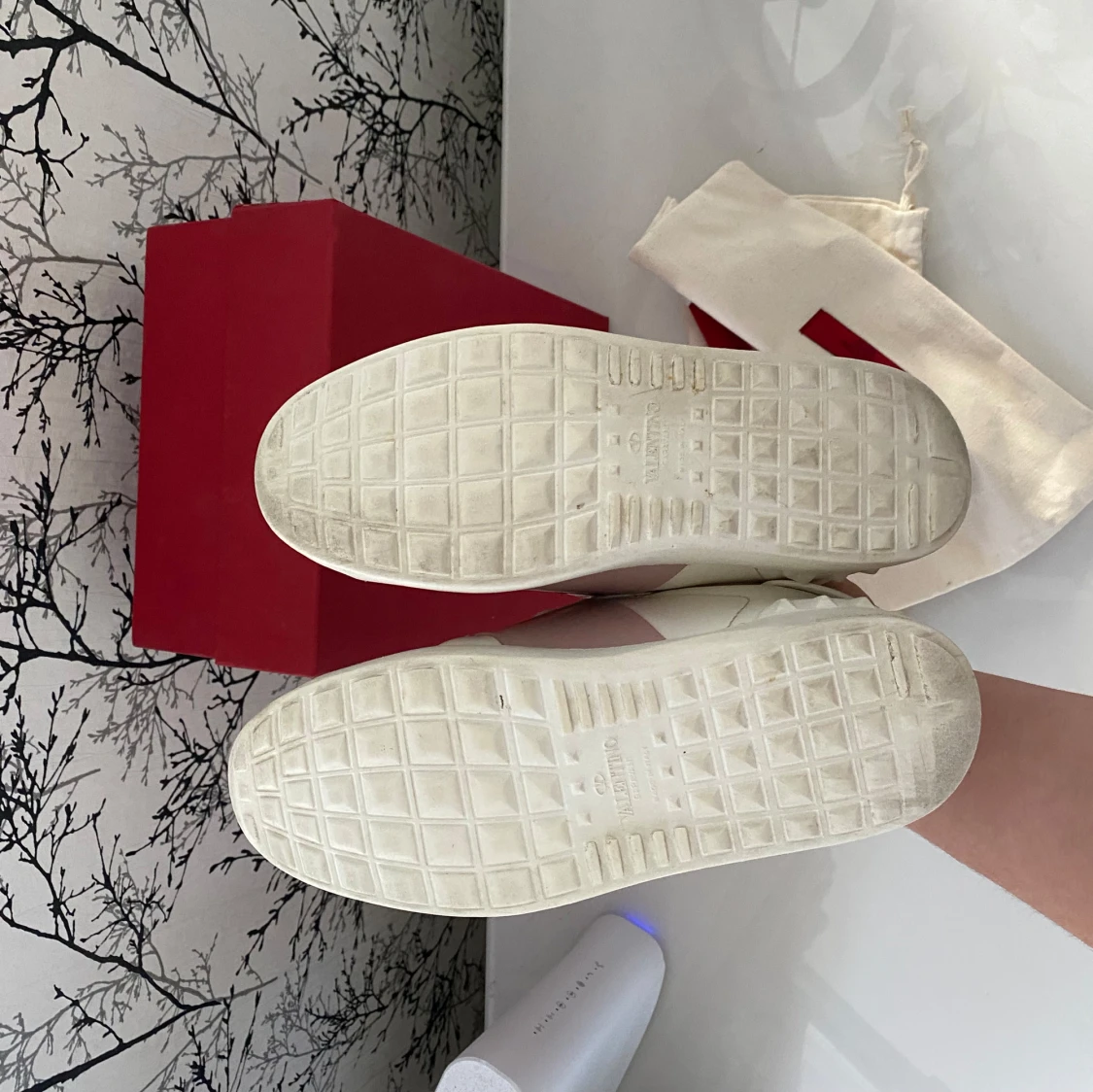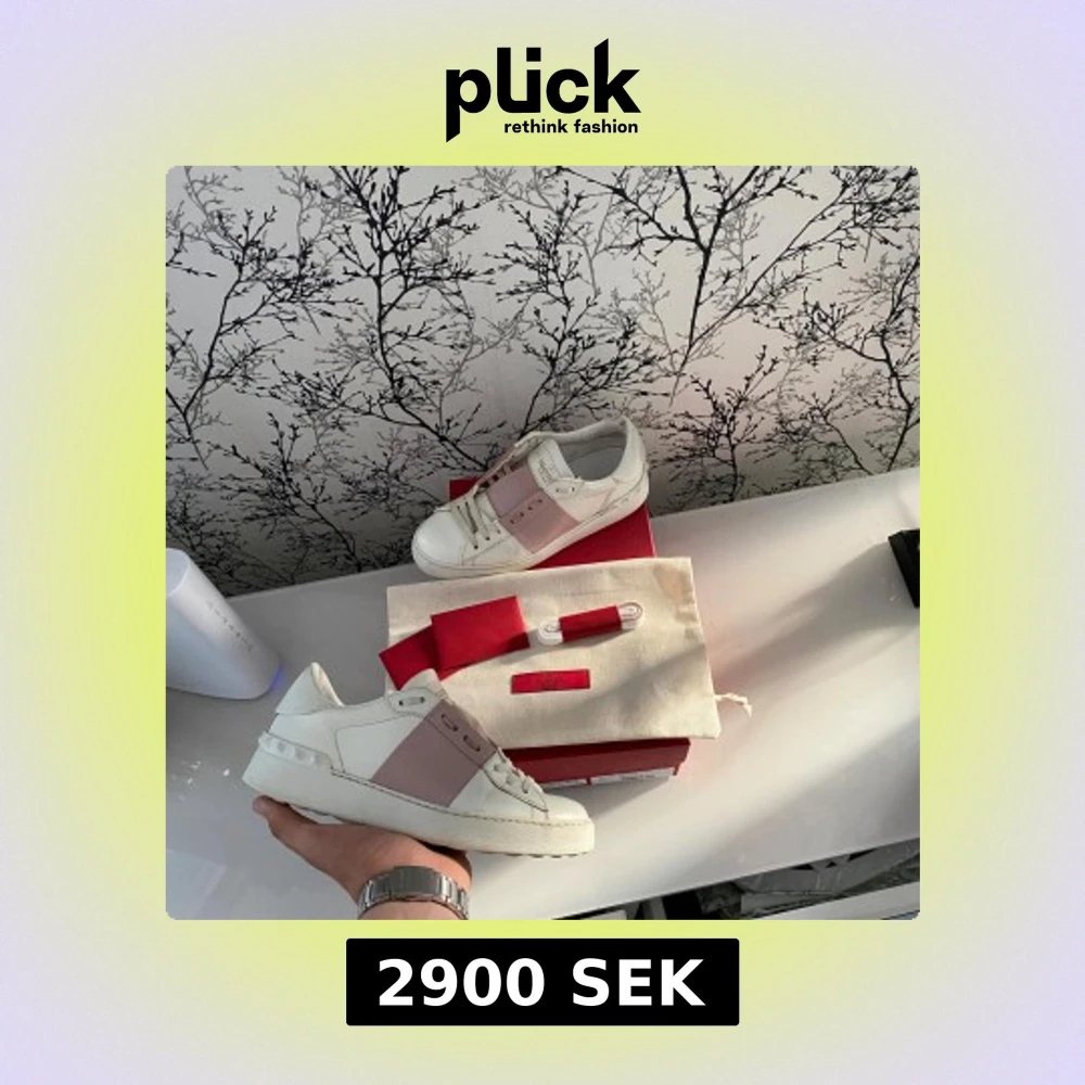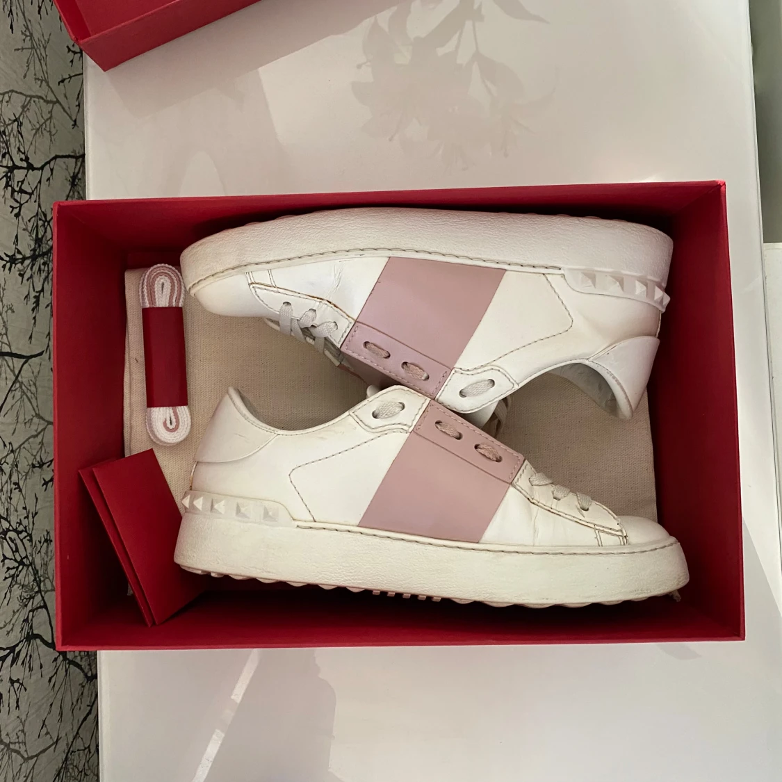 Säljer ett par Valentino Open sneakers i vitt skinn med bred rosa rem över mitten och ikoniska nitar på hälen. Klassisk rund tå, platt sula och vita snören. Kommer med originalkartong, extra skosnören och dustbag. Perfekta för dig som gillar lyxiga detaljer. Medföljer: Box, extraskosnören, kort från valentino, dustbag