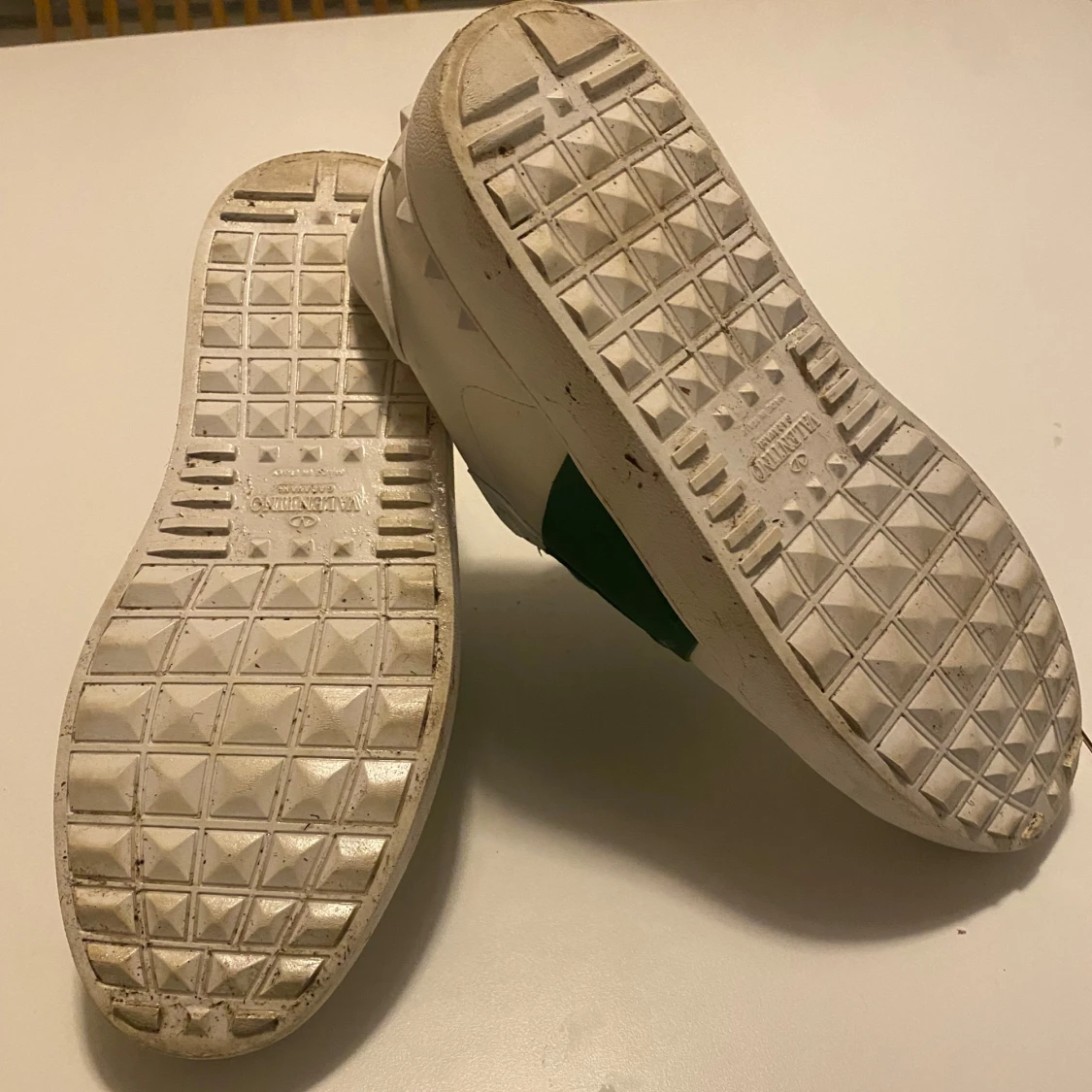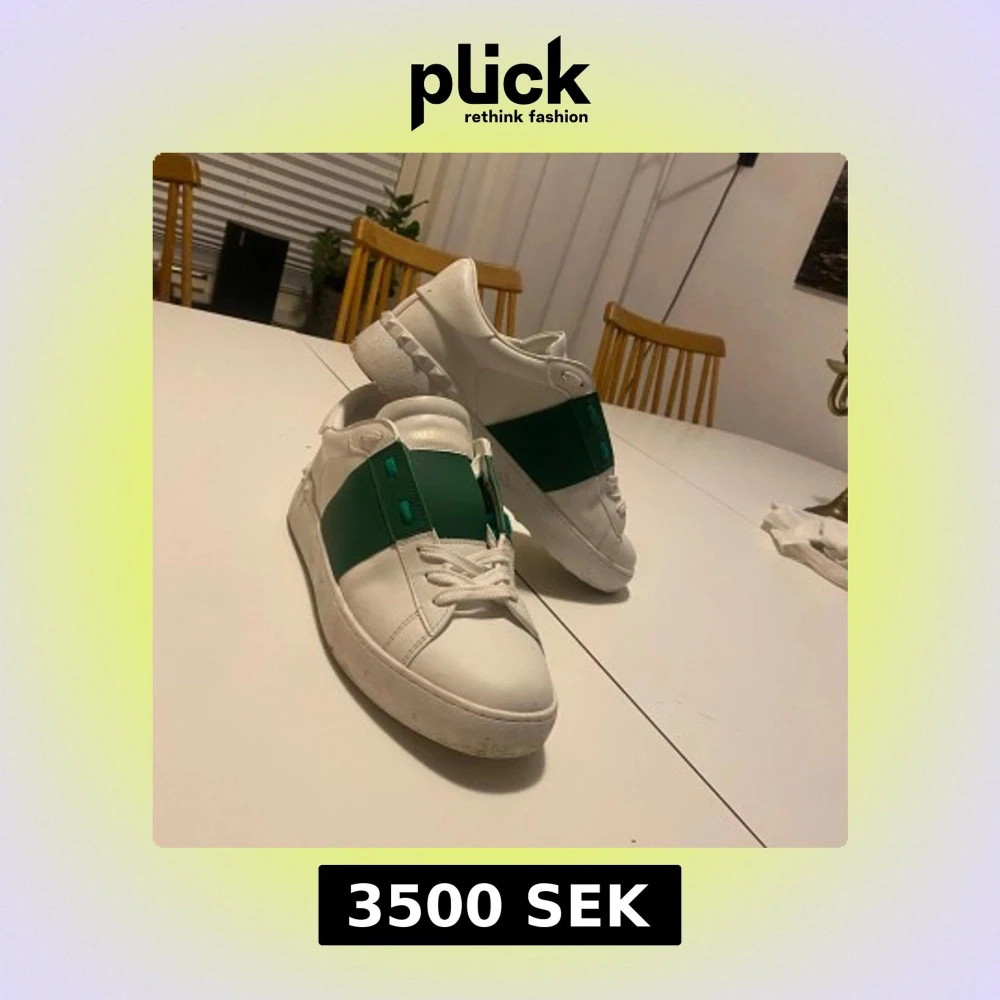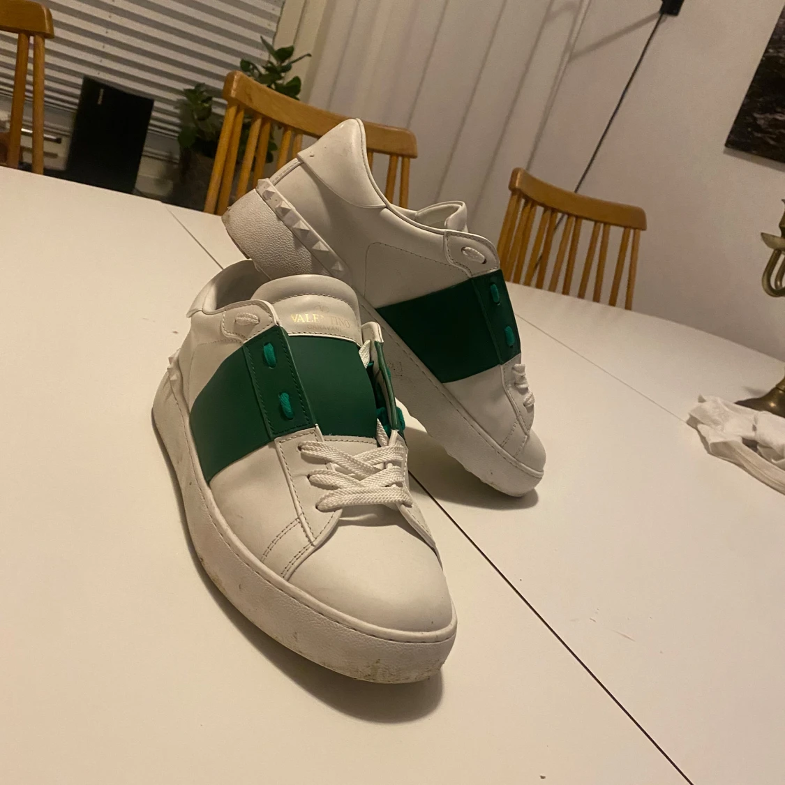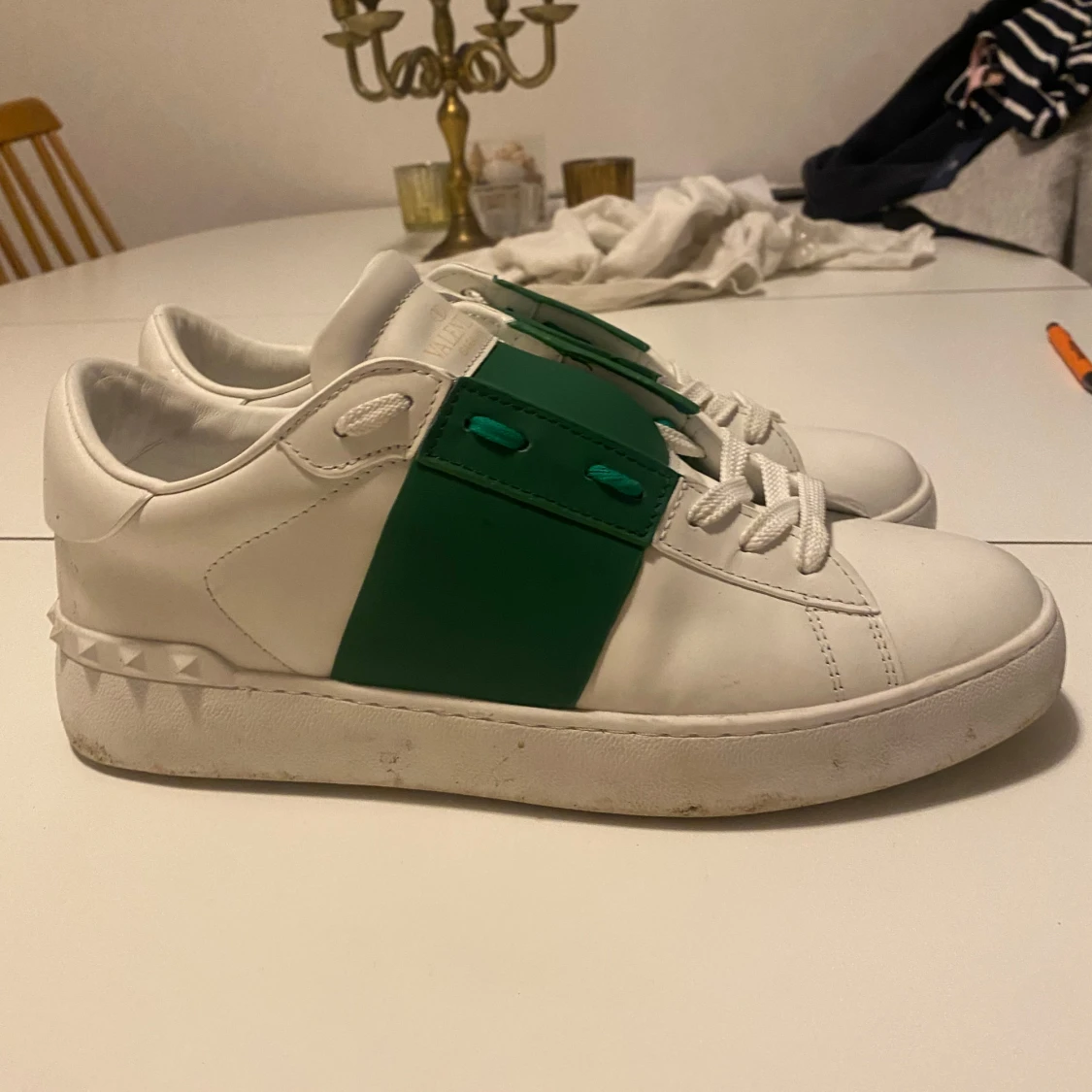 Snygga vita Valentino opens med en bred grön rem över snörningen. Skorna har en unik design med nitar runt hälen och en klassisk siluett. Perfekta för att ge din outfit en lyxig touch. Hör av er vid funderingar!