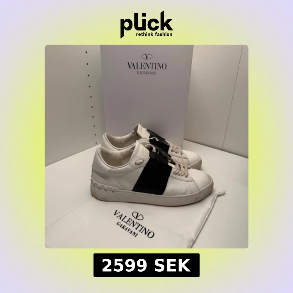 Snygga sneakers från Valentino Garavani i vitt skinn med bred svart läderdetalj över sidan. Klassisk rund tå, platt sula och coola nitar på hälen. Skorna har snörning och kommer med originalpåse och box. Perfekt för dig som gillar exklusiv streetstyle. Allt og nedkommer som box, skopåse, påse och kuvert. Pm vid funderingar.