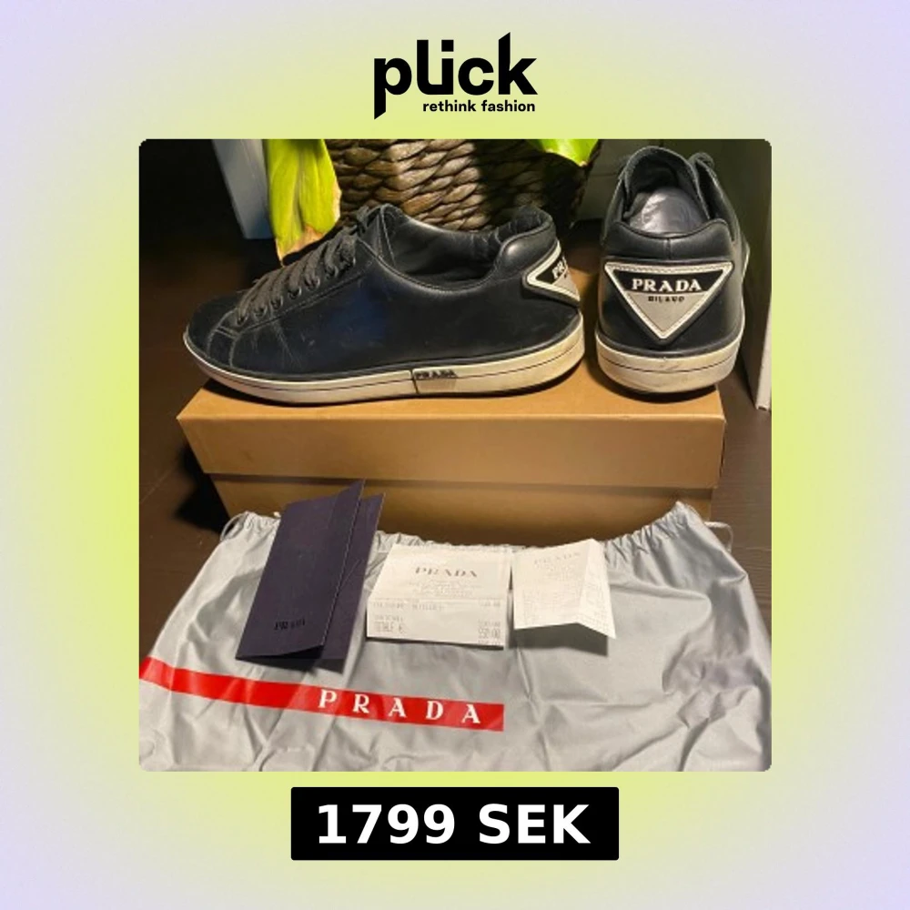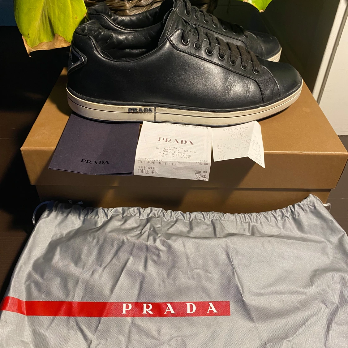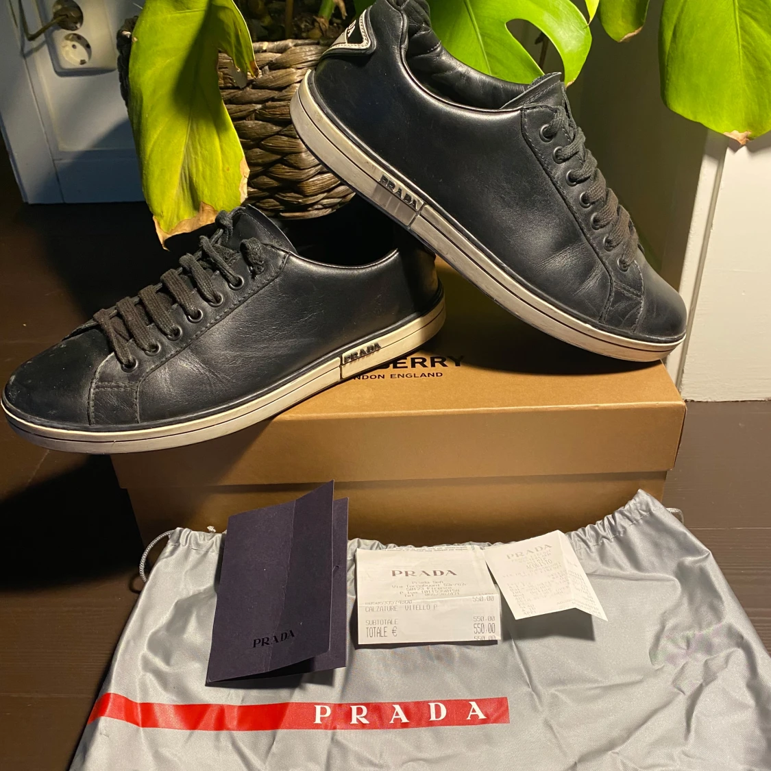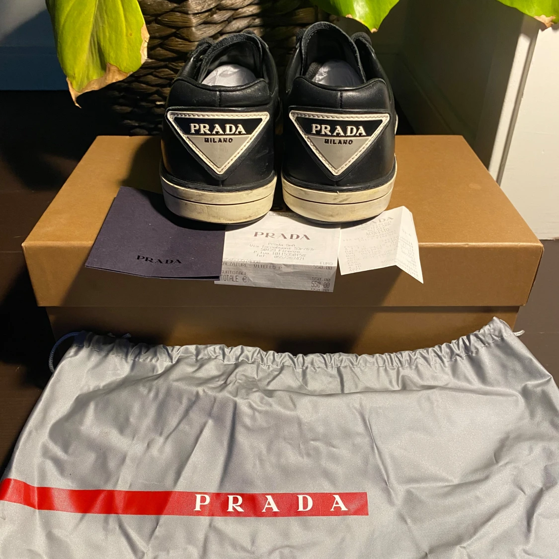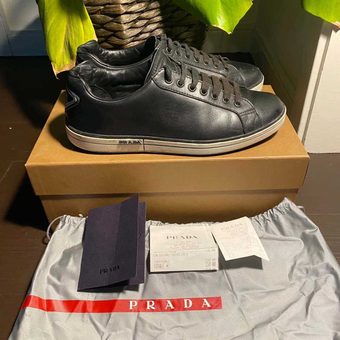 Prada sneakers i svart läder med vit sula och klassisk logga på hälen. Snygg och stilren design med diskreta detaljer. Allt på bilden medkommer vid köp. Kvitto finns. Nypris över 6500kr. Storlek 41 och true to size. Välanvända men i bra skick. Skriv i DM för fler bilder!