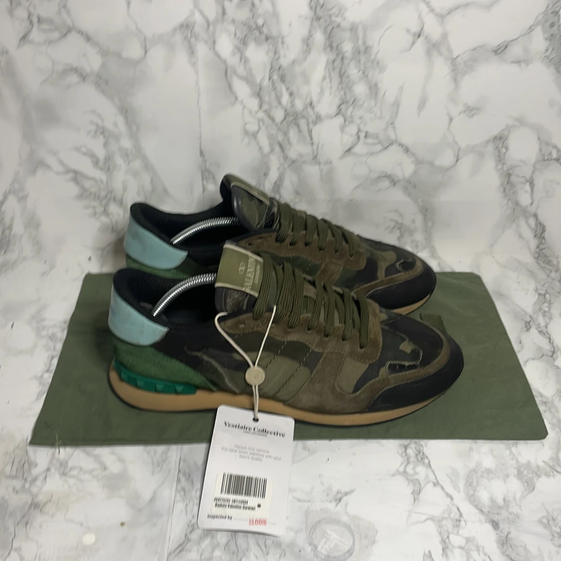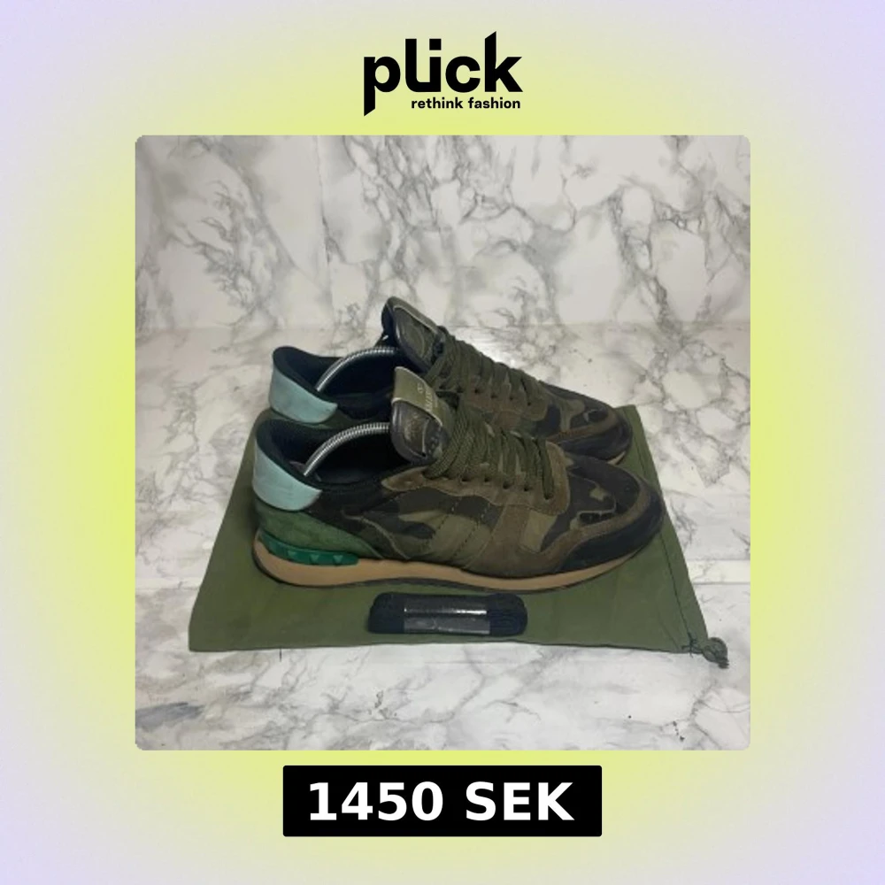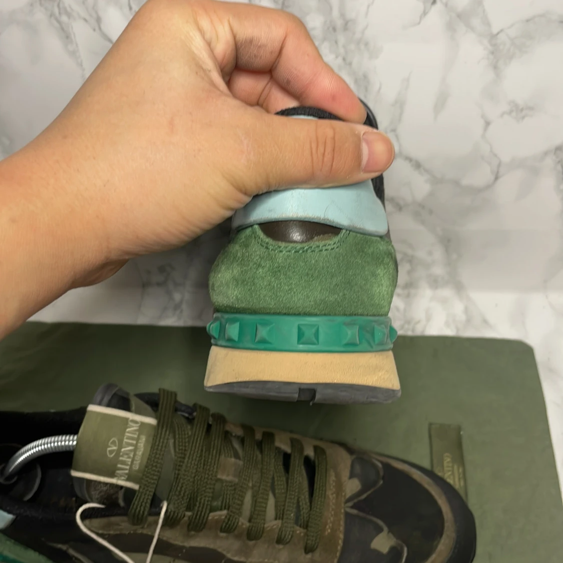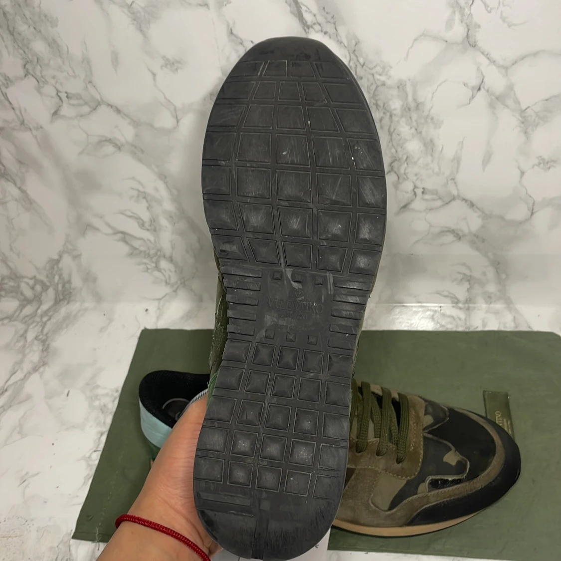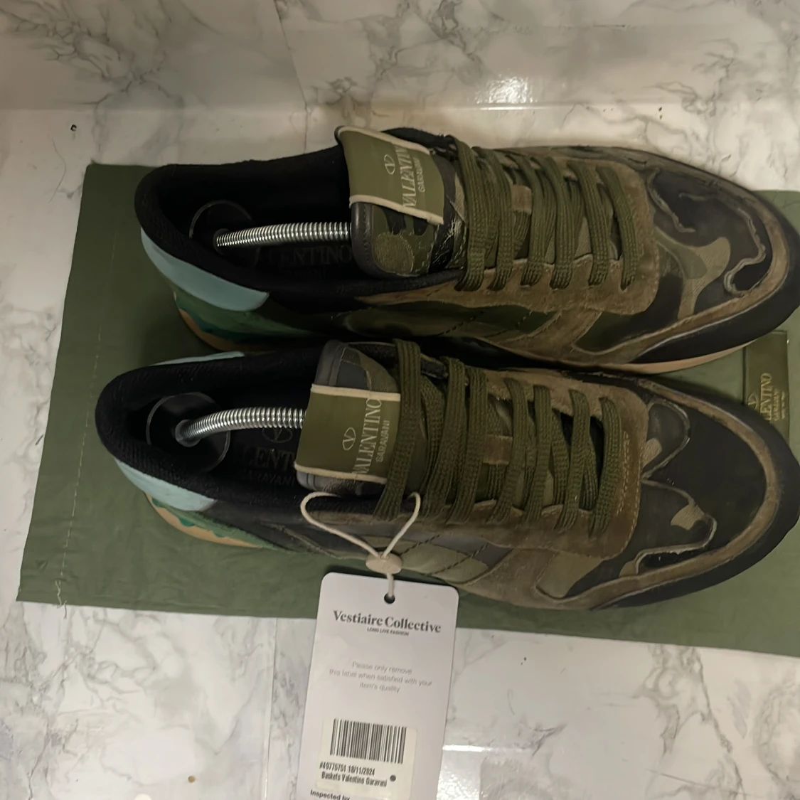 Snygga Valentino Rockrunner i storlek 40.5 passar 41 och 40 sneakers med ett coolt camouflagemönster. Skorna är i bra skick har en unik kombination av gröna och blå nyanser med en stilren snörning. De är tillverkade i en mix av mocka och syntetmaterial, vilket ger en lyxig känsla.