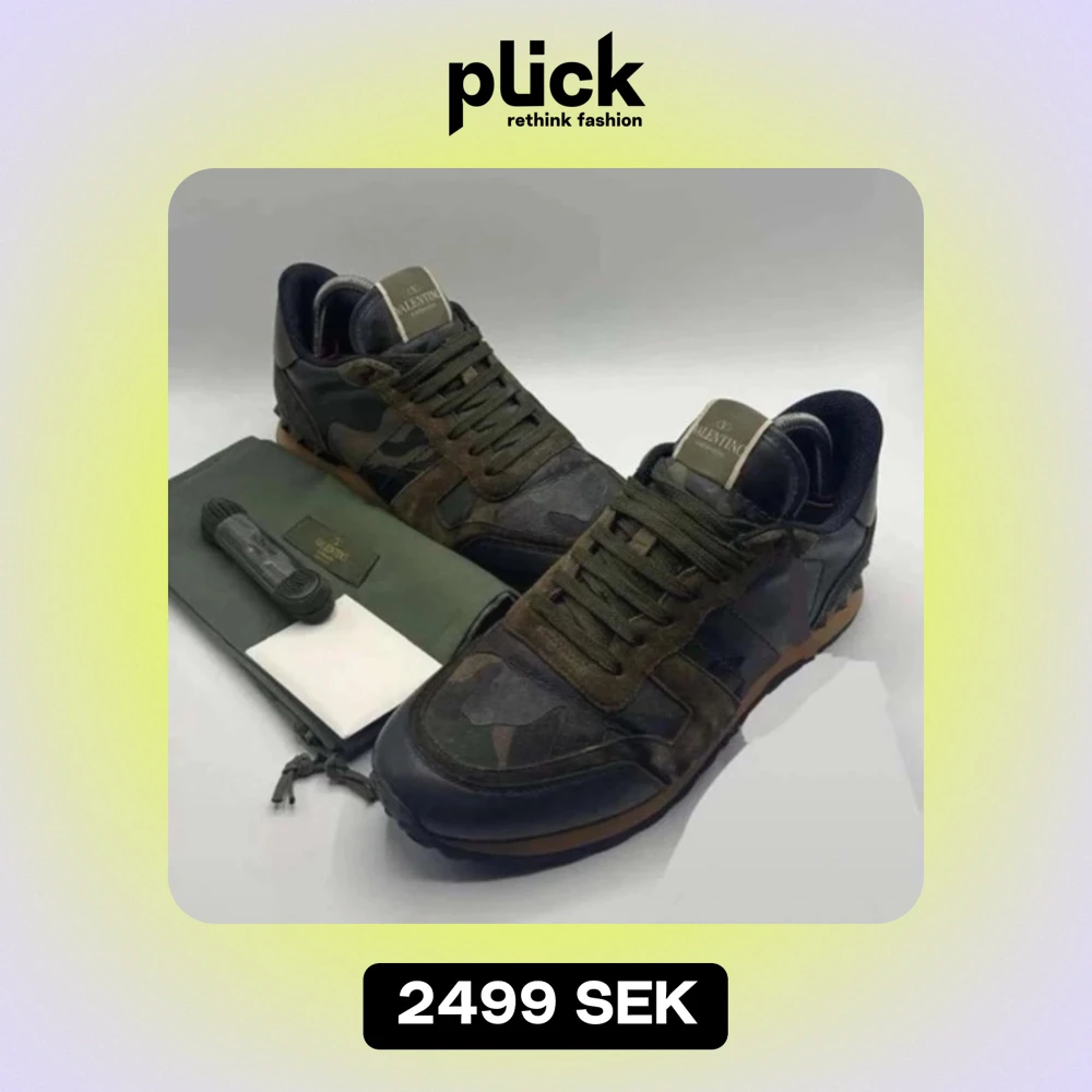 Säljer ett par snygga Valentino Rockrunner sneakers i camouflage. De har en cool design med snörning och är gjorda i skinn och syntet. Perfekta för att ge din outfit en edgy touch. Skorna är i mycket bra skick och redo för nya äventyr! Storlek 42. Allt förutom låda medföljer!
