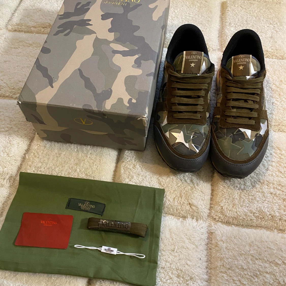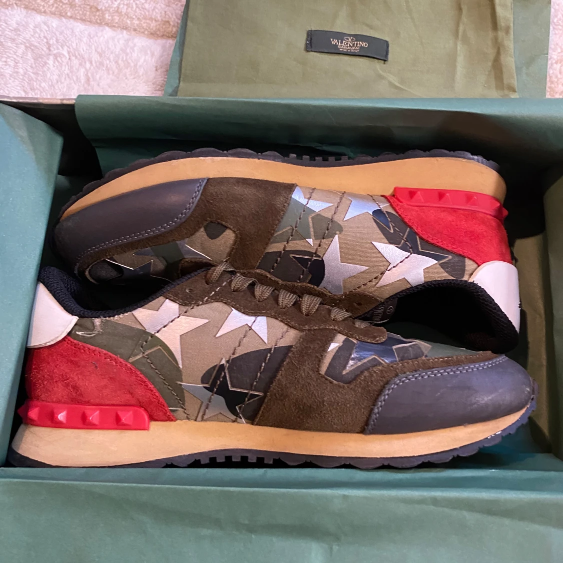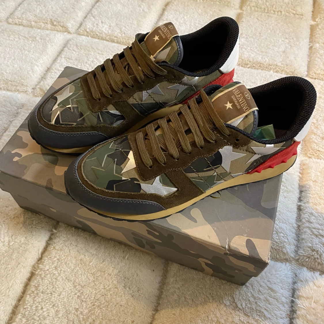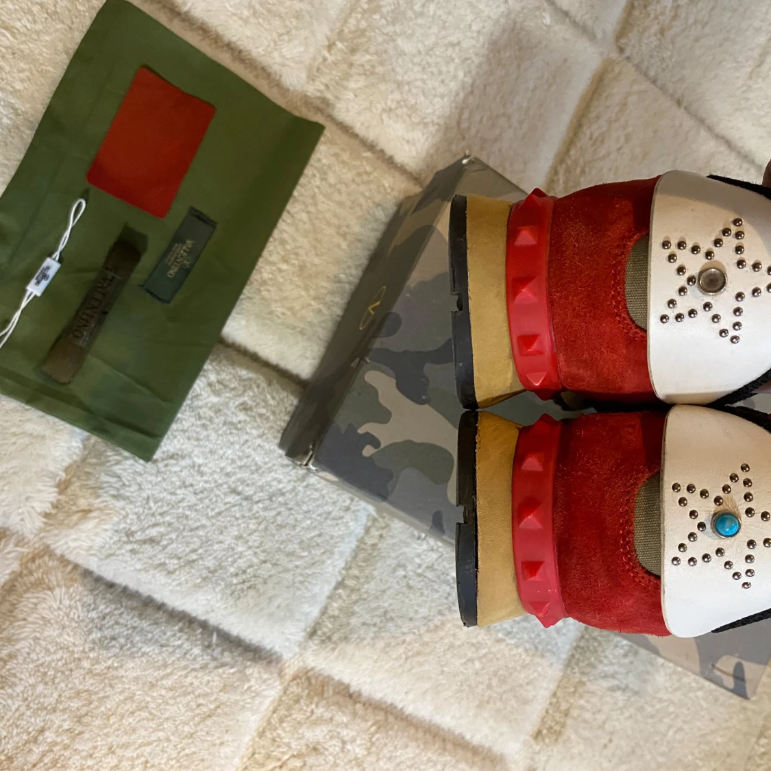 Ett par eftertraktade Valentino rockrunners i Cammofärg/grön med röda taggar. Super bra skick, nästan nya. Bortsätt från en blå plutt som saknas( 4de bilden ). Storlek 44 passar även 43. Nypris på dessa ligger på 7000kr. Allt og. För mer info fråga🤗//mvh