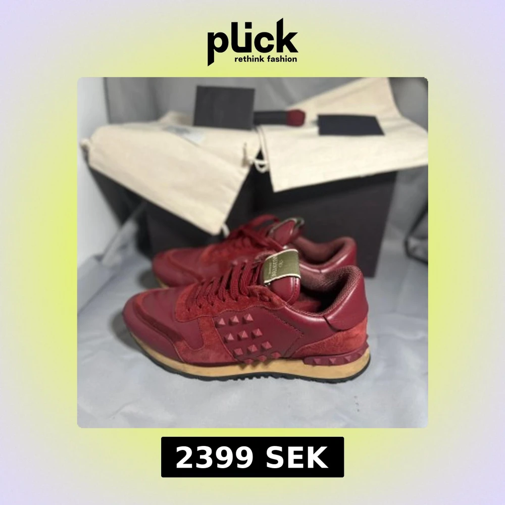 Säljer ett par Valentino Rockrunner sneakers i mörkröd färg med coola nitar på sidan. Skorna har en mix av skinn och mocka, snörning och platt sula. Märkeslogga på tungan i guld. Perfekt för dig som gillar lyxiga och unika sneakers med attityd.