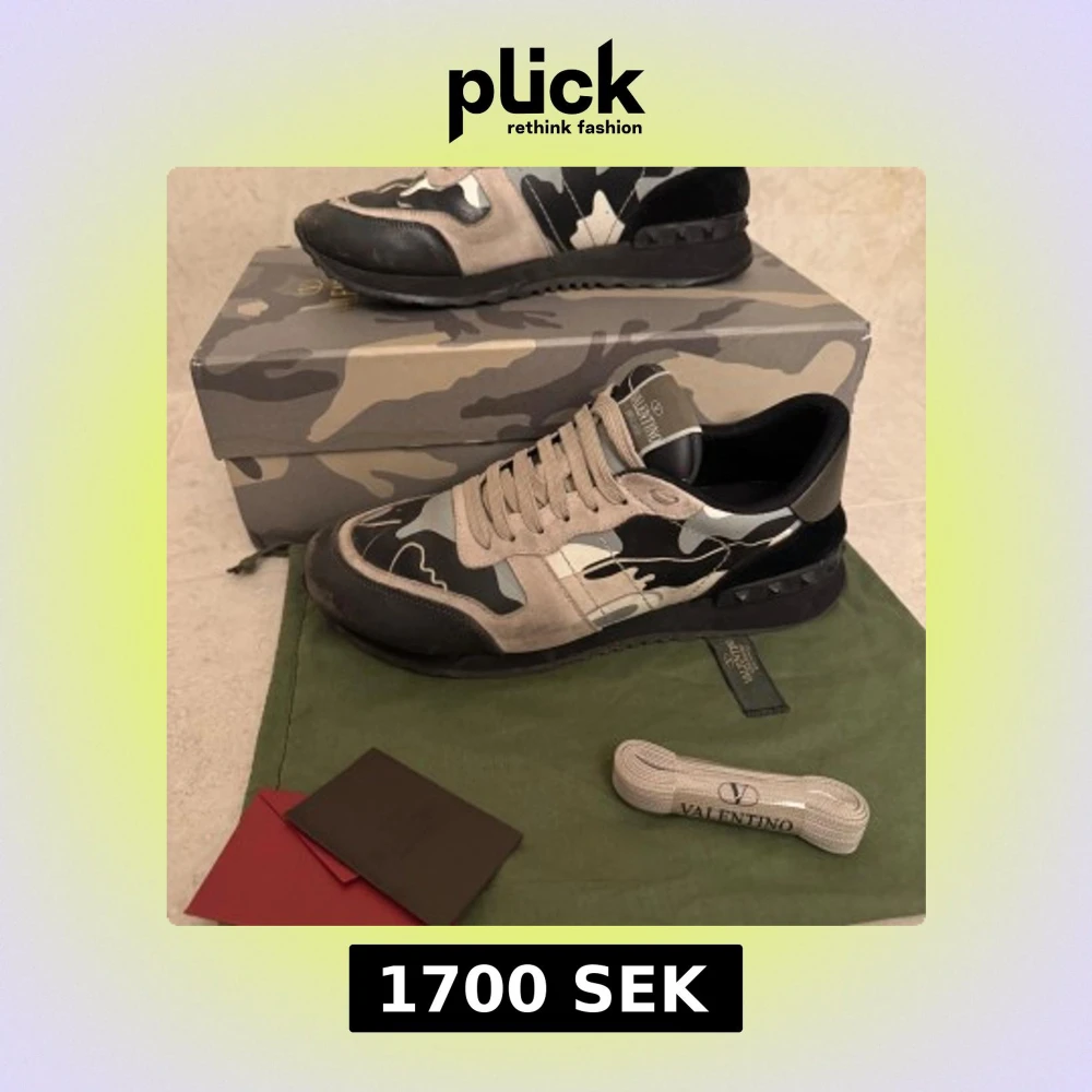 Snygga Valentino Rockrunner sneakers med grå, svarta och beige camouflagepaneler i mocka, skinn och textil. Klassisk snörning, svarta nitar på hälen och rund tå. Kommer med originalkartong, dustbag och extra skosnören. Perfekta för dig som vill sticka ut med lyxig streetstyle.