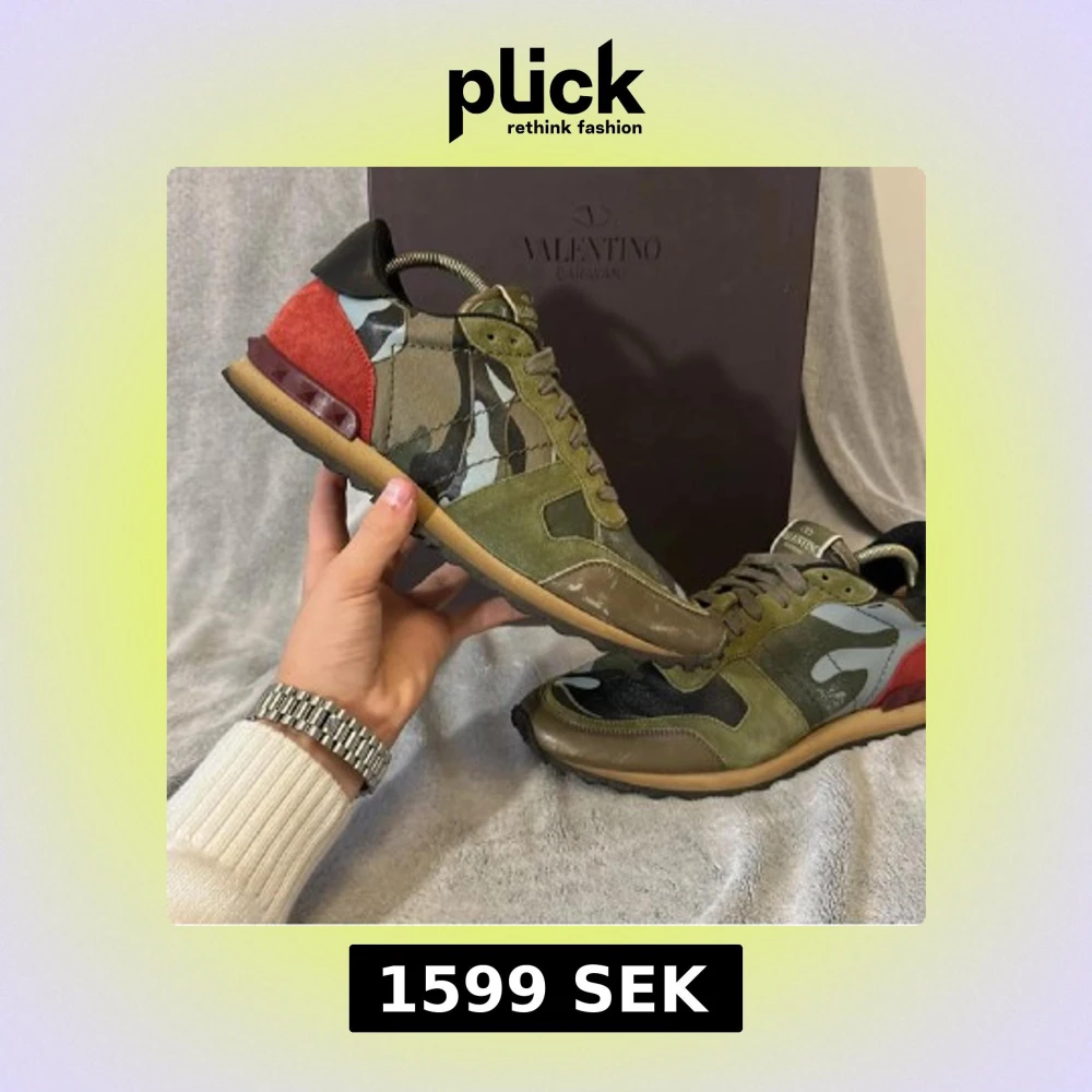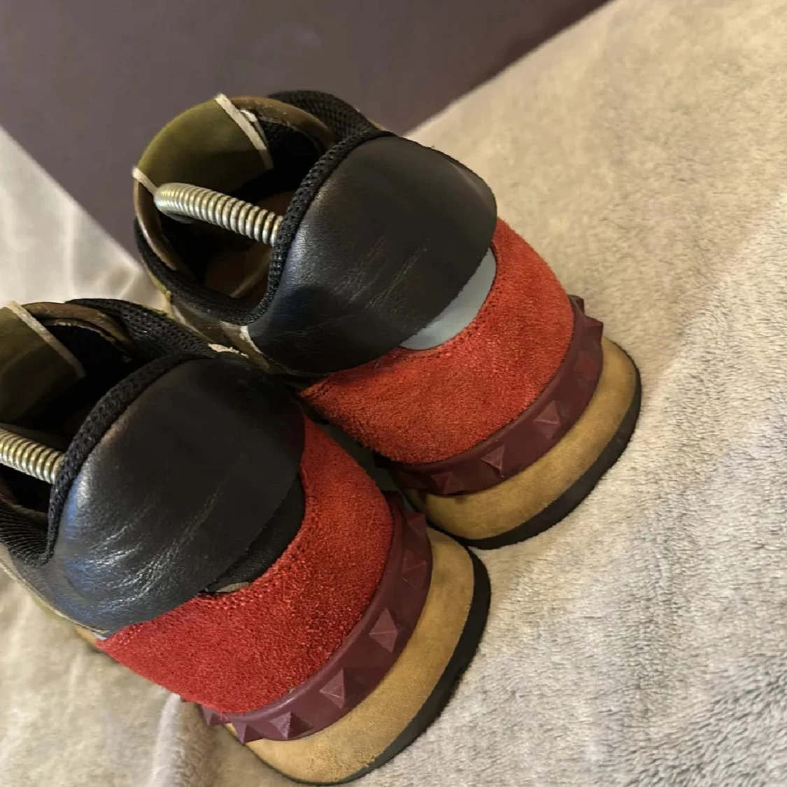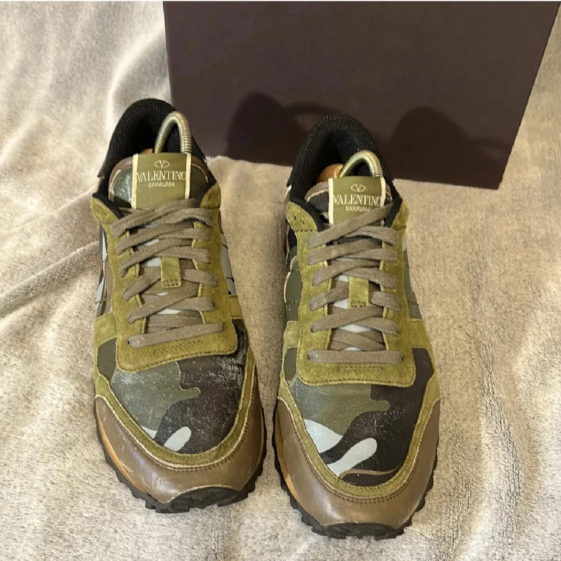 Snygga Valentino Rockrunner sneakers med camouflage-mönster i grönt, brunt och svart. Skorna har röda mockadetaljer vid hälen, svarta och olivgröna partier samt coola nitar på sulan. Materialmix av mocka, skinn och textil. Perfekta för dig som vill sticka ut med exklusiva sneakers.