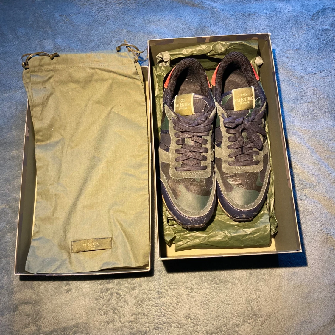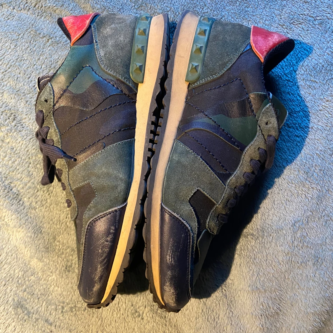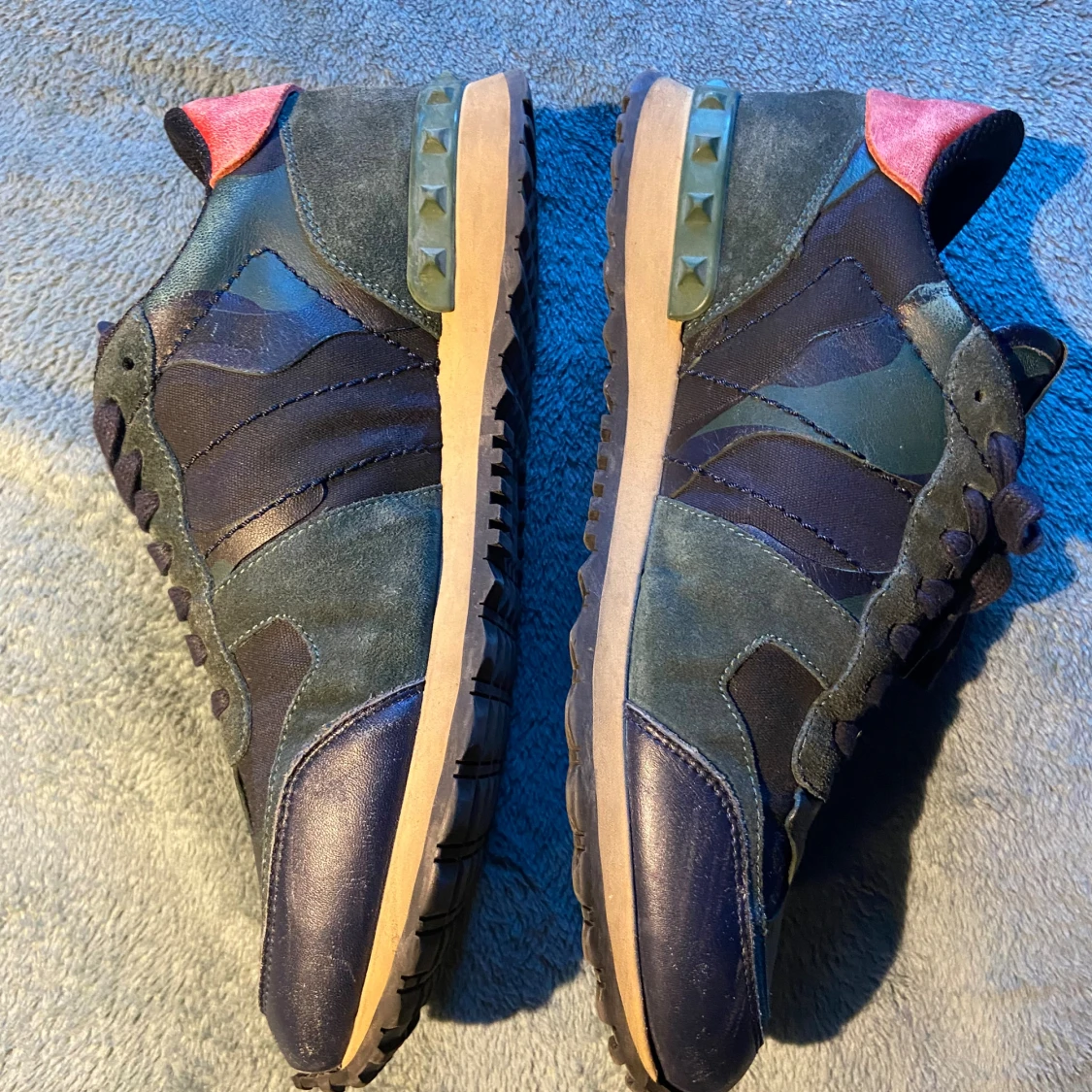 Snygga Valentino Rockrunner sneakers i mörkblått och grönt med camouflage-mönster. Skorna har detaljer i mocka och skinn, klassisk snörning och coola nitar på hälen. Perfekta för dig som vill sticka ut med exklusiva och trendiga sneakers.