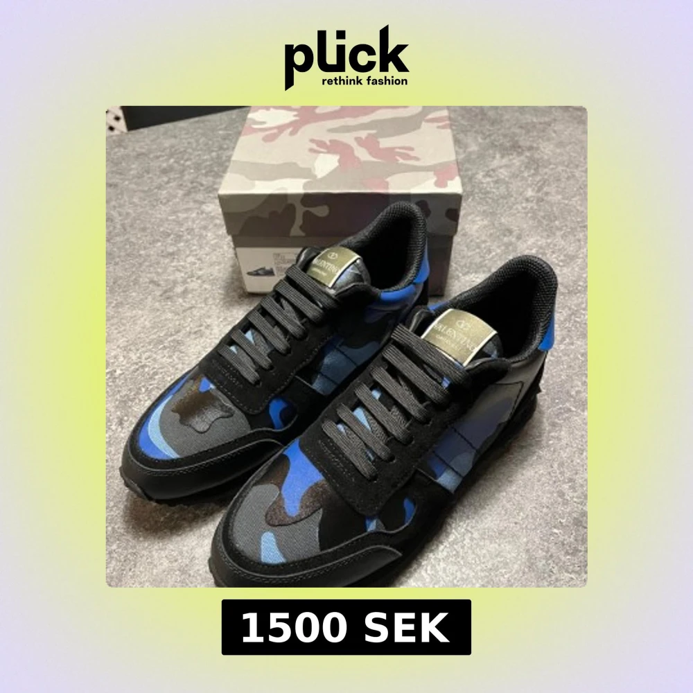 Snygga Valentino Rockrunner sneakers med ett coolt blått och svart camouflagemönster. Skorna har snörning och en rund tå, vilket ger en bekväm passform. Perfekta för att ge din outfit en unik touch. Använda max 3 gånger.