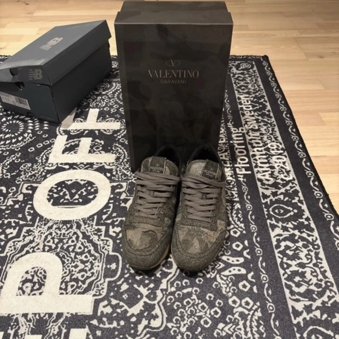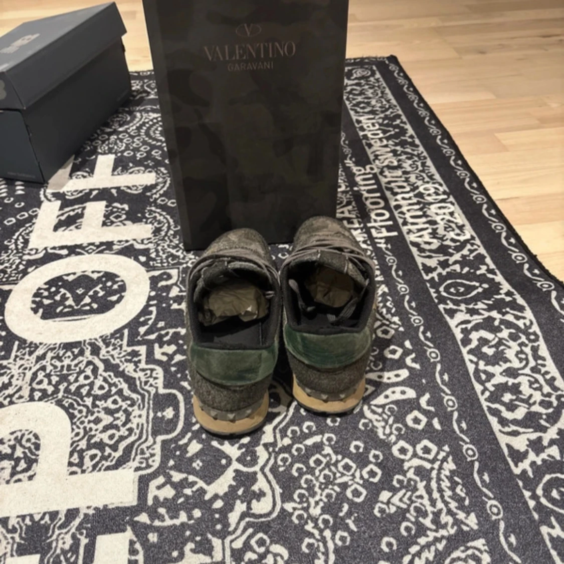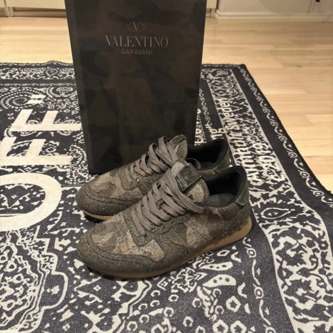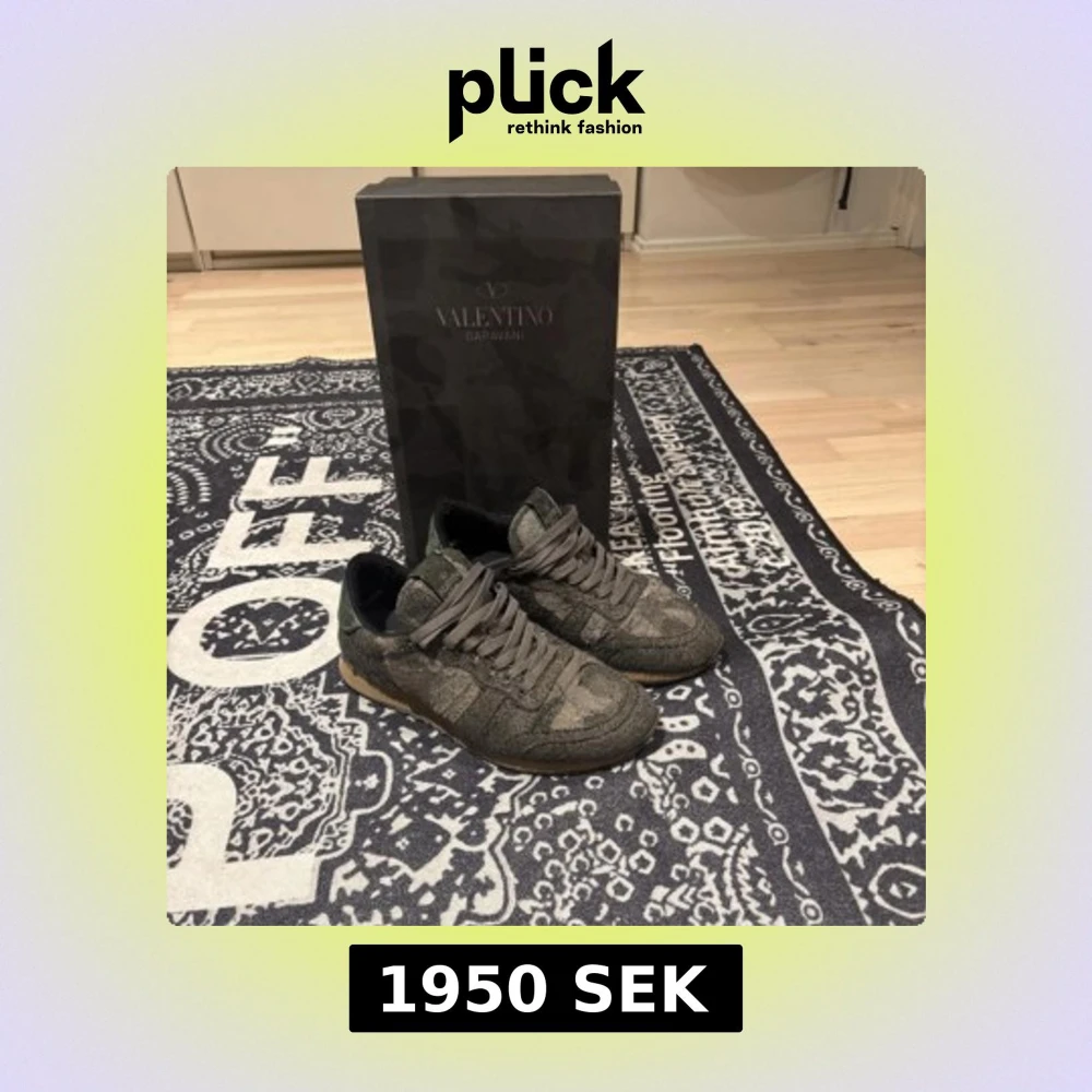 Säljer ett par Valentino Rockrunner sneakers i grön och brun camouflage med snörning och gummisula. Skorna har klassisk rund tå och är tillverkade i en mix av mocka och skinn. Perfekta för dig som vill ha något unikt och stilrent från Valentino Garavani.