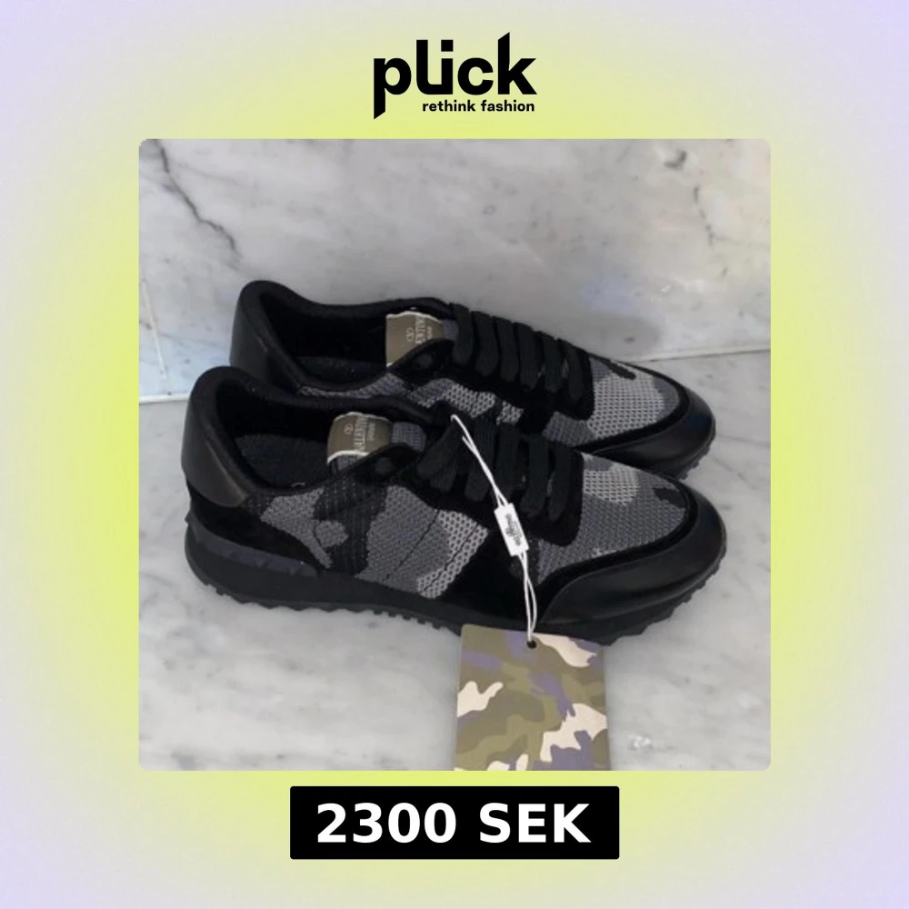 Säljer ett par Valentino Rockrunner sneakers i svart och grått med camouflage-mönster. Skorna har svarta snören, rund tå och platt sula. Märkesdetalj på plösen och en cool, sportig look. Perfekta för dig som gillar exklusiva sneakers.