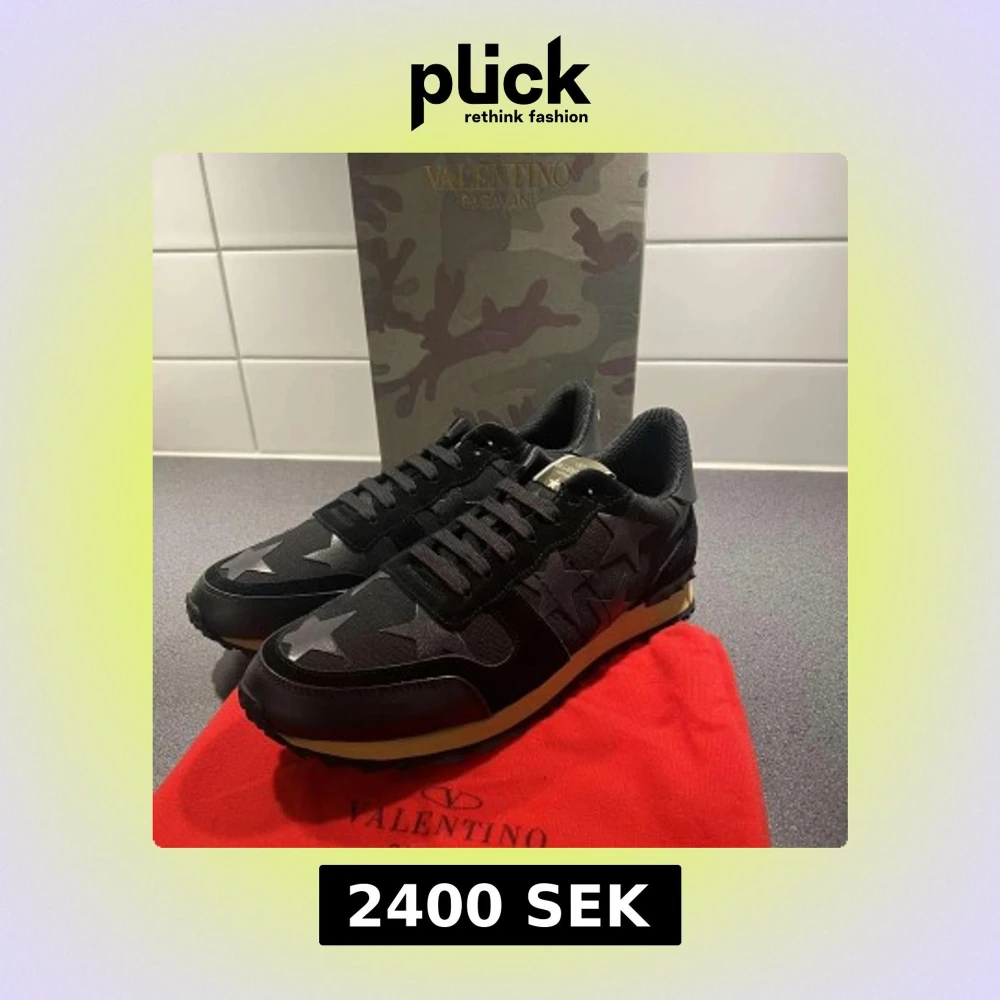Säljer ett par svarta Valentino Rockrunner sneakers med grått stjärnmönster. Skorna har svarta snören, rund tå och platt sula. Kommer med originalkartong och röd dustbag. Perfekta för dig som vill sticka ut med exklusiva detaljer. BOX OCH KVITTO!