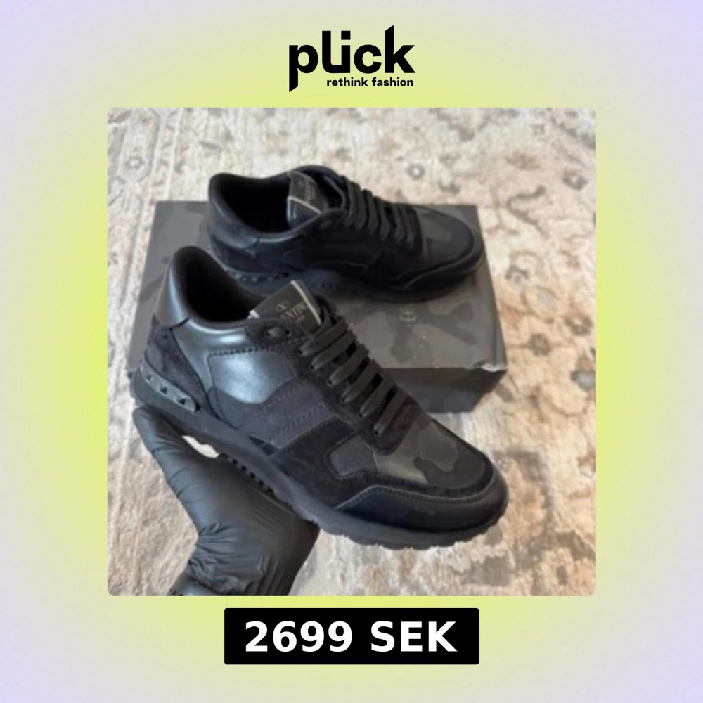 Svarta Valentino Rockrunner sneakers med nitar på hälen och snygga camouflagedetaljer. Skorna har en mix av skinn och mocka, platt sula och snörning. Helt nytt skick i storlek 43 för endast 2699kr. De kommer också med originalboxen.