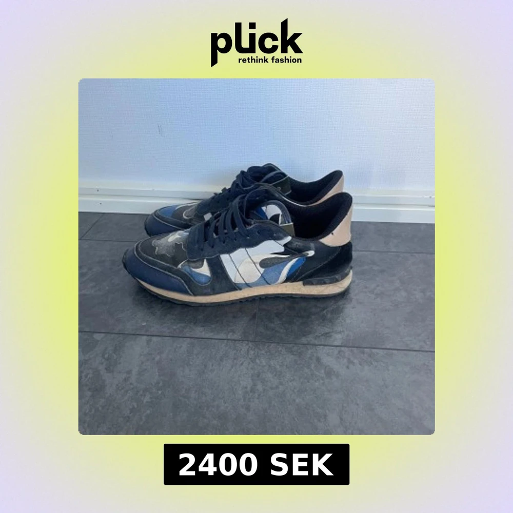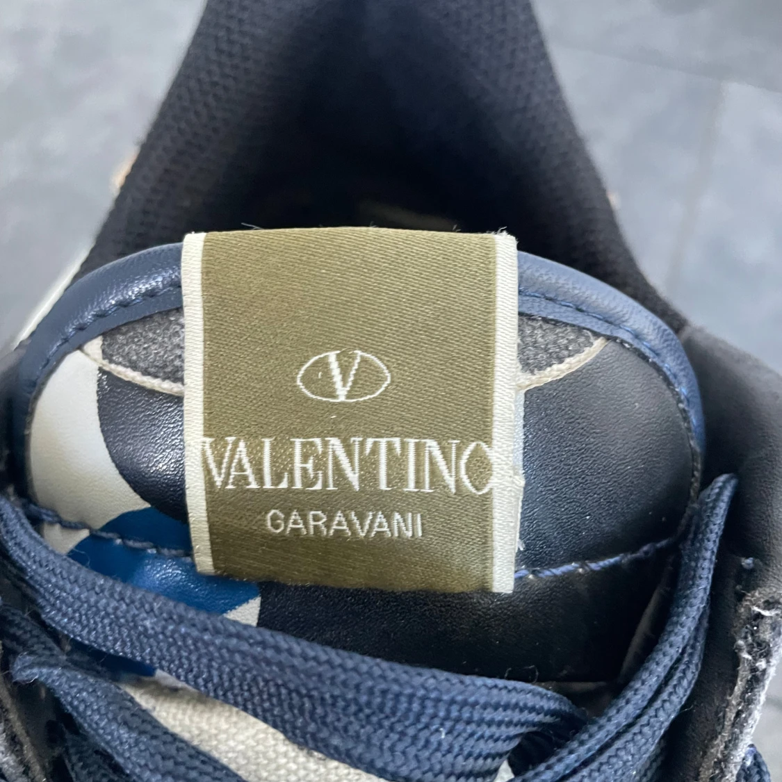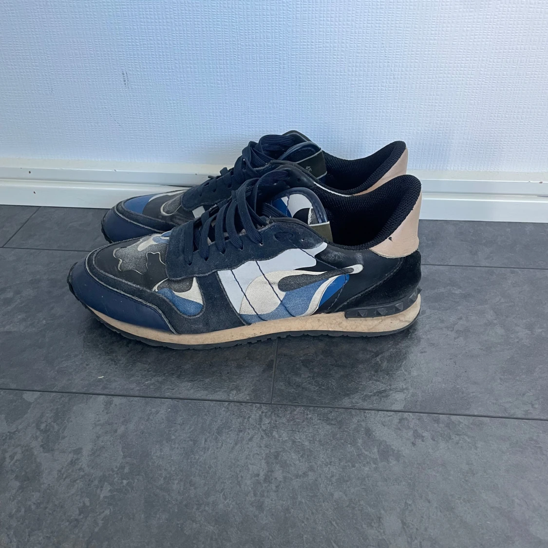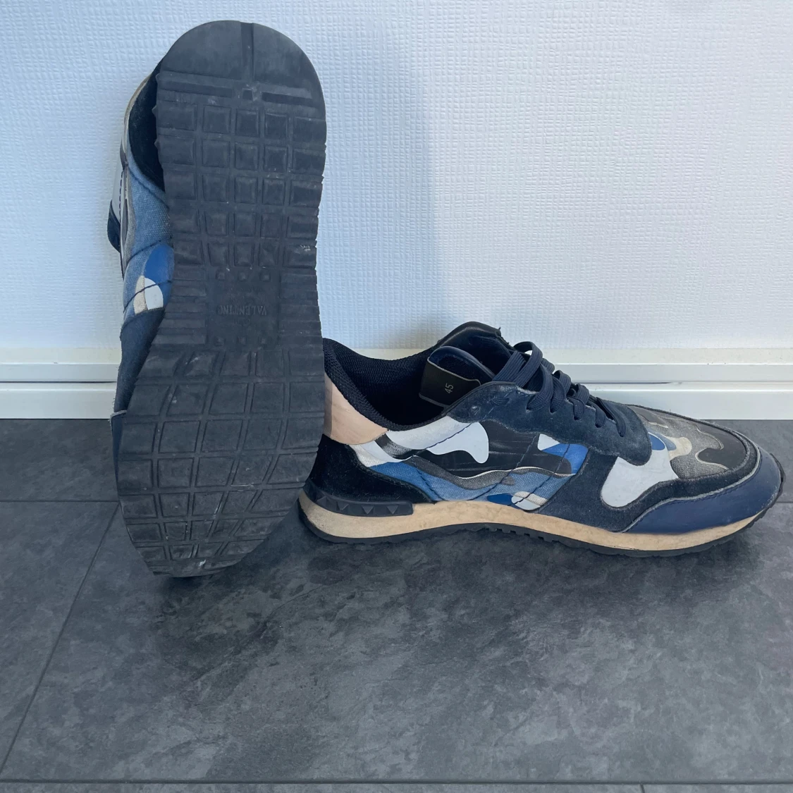 Snygga sneakers från Valentino Garavani med blå, svarta och vita camouflage-detaljer. Skorna har snörning, platt sula och rund tå. Tillverkade i en mix av skinn och textil för en lyxig känsla. Perfekta för dig som vill sticka ut med en unik design.