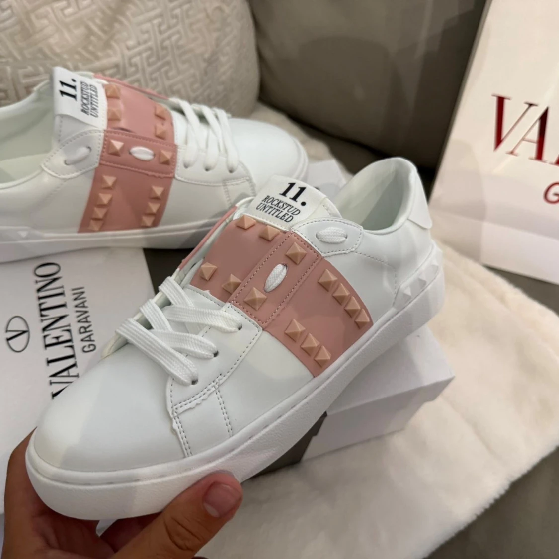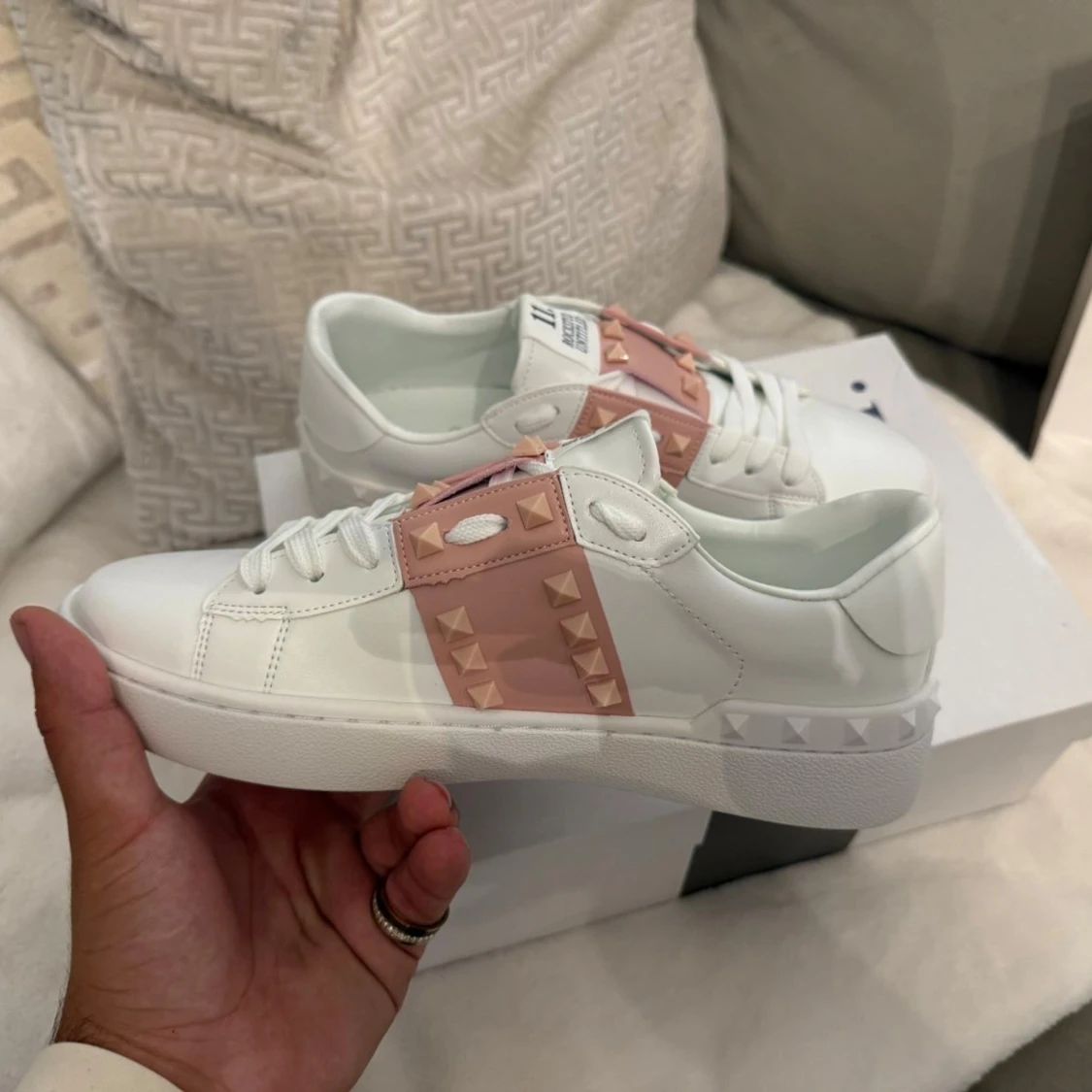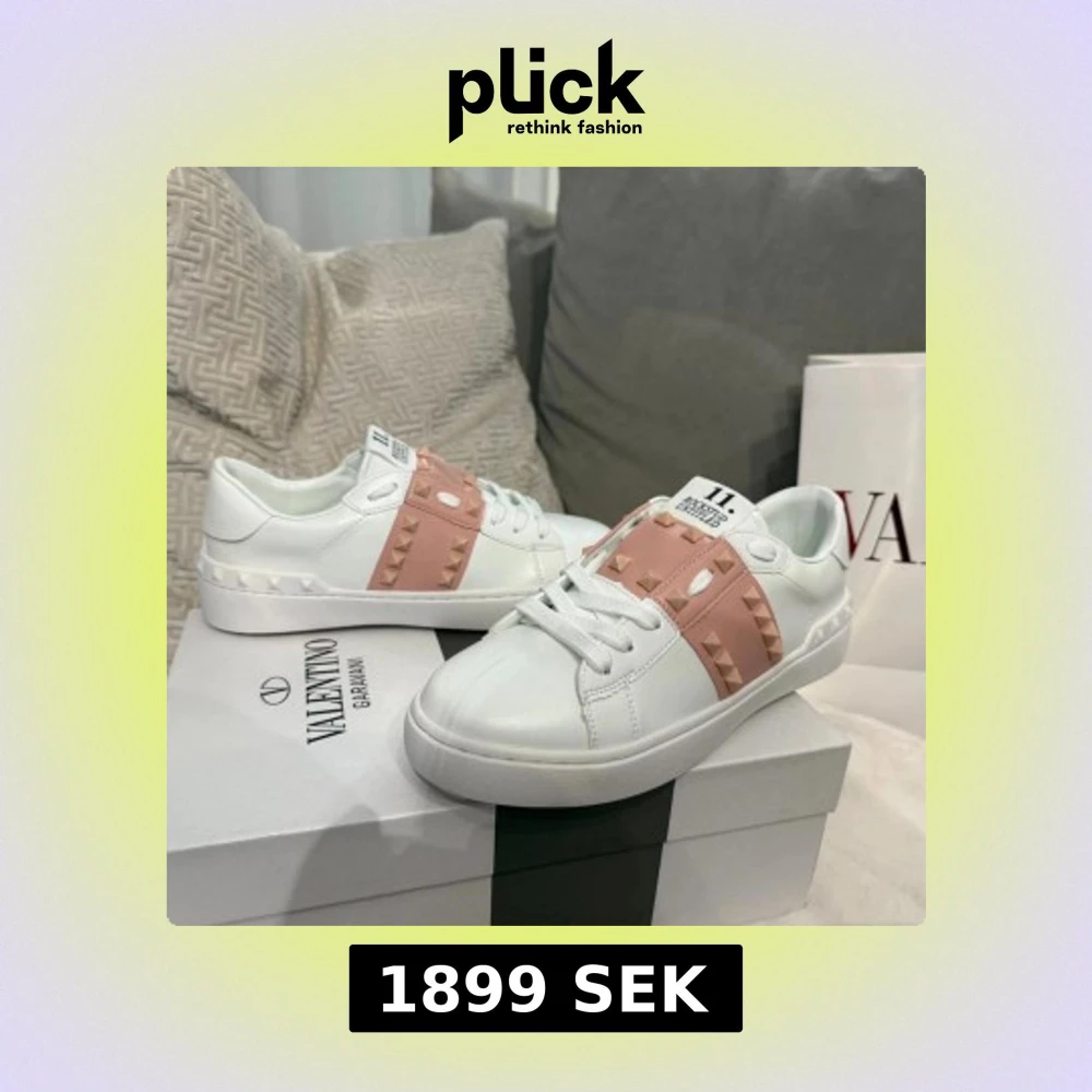 Snygga Valentino Rockstud Open sneakers i vitt skinn med breda ljusrosa band och ikoniska nitar. Klassisk rund tå, platt sula och vita snören. Perfekta för dig som vill sticka ut med en lyxig och trendig look.