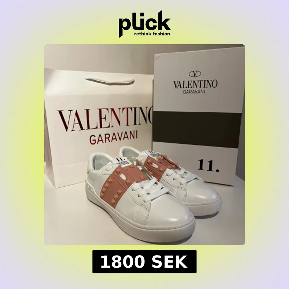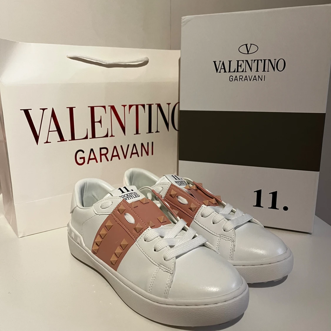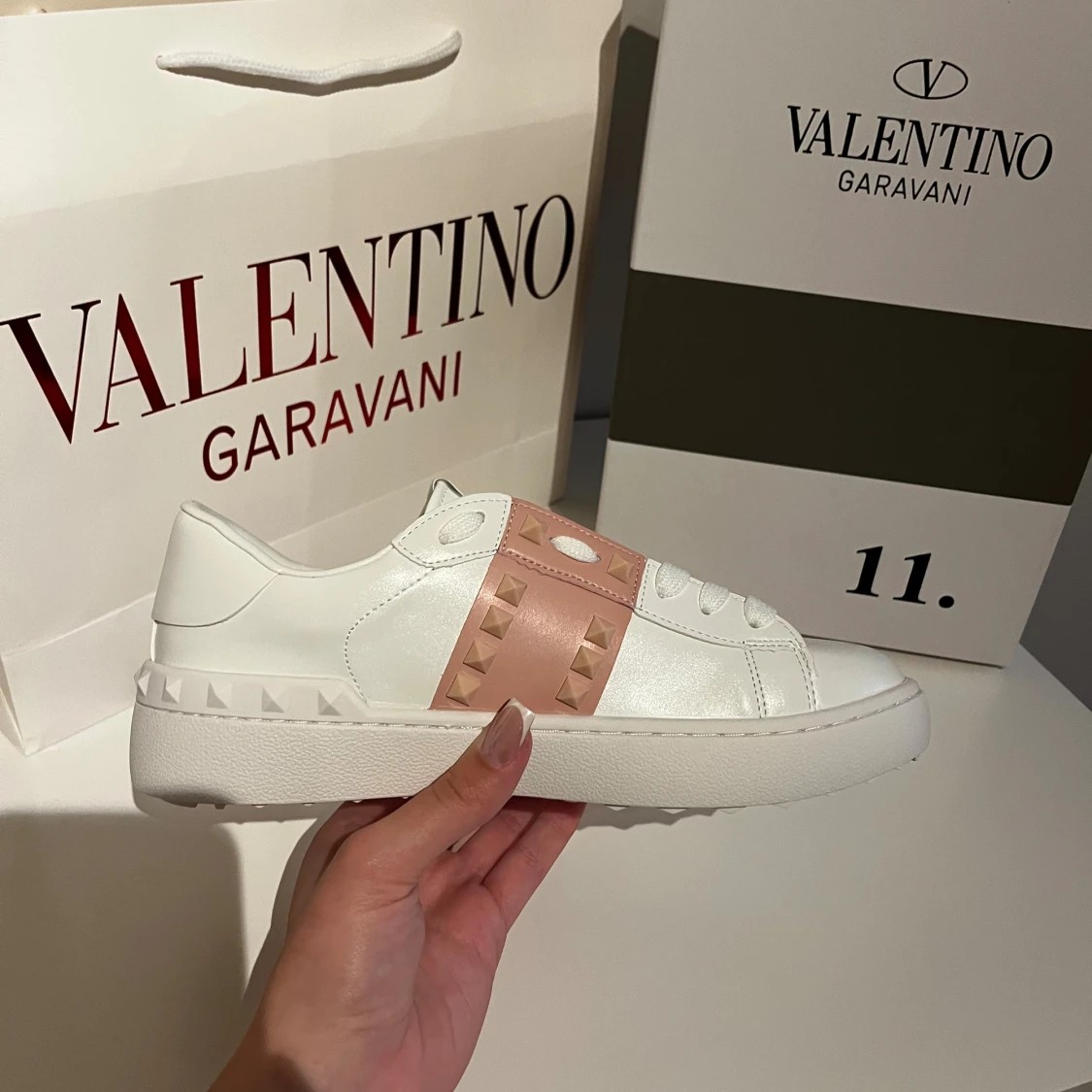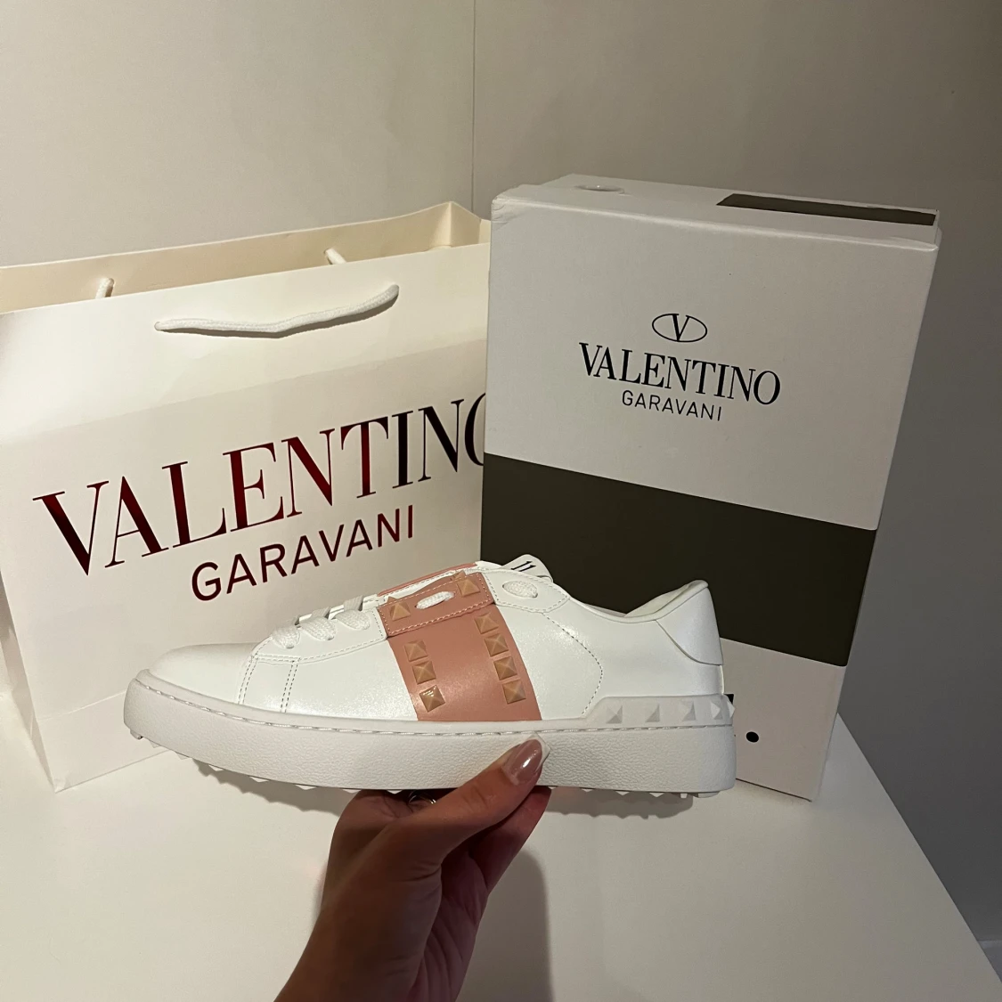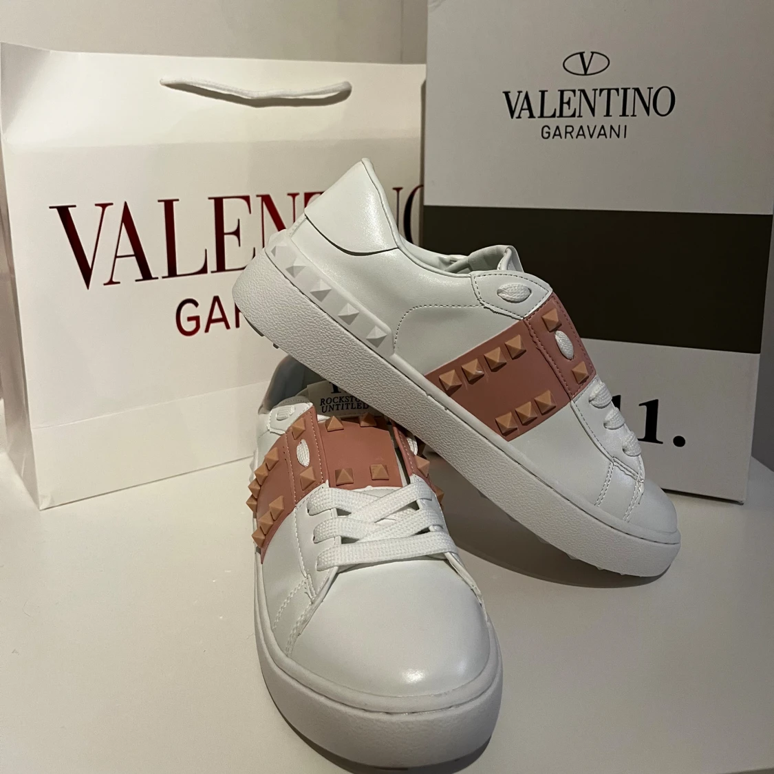 Snygga Valentino Garavani skor i vitt skinn med breda ljusrosa band och ikoniska nitar. Klassisk rund tå, platt sula och vita snören. Perfekta för dig som vill ha en lyxig och trendig look med extra edge.