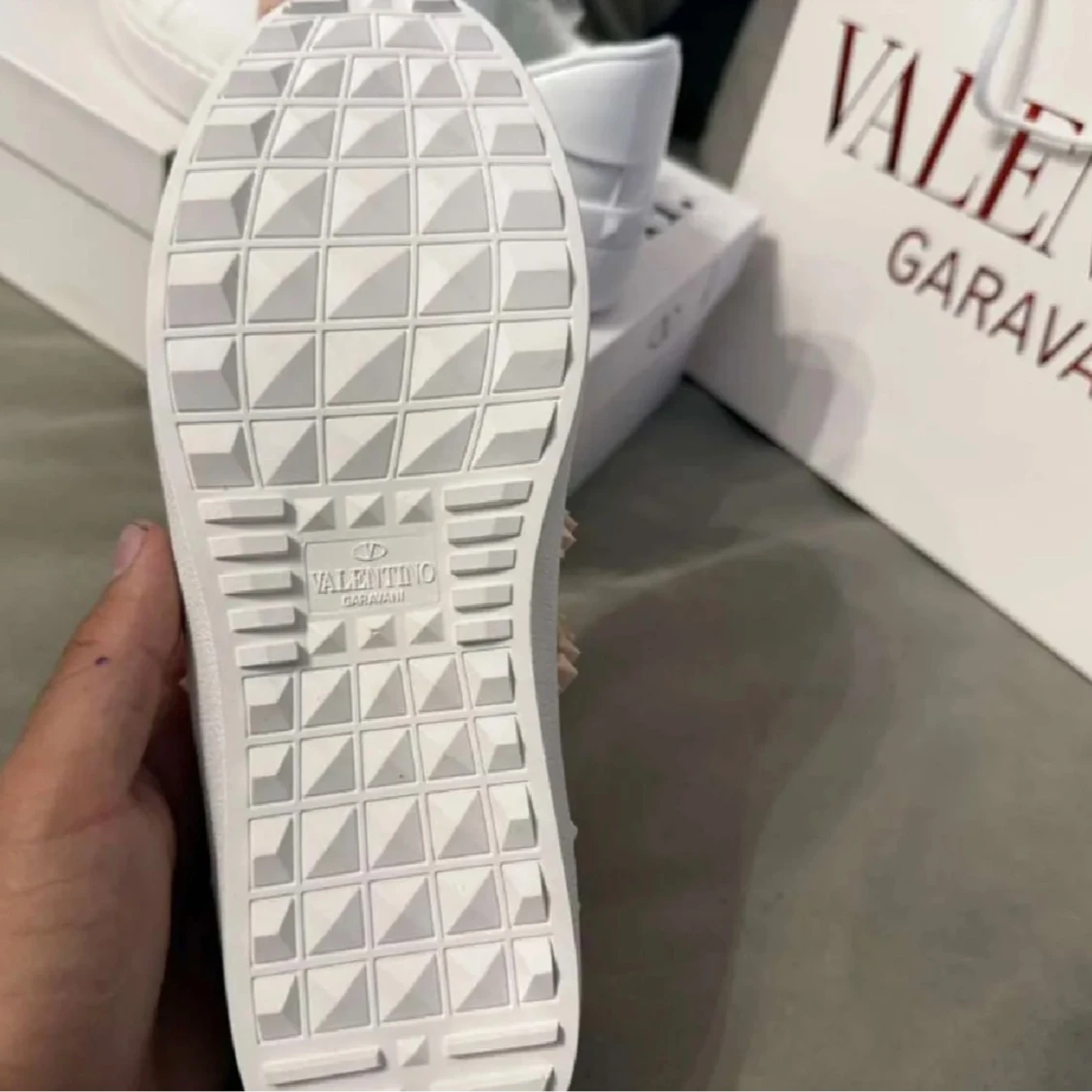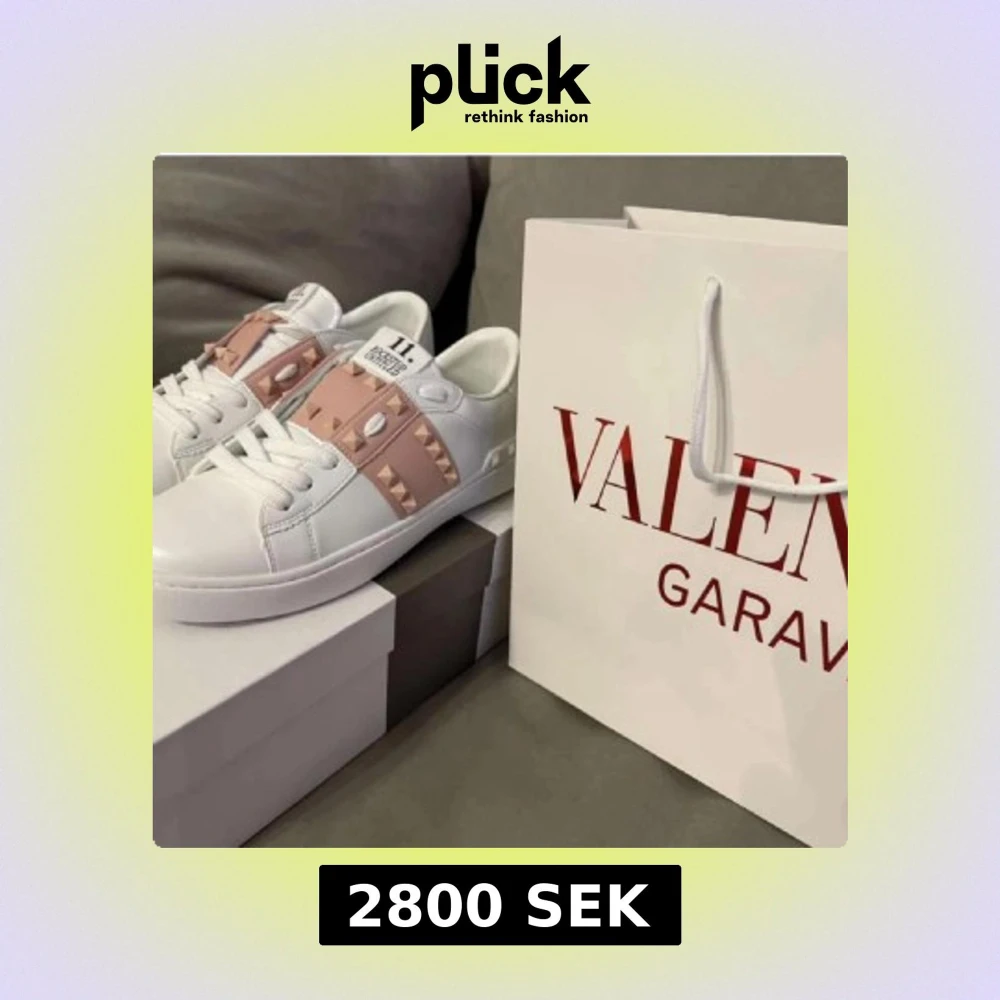 Säljer ett par Valentino Garavani Rockstud sneakers i vitt skinn med ljusrosa band och ikoniska nitar. Klassisk rund tå, snörning och platt sula. Märkeslogga på plös och sula. Snygg och edgy detalj till din outfit.