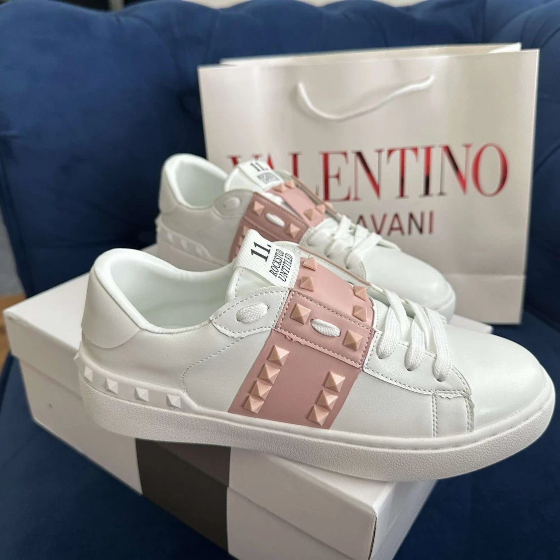 Snygga Valentino Garavani Rockstud sneakers i vitt skinn med ljusrosa detaljer och ikoniska nitar. Klassisk rund tå, platt sula och snörning framtill. Perfekta för dig som vill sticka ut med exklusiv streetstyle.