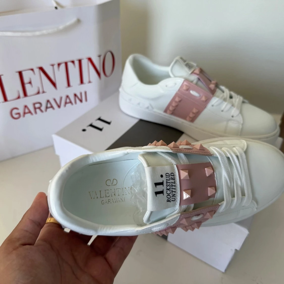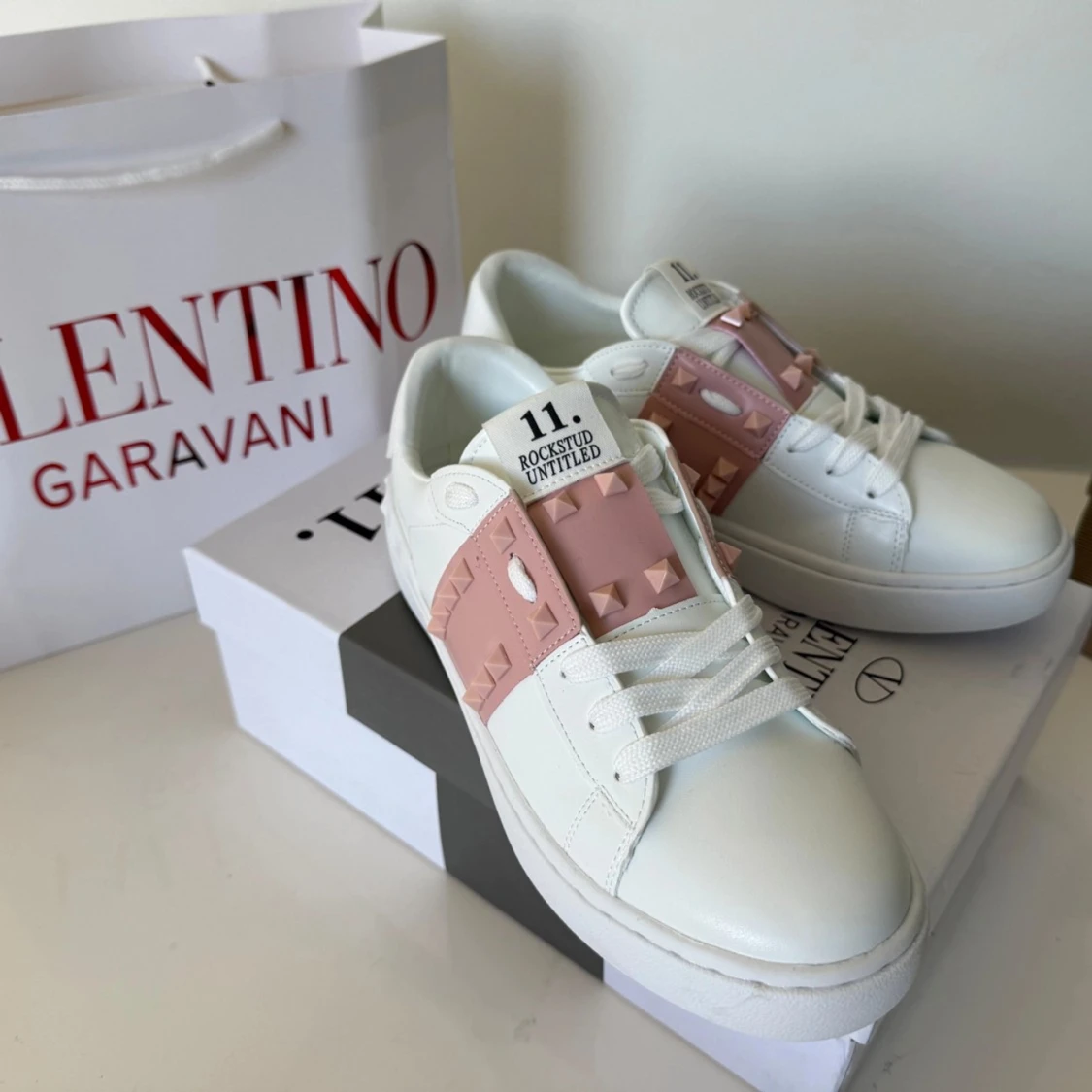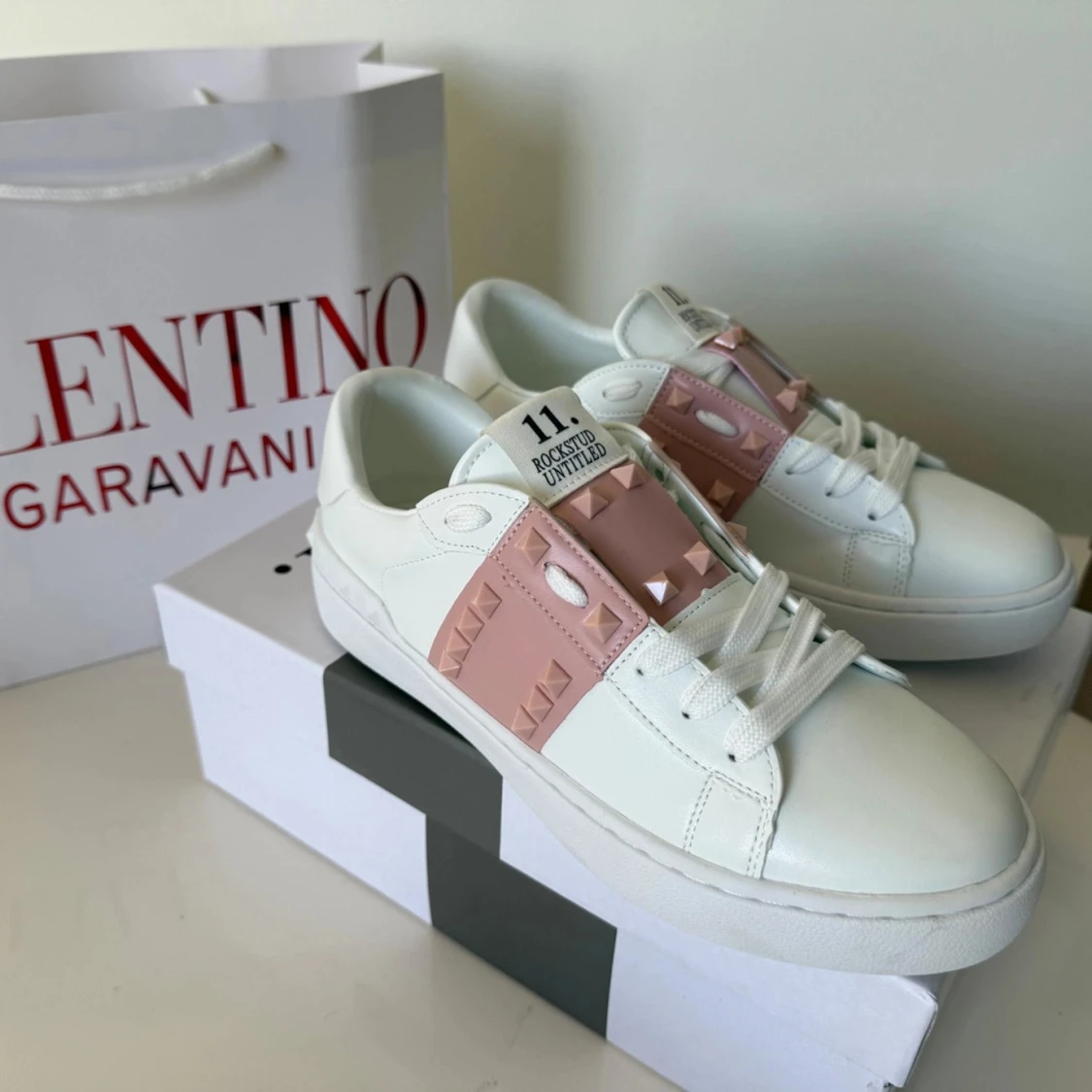 Snygga Valentino Garavani Rockstud Untitled sneakers i vitt skinn med ljusrosa band och ikoniska nitar över vristen. Rund tå, platt sula och vita snören. Perfekt för dig som gillar lyxiga detaljer och vill sticka ut med en unik design.