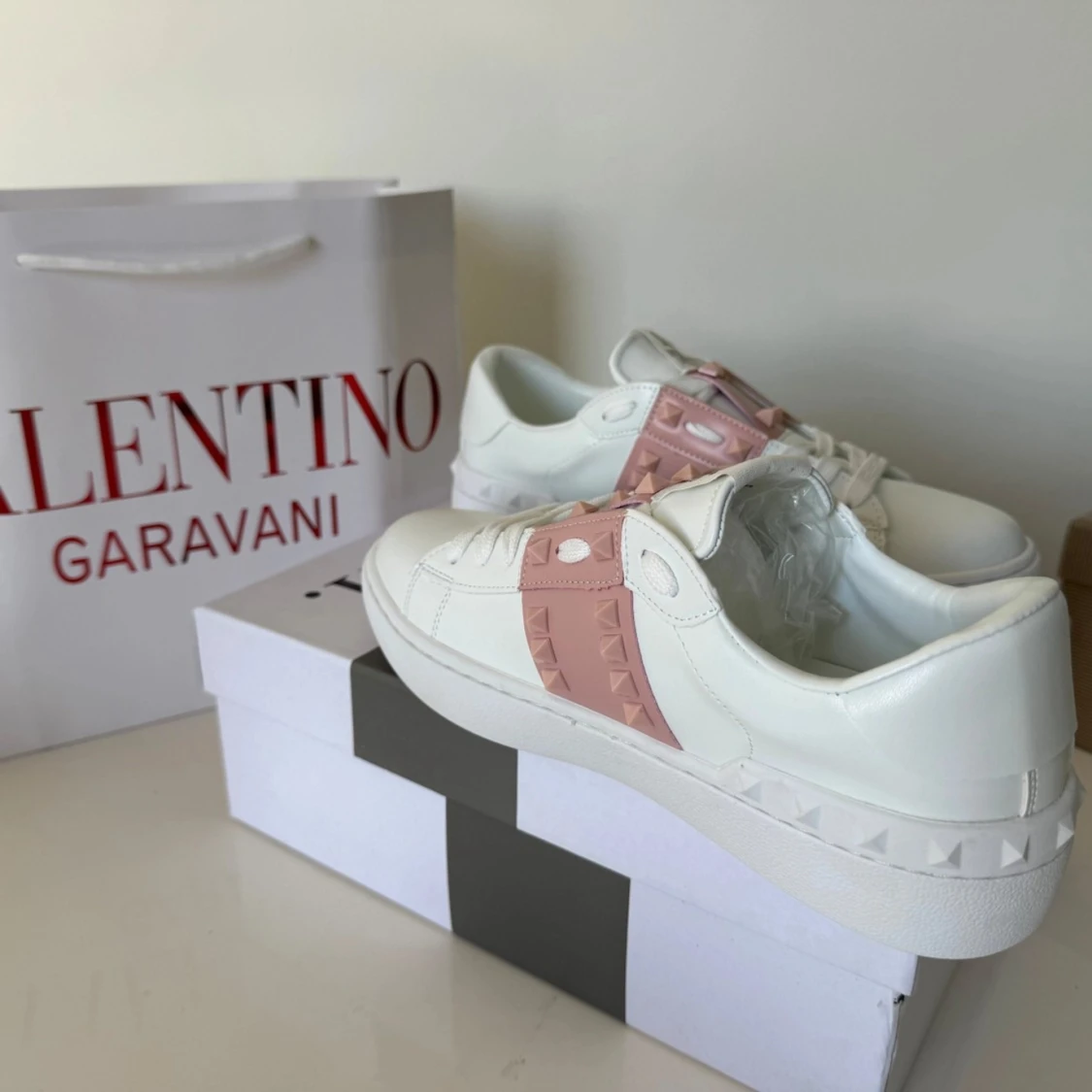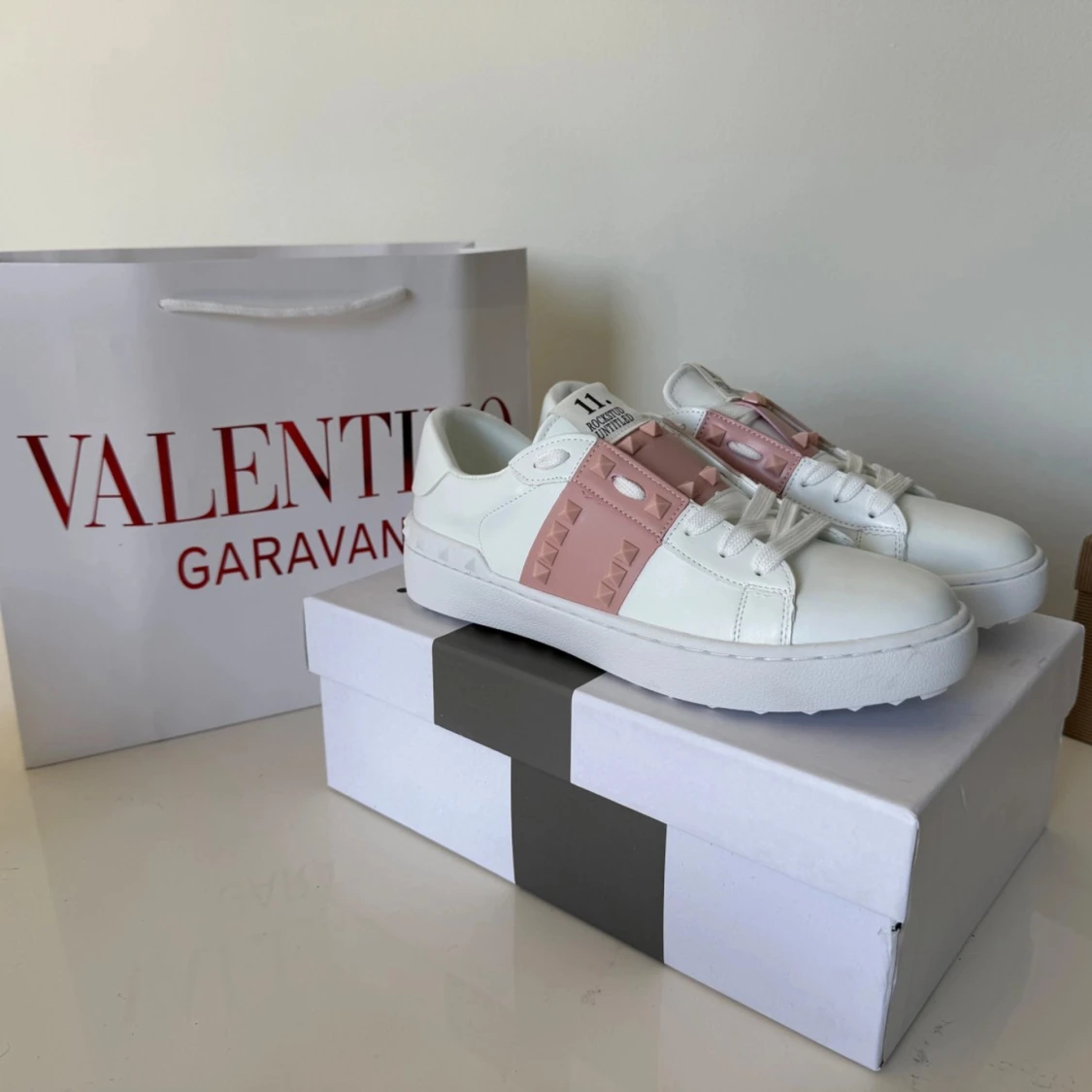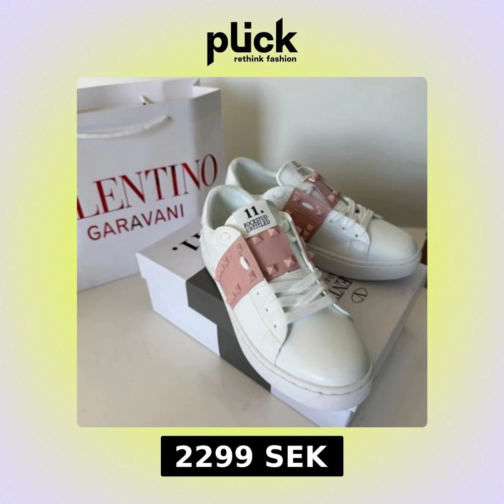 Snygga Valentino Garavani Rockstud Untitled sneakers i vitt skinn med ljusrosa band och ikoniska nitar över vristen. Rund tå, platt sula och vita snören. Perfekt för dig som gillar lyxiga detaljer och vill sticka ut med en unik design.
