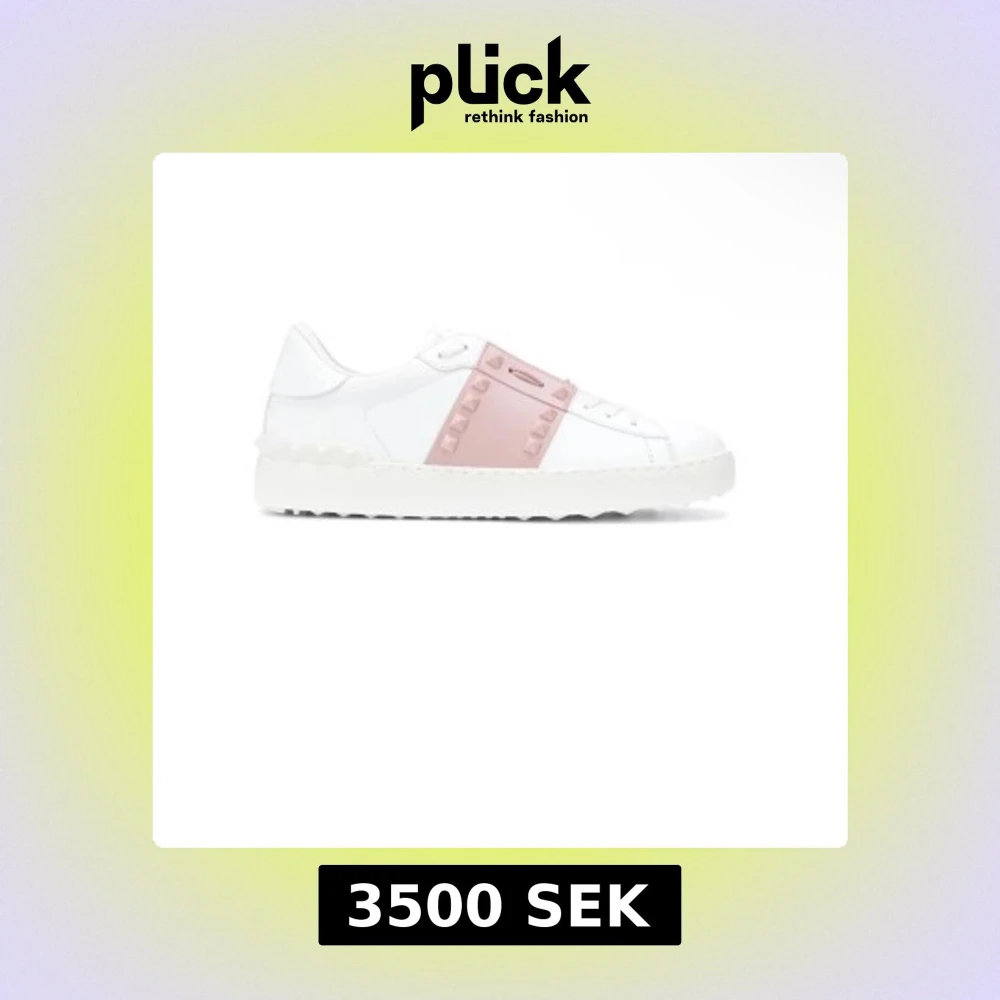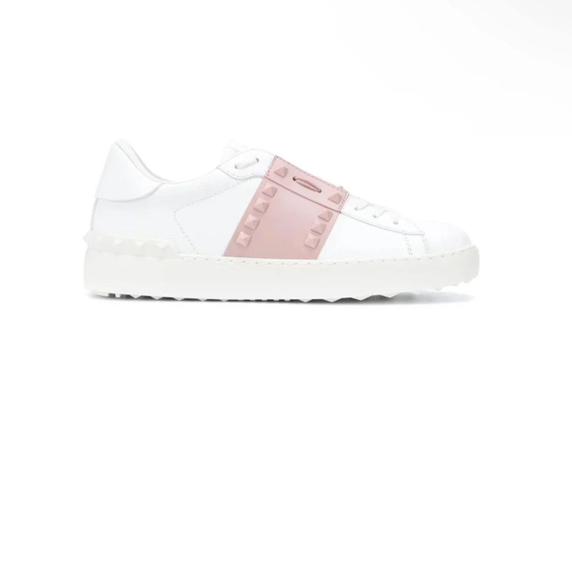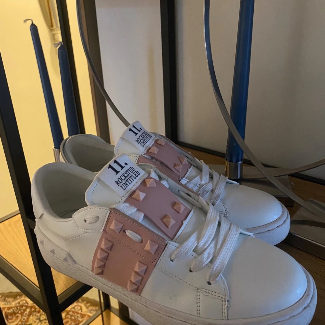 Snygga vita Valentino Rockstud sneakers med en ljusrosa rem över vristen dekorerad med ikoniska nitar. använda 2 gånger