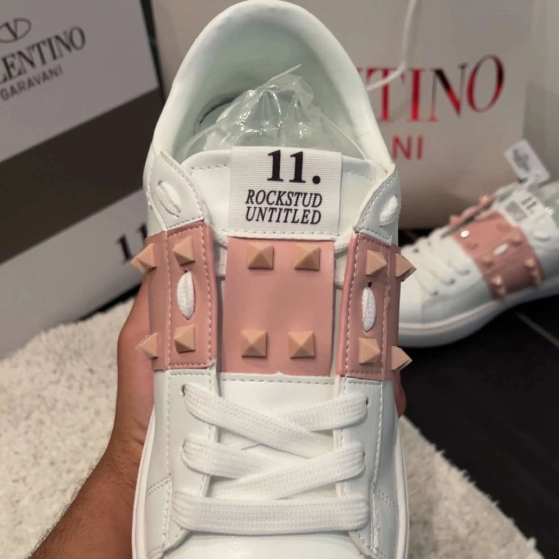 Säljer ett par Valentino Rockstud Untitled sneakers i vitt skinn med ljusrosa band och ikoniska pyramidnitar. Skorna har snörning, rund tå och platt sula. Perfekt för dig som vill ha en lyxig och edgy vibe i din stil. Kommer med originalkartong och påse.
