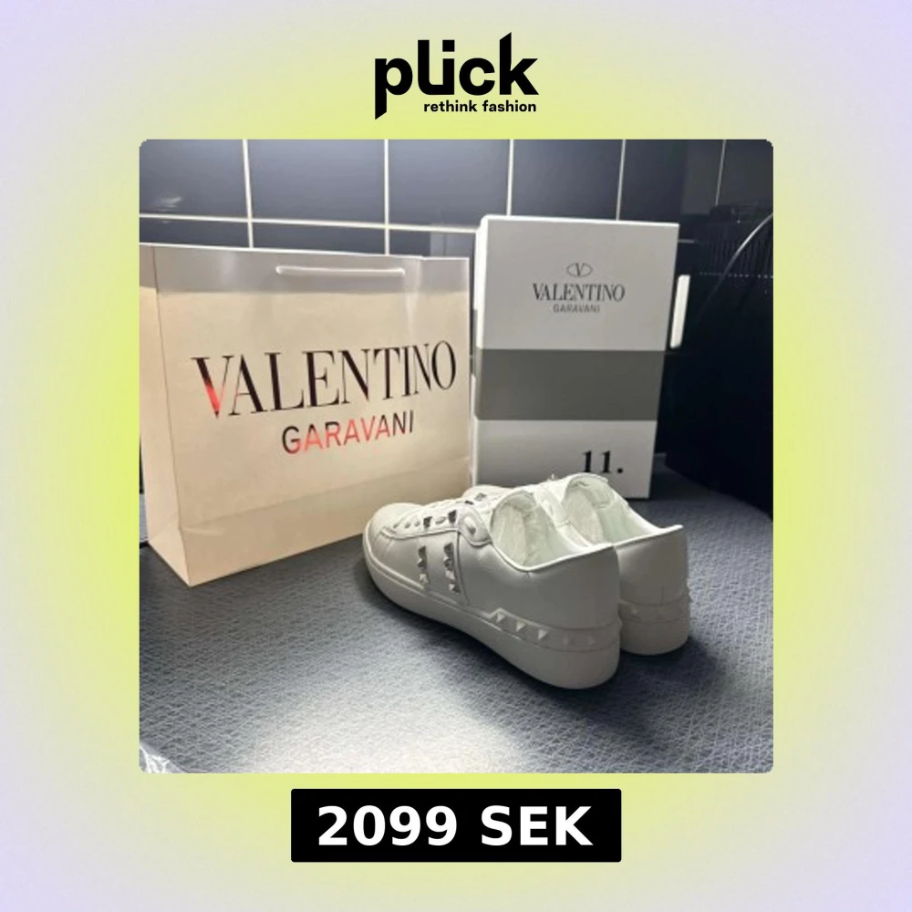 Snygga vita Valentino Garavani Rockstud sneakers i skinn med ikoniska silverfärgade nitar. Klassisk låg modell med rund tå, snörning och platt sula. Perfekta för dig som vill sticka ut med en lyxig och edgy vibe.