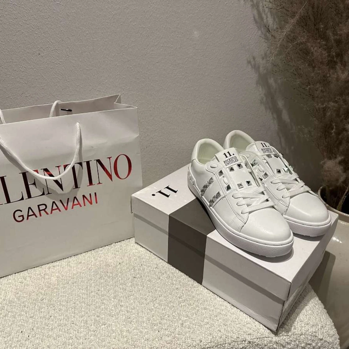 Snygga vita Valentino Garavani Rockstud sneakers i skinn med silverfärgade nitar och klassisk snörning. Skorna har en platt sula och coola detaljer längs sidorna och hälen. Perfekta för dig som vill sticka ut med en lyxig och edgy stil.